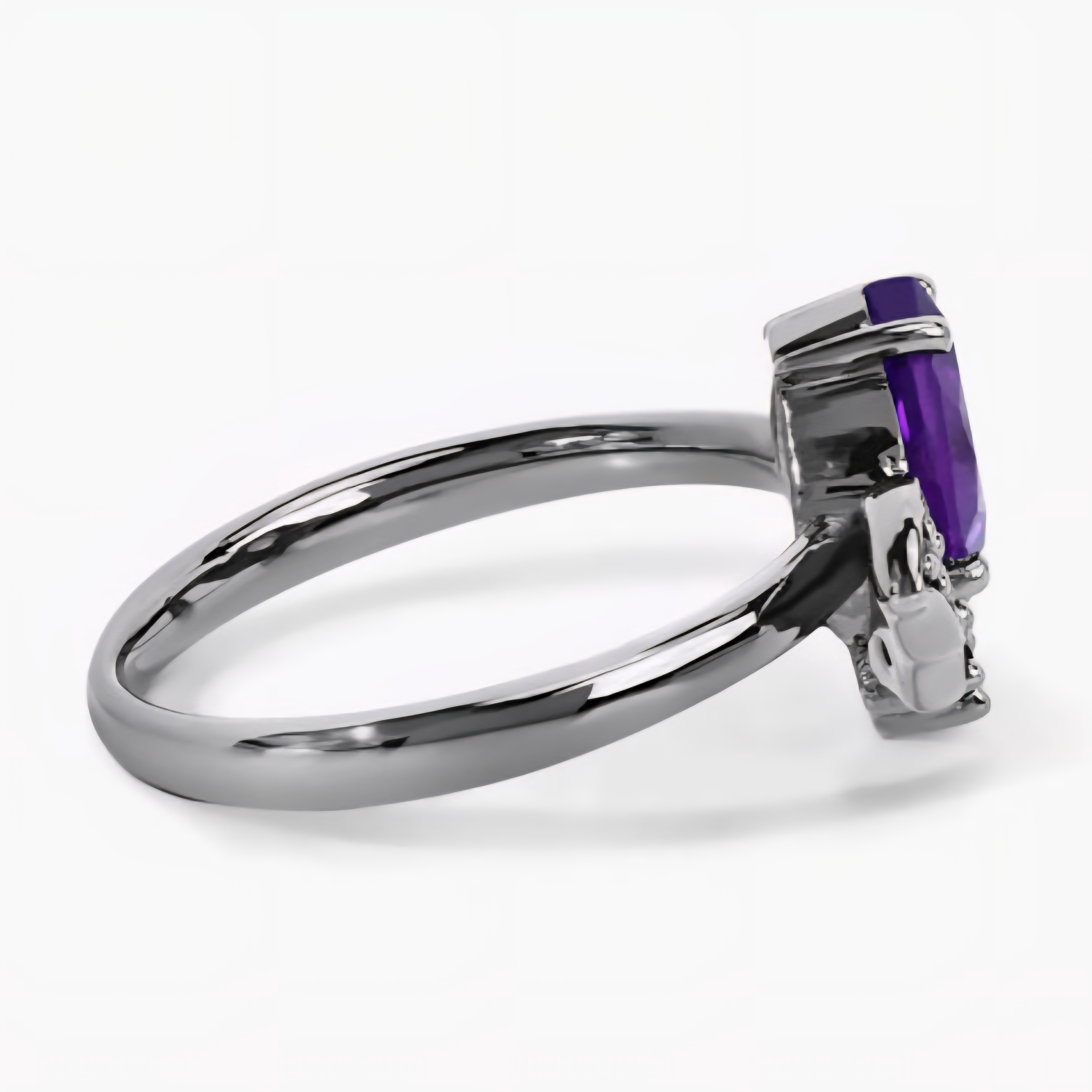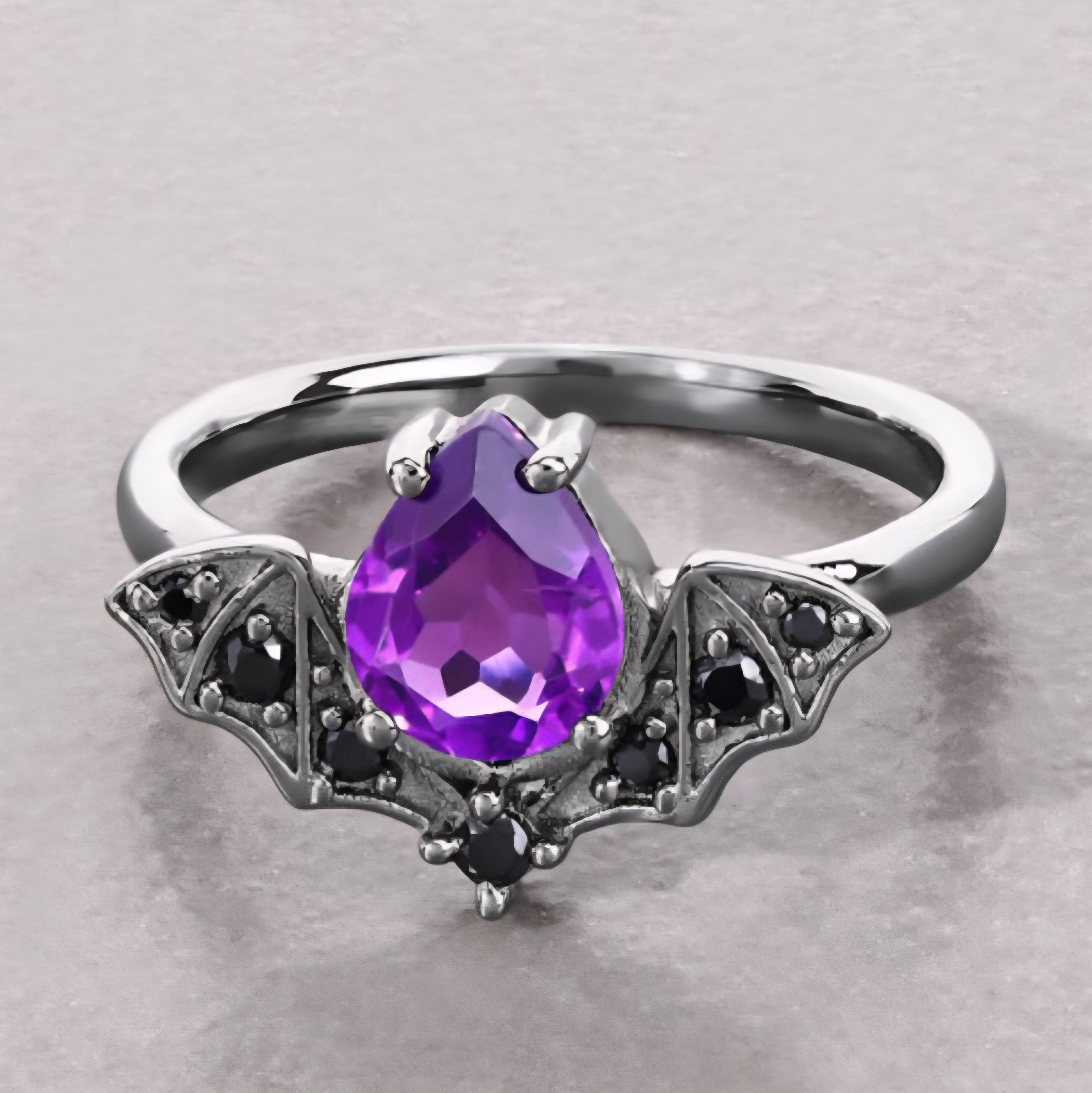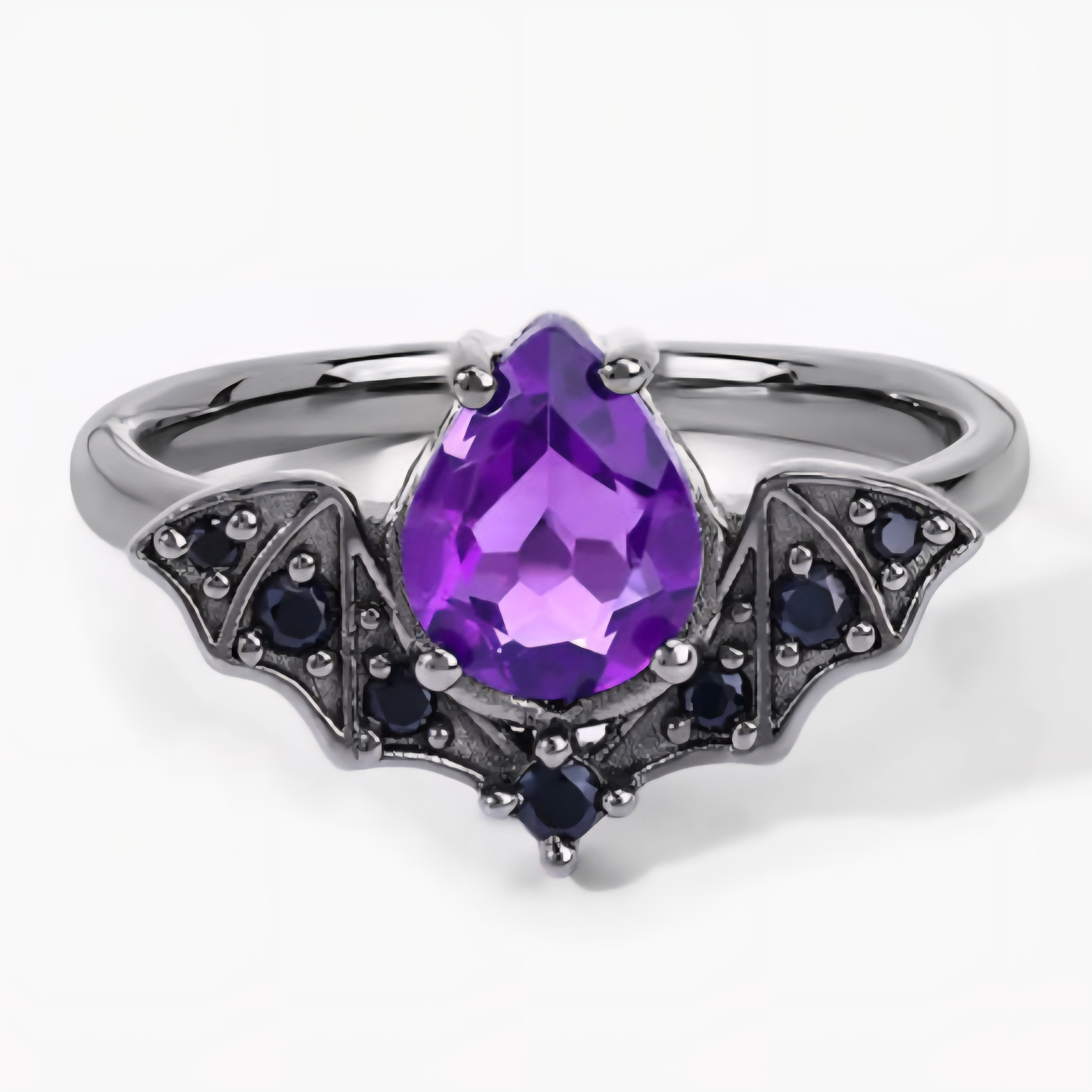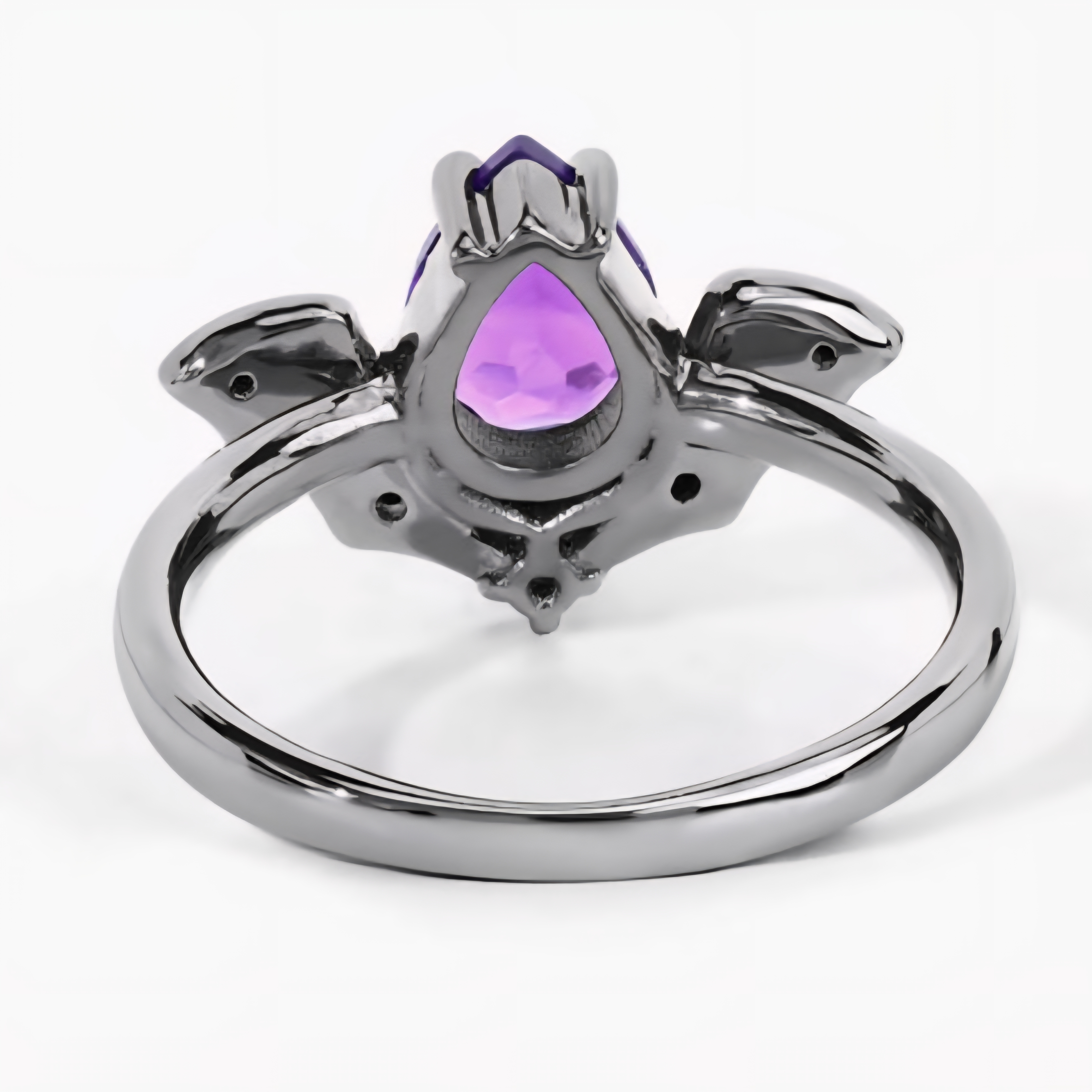 A gothic masterpiece with fangs of finesse. This Amethyst & Black Spinel Bat Ring spreads its wings in dramatic black rhodium, centered with a deep purple amethyst that glows like twilight. Every detail — from the bat’s sculpted wings to the midnight spinel accents — feels alive with nocturnal energy. It’s dark, elegant, and unapologetically bold — the kind of ring that commands attention without ever trying. A little spooky, a little royal, and entirely unforgettable.