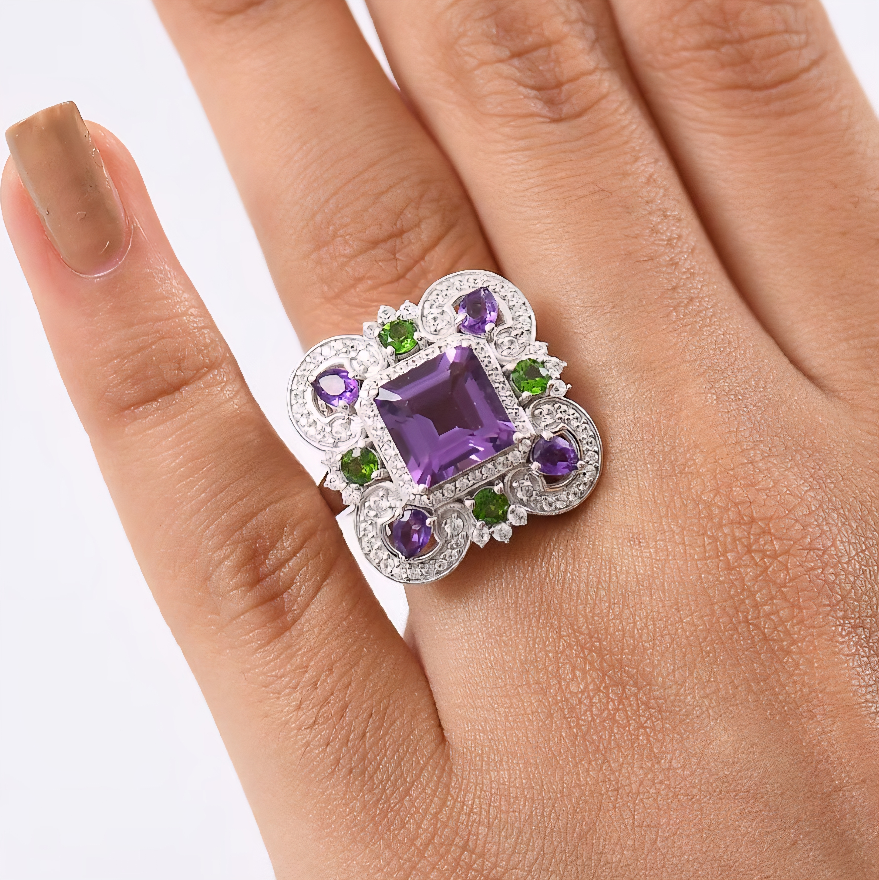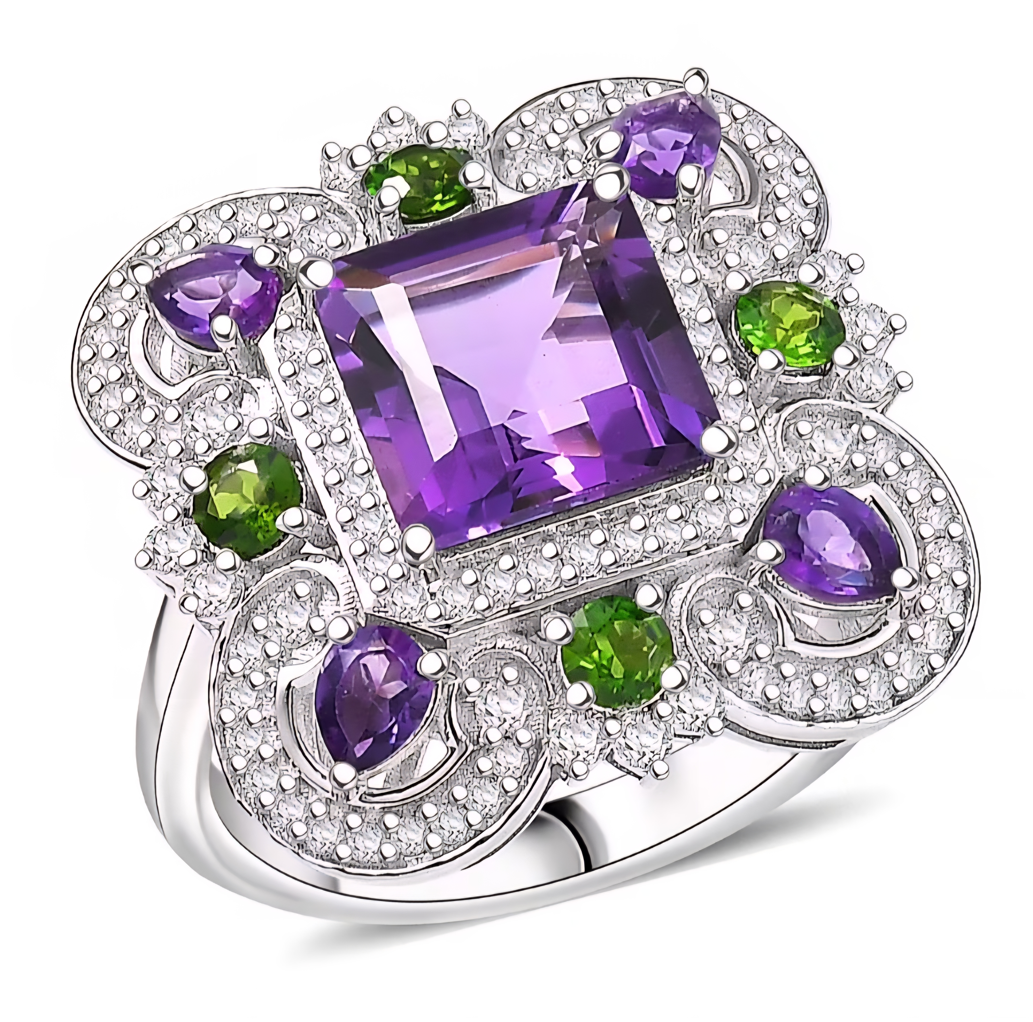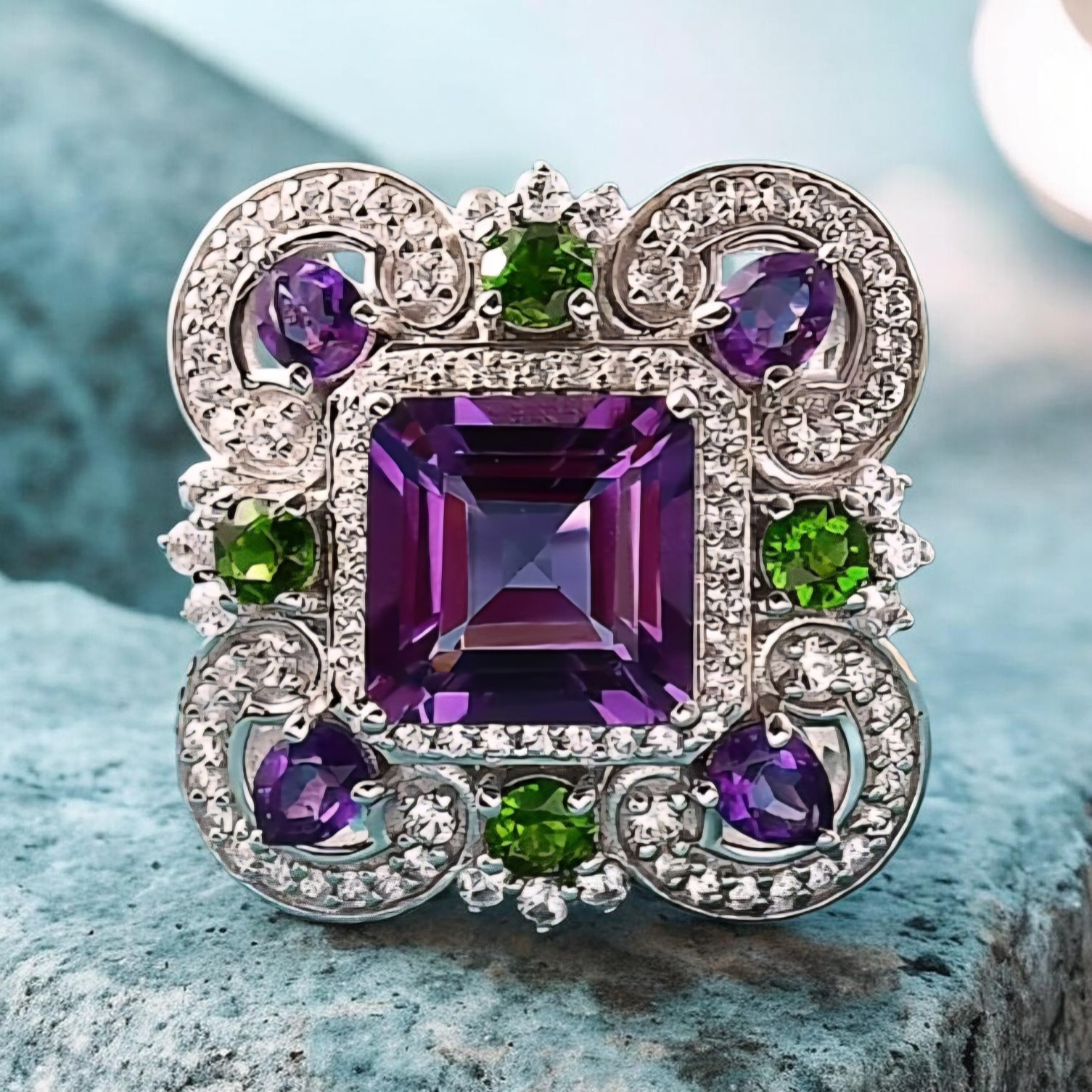Surrounding the center stone are pear shaped amethysts that echo the main color, creating a layered violet frame. Between them, vivid chrome diopside rounds deliver sharp, electric green contrast. Chrome diopside owes its intensity to chromium, which is why the green feels almost lit from within.