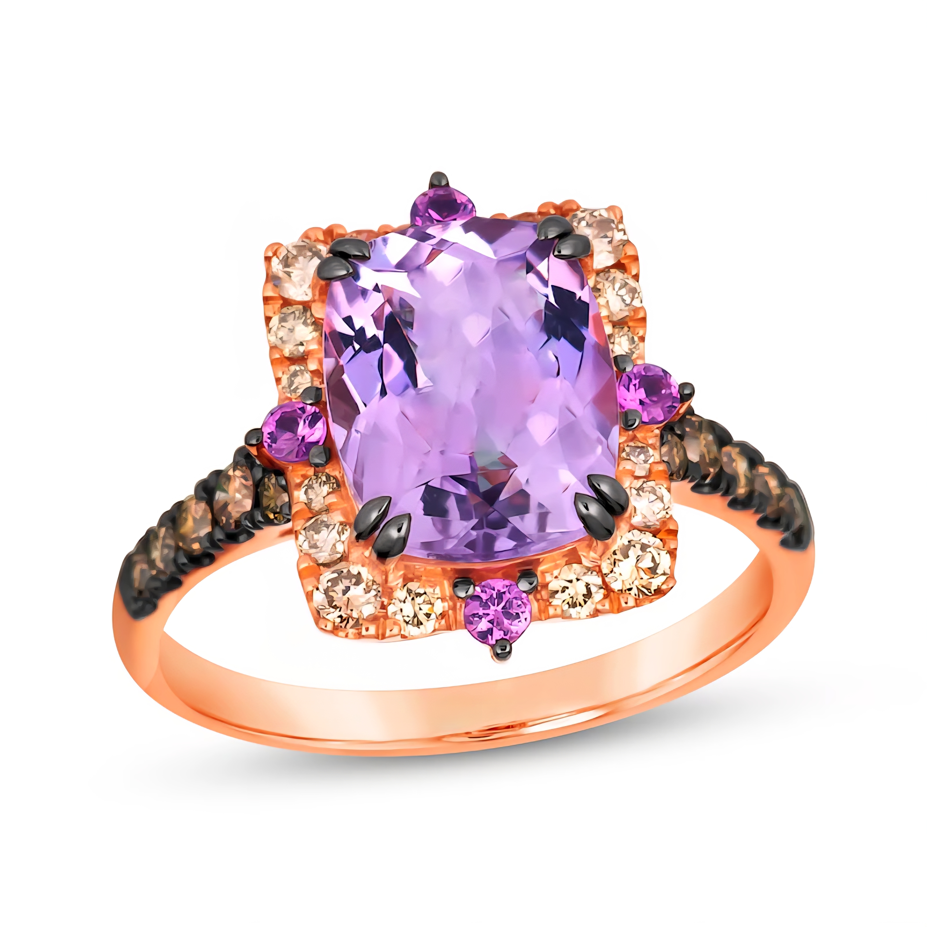 A bold cushion-cut amethyst commands attention at the heart of this design, its lavender-purple glow framed in a rich interplay of color. Champagne diamonds bring a soft golden sparkle, while deep brown diamonds along the shoulders ground the palette with warmth and depth. Four vibrant pink sapphires flash at the compass points, adding a playful edge to the symmetry. Black-rhodium prongs lend contrast and drama, sharpening the geometry of the halo and giving the piece its unmistakable modern attitude. Crafted in polished 14K rose gold, this ring is equal parts elegance and statement — a vibrant fusion of hues designed to turn heads from every angle.