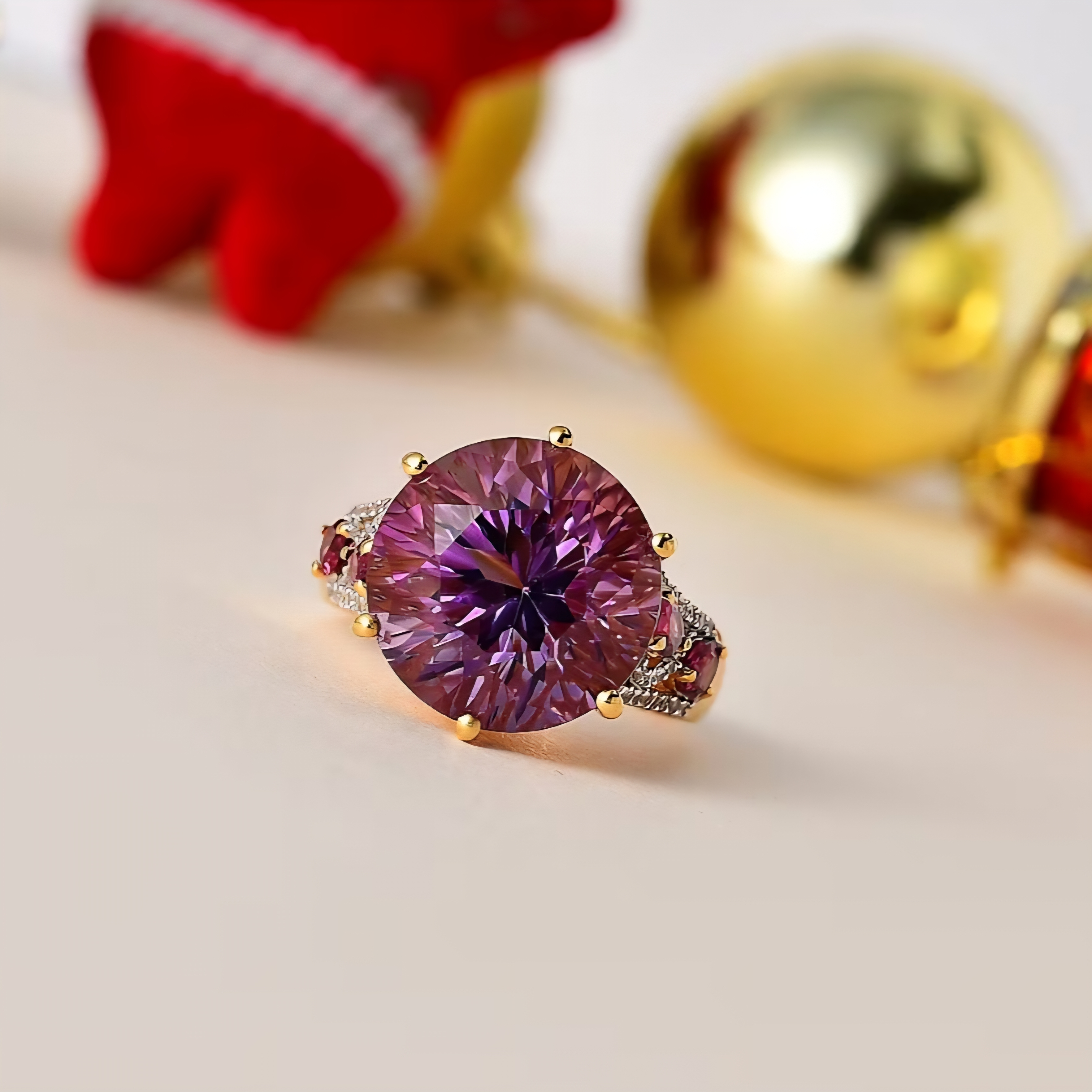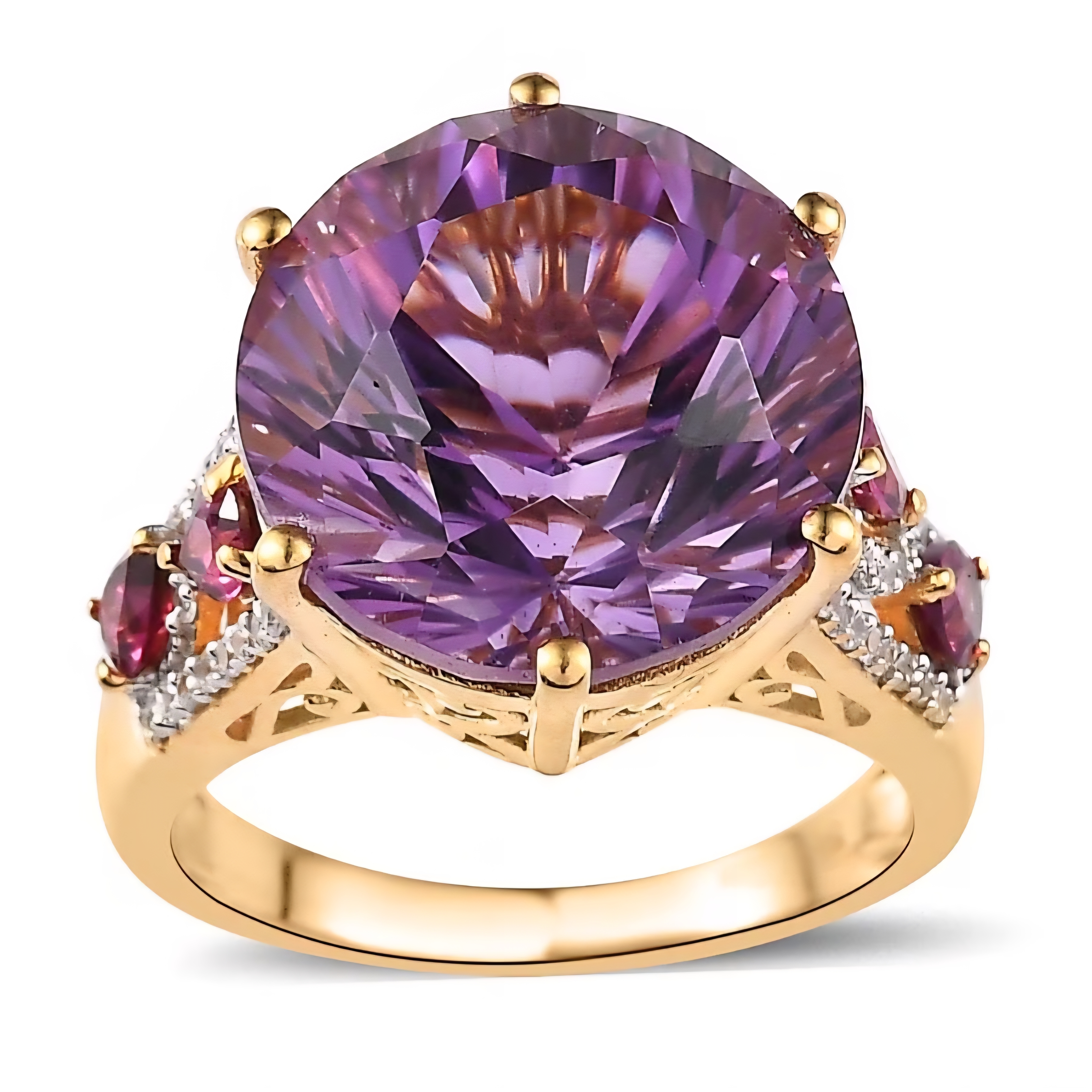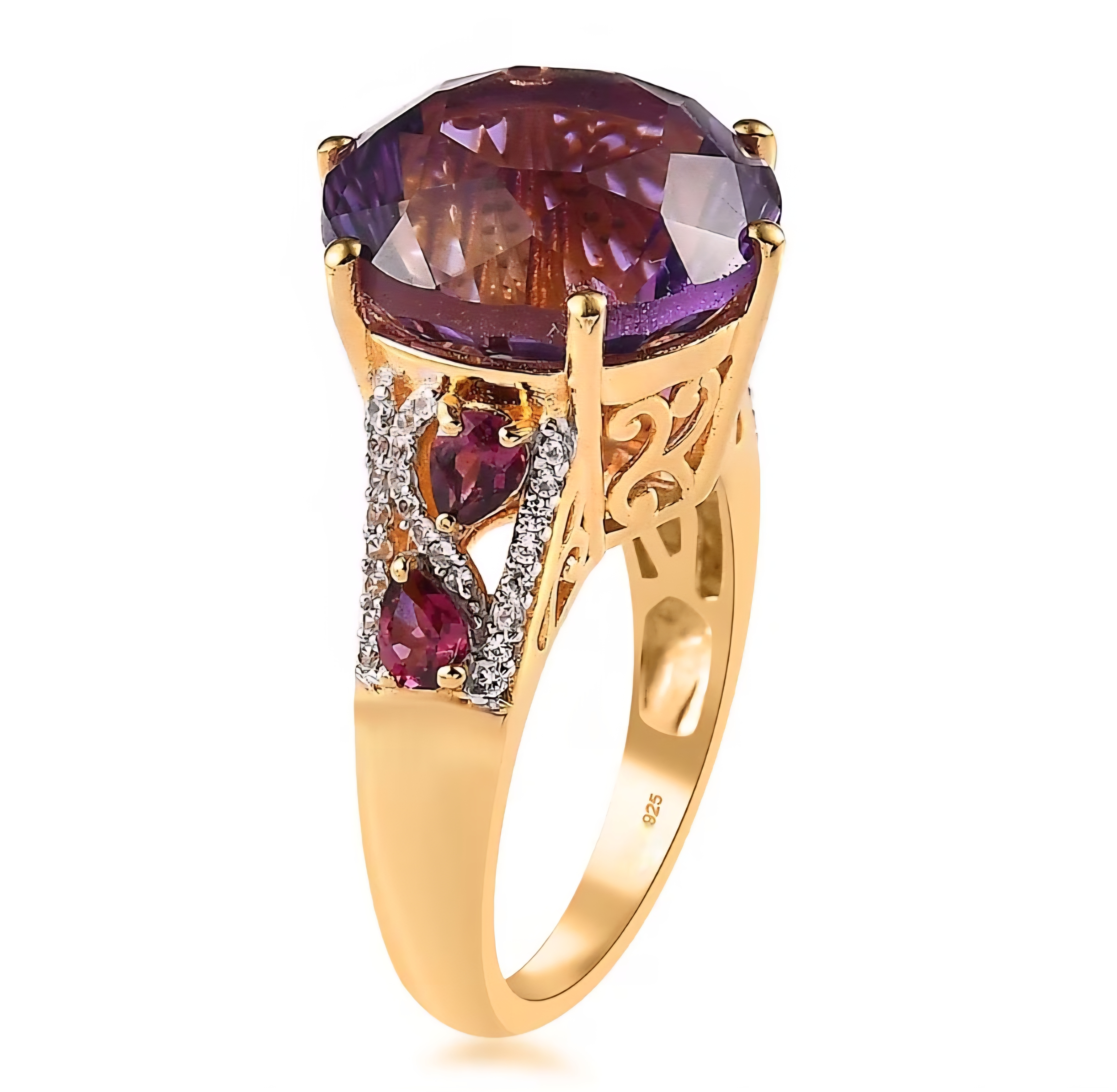 On each side, pear cut rhodolite garnets add 0.80 carats total of vivid purple red contrast, intensifying the amethyst and adding dimension to the profile. A ribbon of white zircon accents frames the sides with crisp brilliance, sharpening the entire composition and giving the ring clean, high definition sparkle.