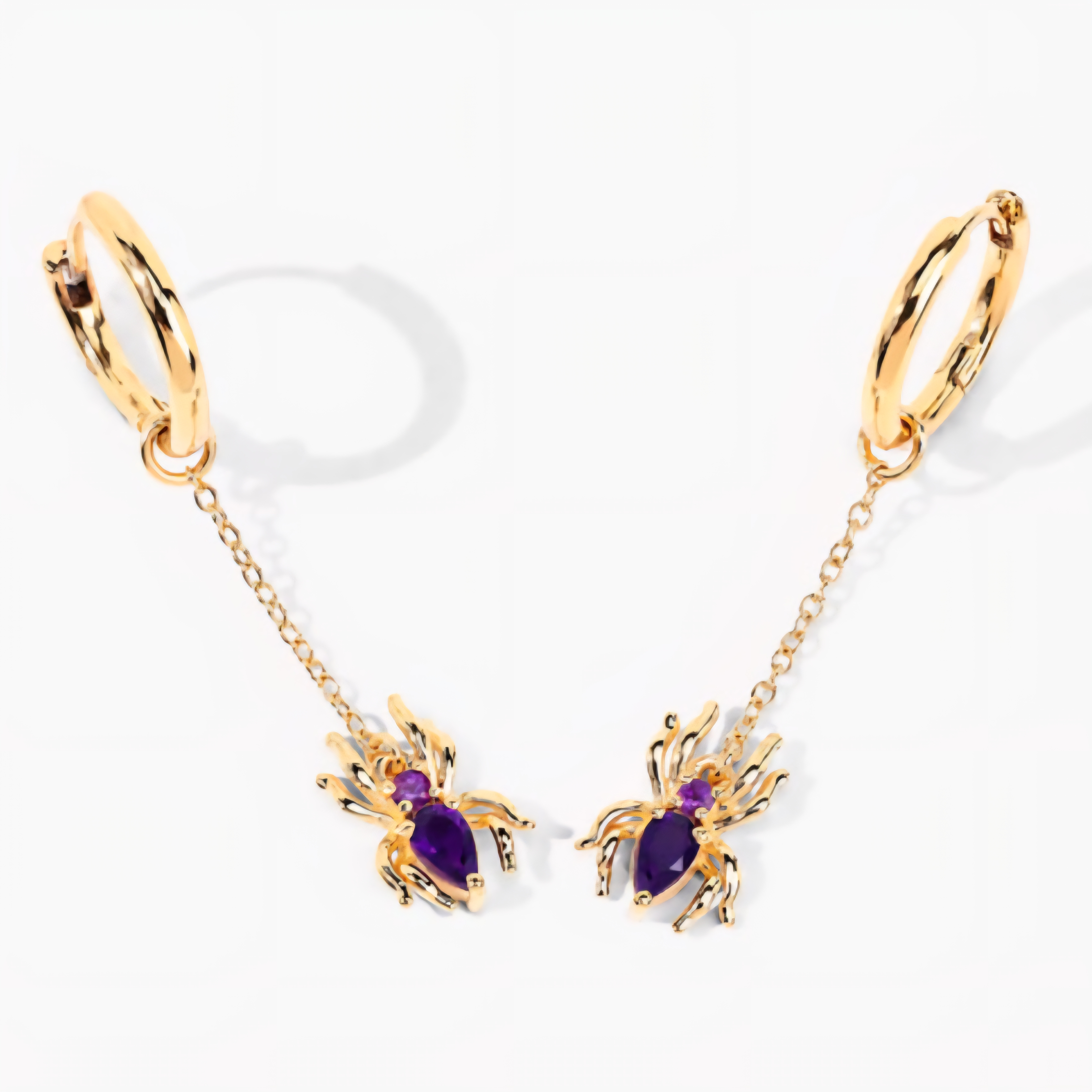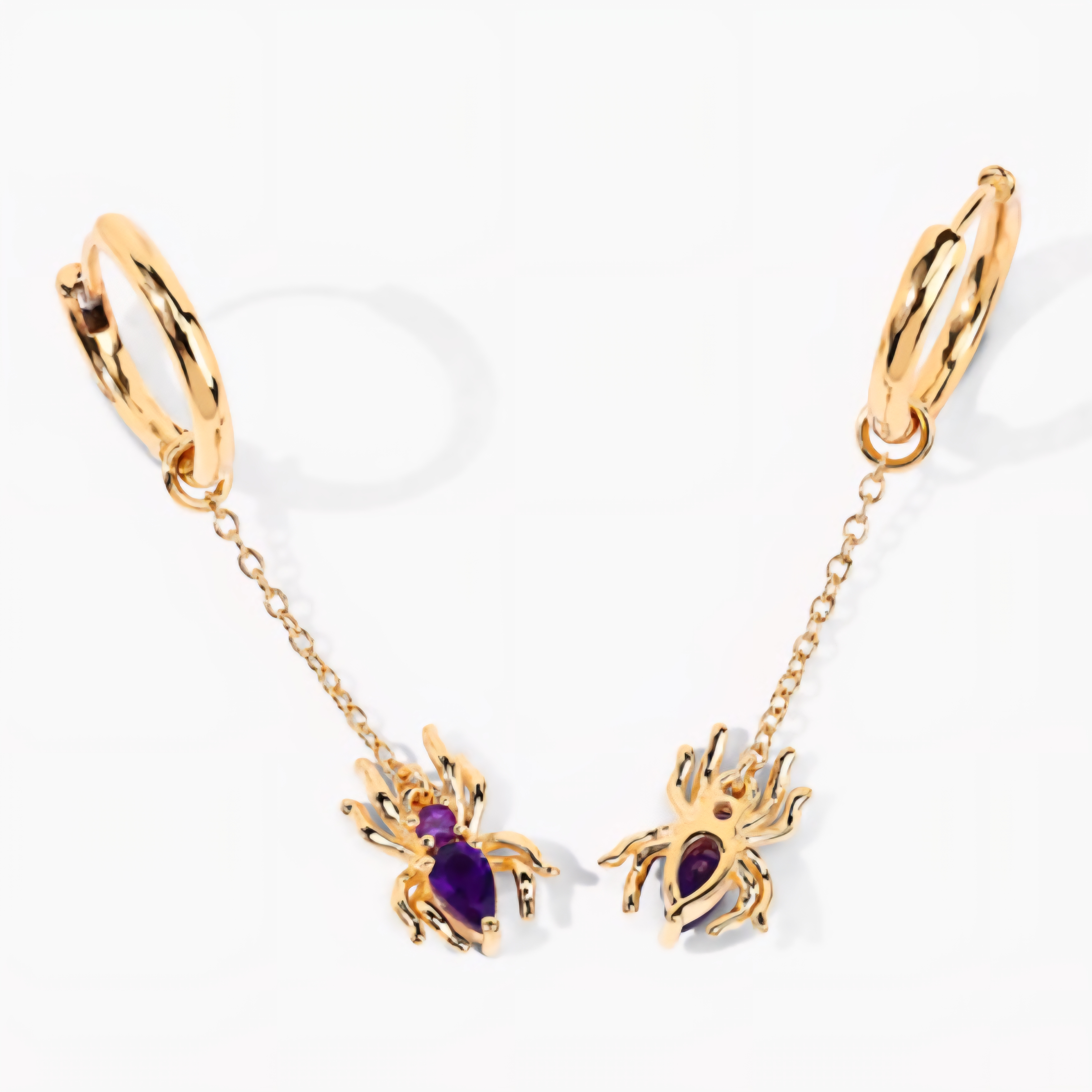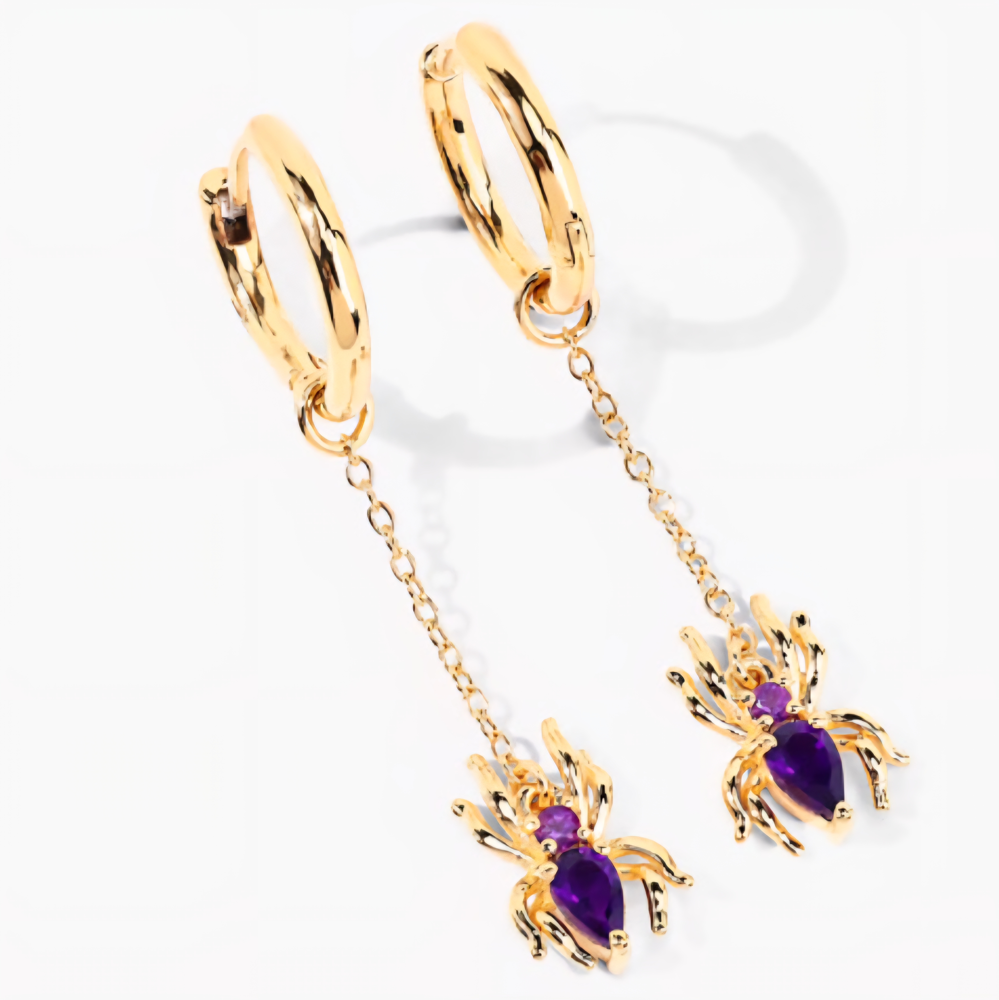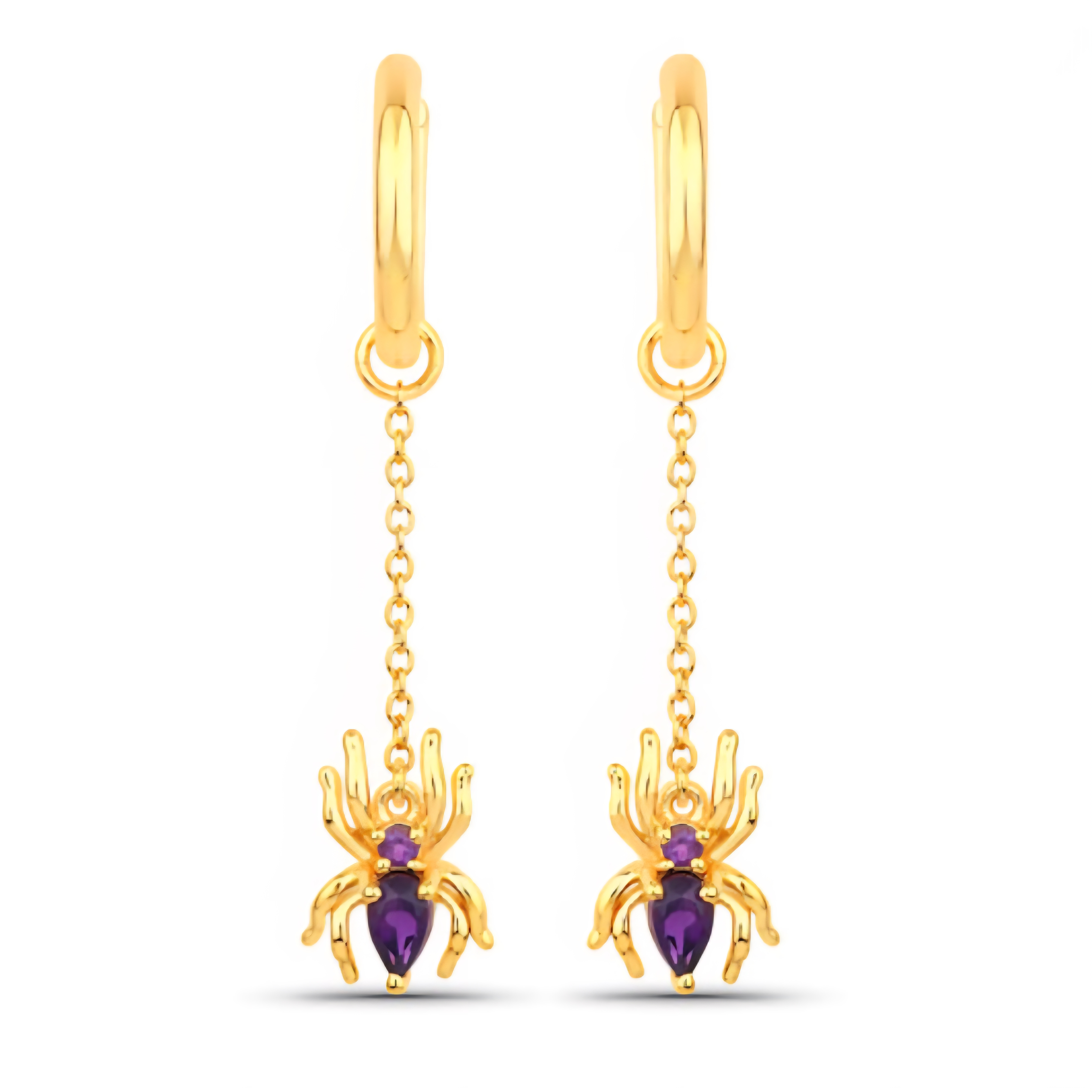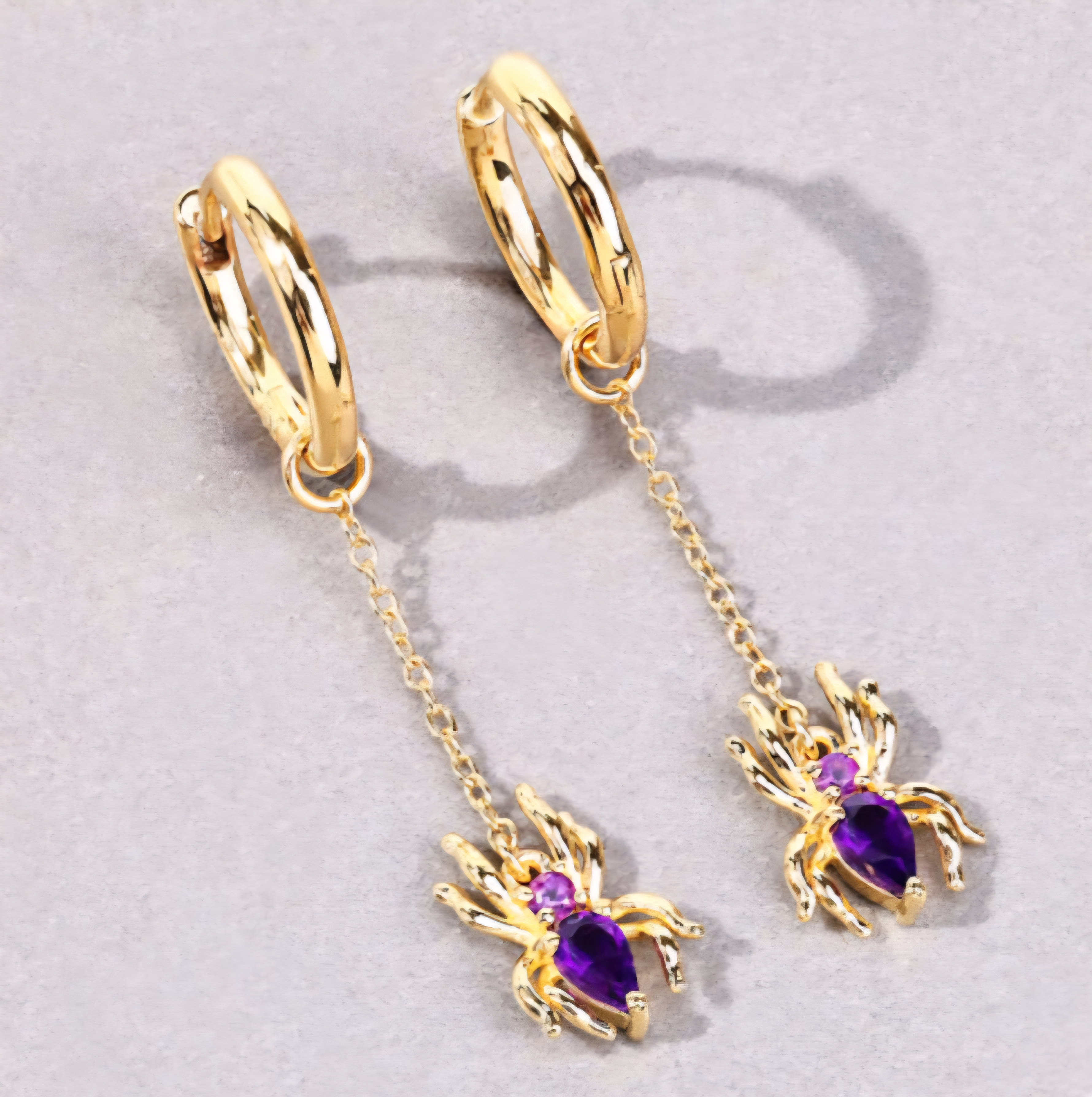 Creepy meets classy — and it works. These Amethyst Spider Dangle Earrings take delicate design and twist it into something beautifully bold. Each spider gleams with rich purple amethyst set in gold-plated sterling silver, dangling from sleek hoops that catch the light with every move. The color contrast hits hard — regal purple, molten gold, and just the right amount of dark allure. They’re elegant enough to wear anywhere, but let’s be real — they make the most impact when you want to turn heads. WILD AF energy, for anyone who loves jewelry with a bite.
