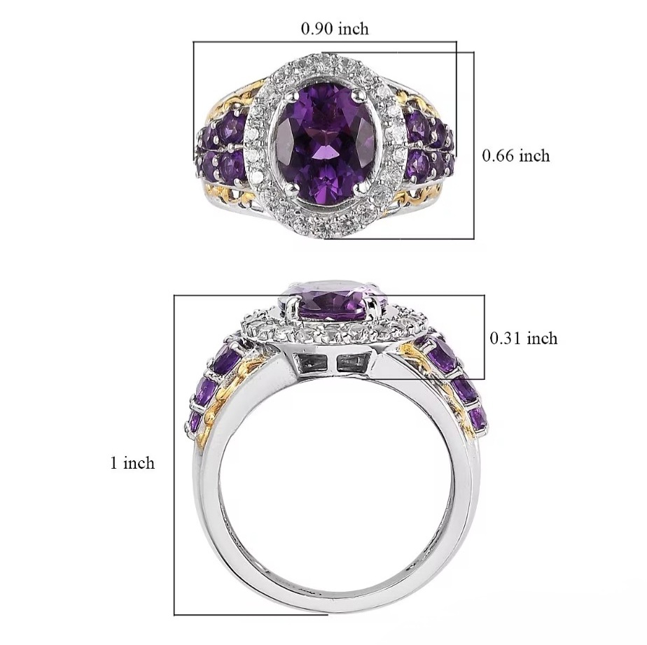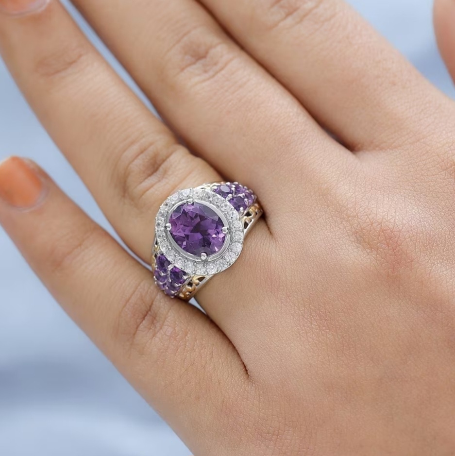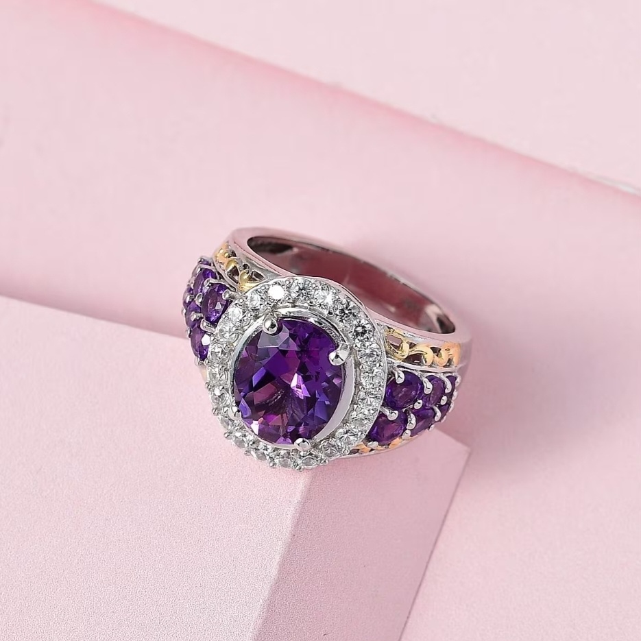 Additional amethyst accents continue down the shoulders, creating a layered gemstone profile that feels elevated and intentionally detailed rather than minimal. The setting is finished in a striking two-tone combination of rhodium and 18k yellow gold vermeil, adding contrast and a more high-end visual structure—cool silver tones for brilliance, with warm gold accents for richness and depth.