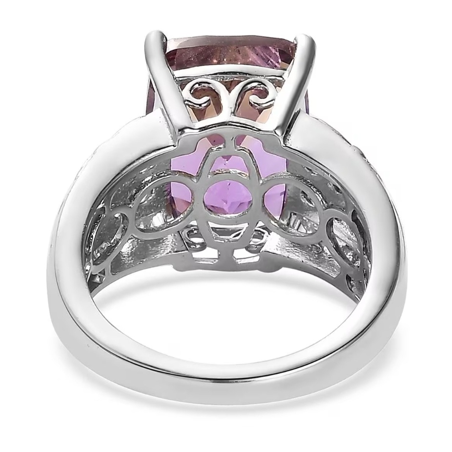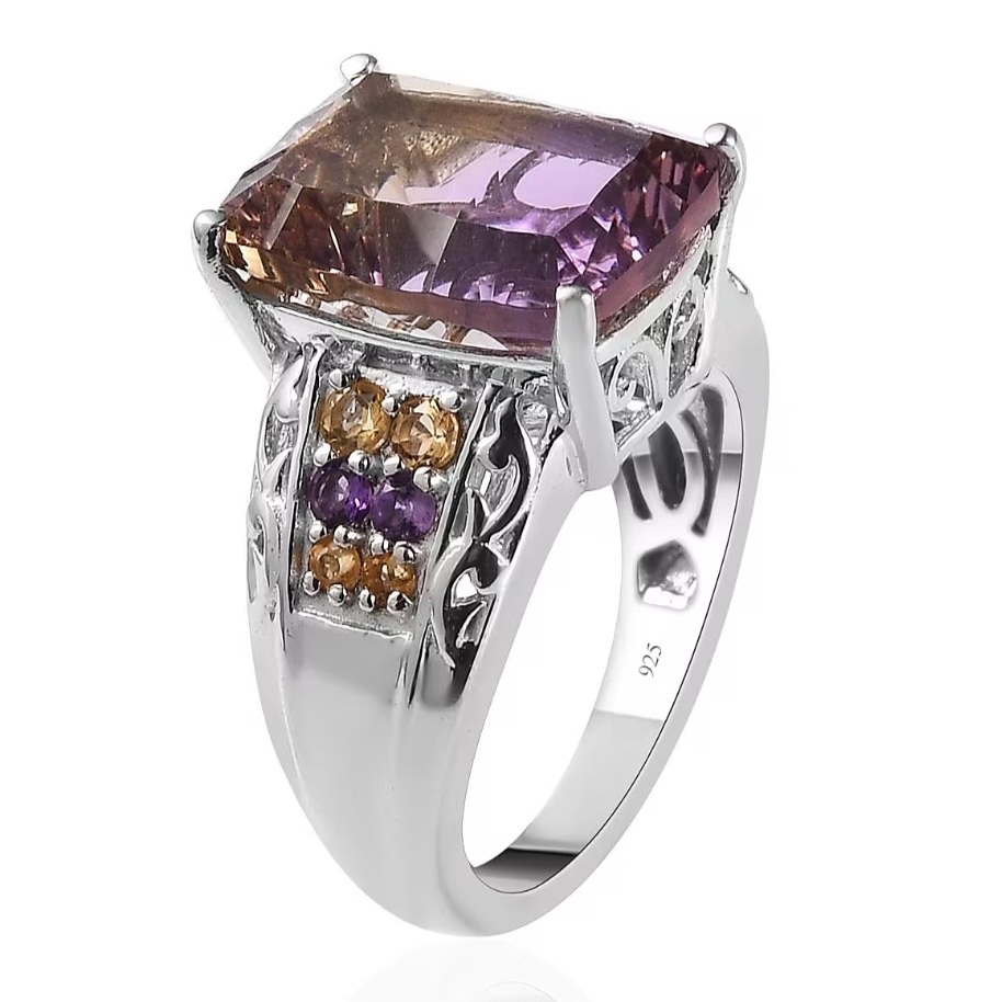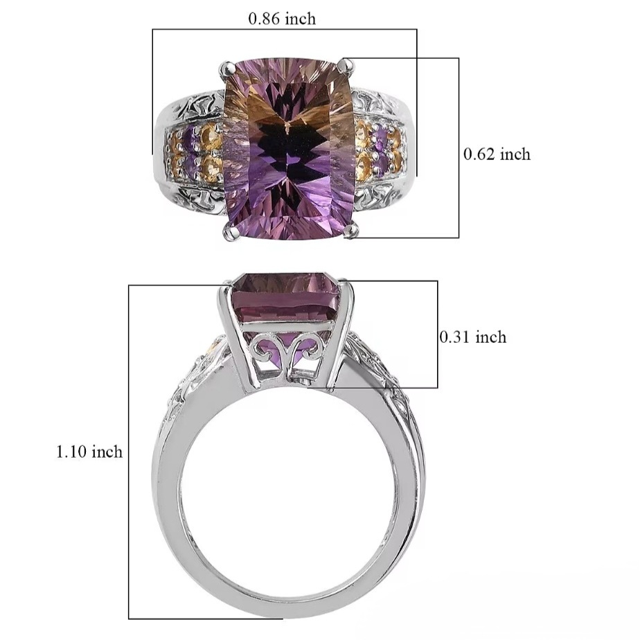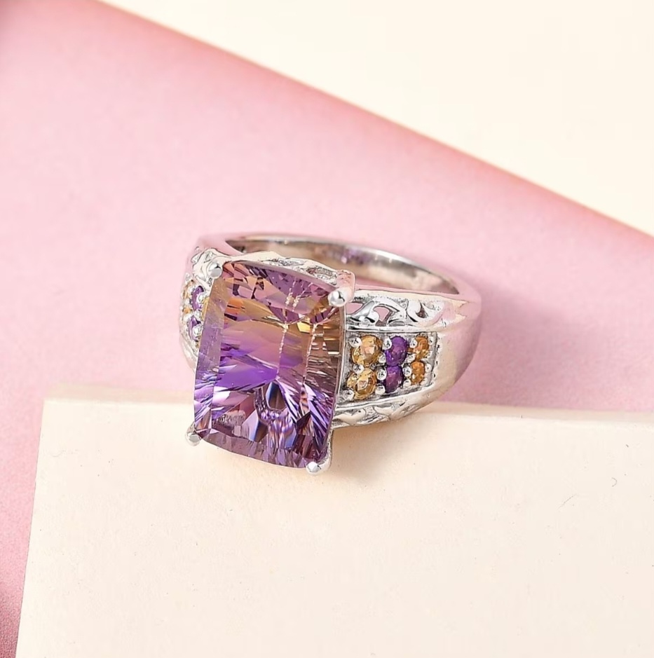 Accent stones are chosen to echo the ametrine’s natural color split. Citrine brings warmth and continuity to the golden tones, while amethyst reinforces the cooler purple hues. Set along the shoulders, the accents frame the center stone without competing with it, reinforcing the color story rather than distracting from it.