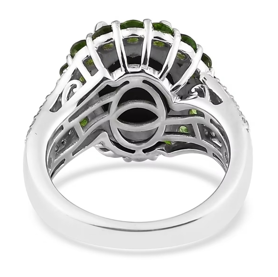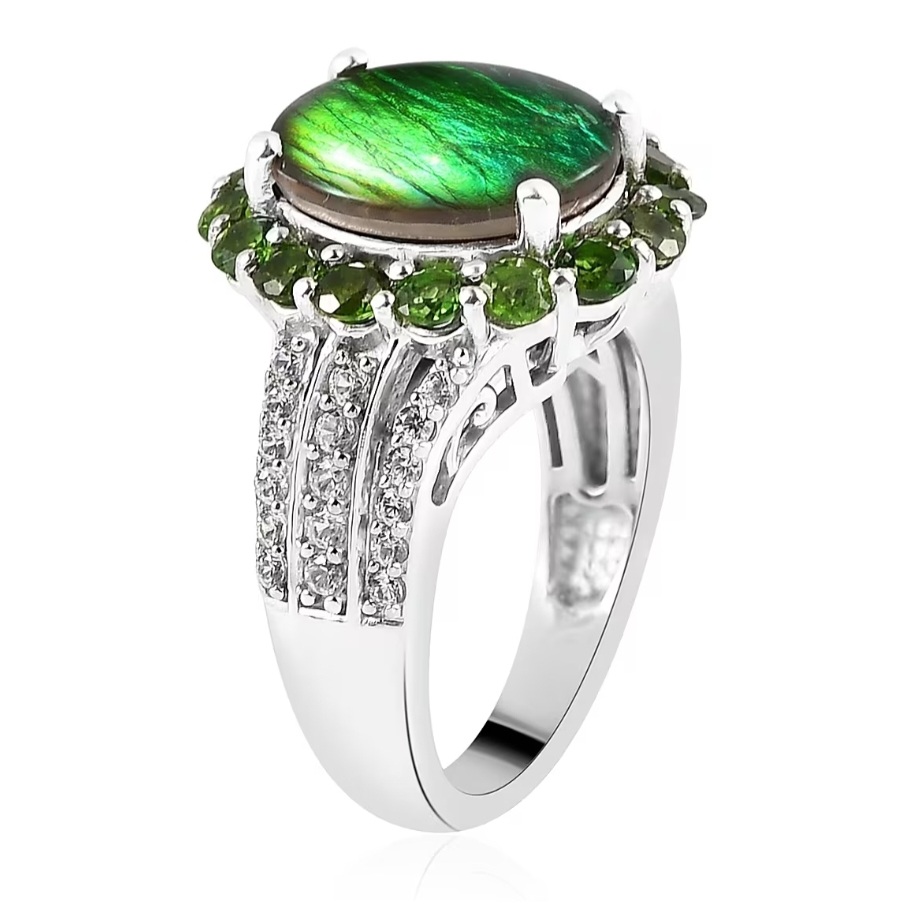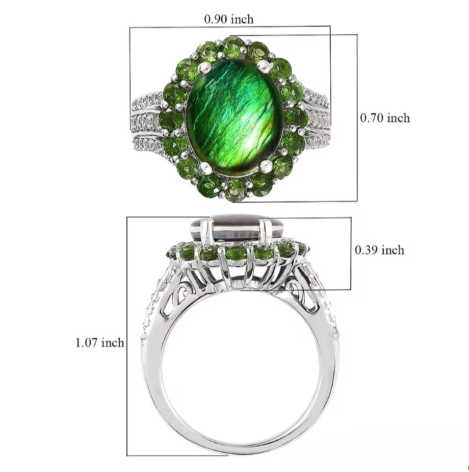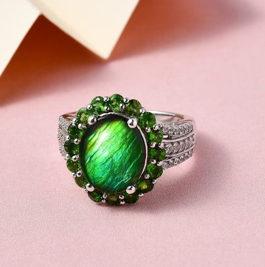 This ring is pure color energy. At the center, a 12x10mm Canadian ammolite flashes with deep emerald, gold, and bronze fire — a triplet gemstone that feels alive under light. Surrounding it, a lush halo of natural chrome diopside adds forest-green intensity, while precision-cut white zircons create a luminous sparkle that rivals diamonds. The triple-shank design gives it a commanding presence without losing elegance, balancing structure and brilliance in every curve. Set entirely in solid 925 sterling silver and finished in rhodium, it’s a statement of natural color, rare craftsmanship, and modern strength — one of those pieces that doesn’t just catch the eye, it owns the moment.