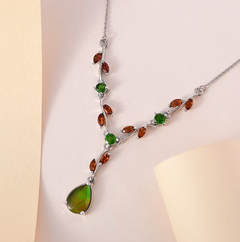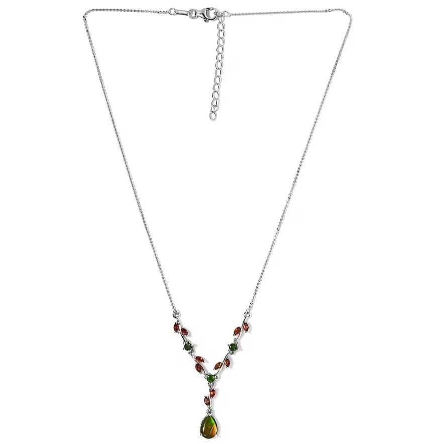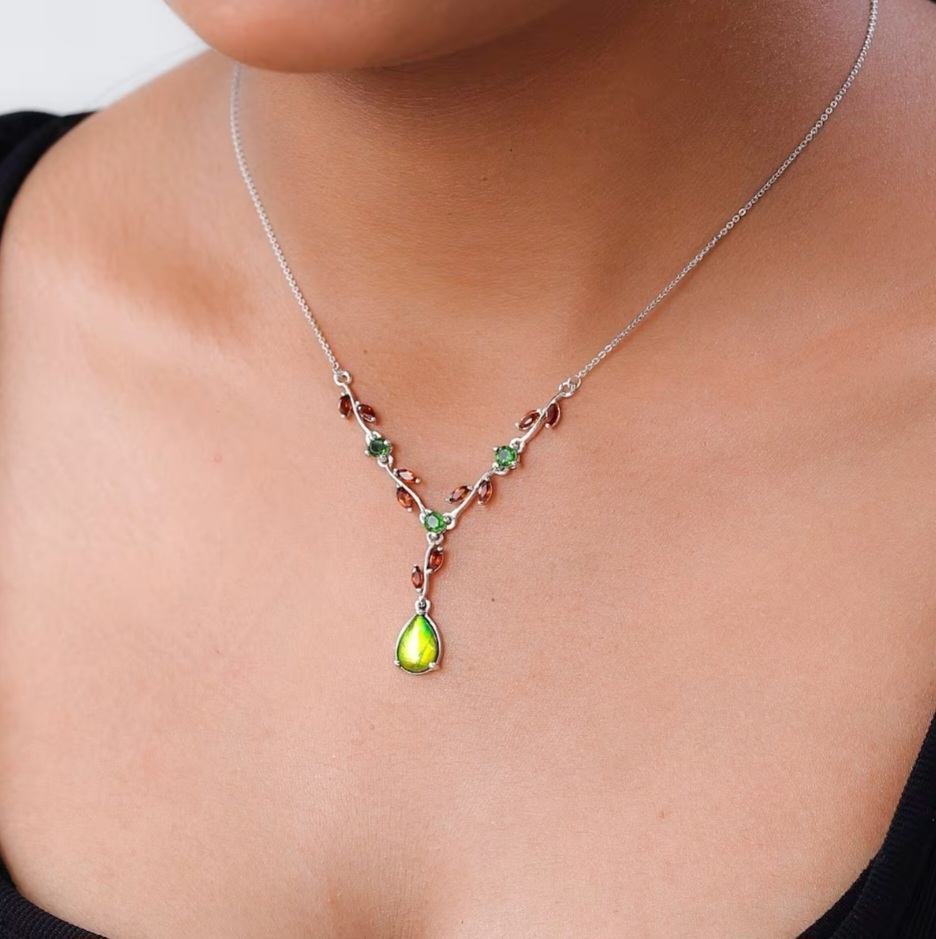 Like autumn light caught in silver, this necklace celebrates nature’s most vivid transformation. A Canadian ammolite teardrop shimmers with the full spectrum of fall — shifting from golden amber to forest green — suspended beneath a cascade of gemstones shaped like leaves in motion. Deep Madeira citrines glow with fiery copper-orange warmth, while chrome diopsides bring crisp green contrast, echoing the last flashes of summer before the change. Set in solid 925 sterling silver with a high-polish rhodium finish, this 18–20" adjustable Y-drop necklace flows gracefully along the neckline, radiating color, craftsmanship, and the quiet power of the changing season.