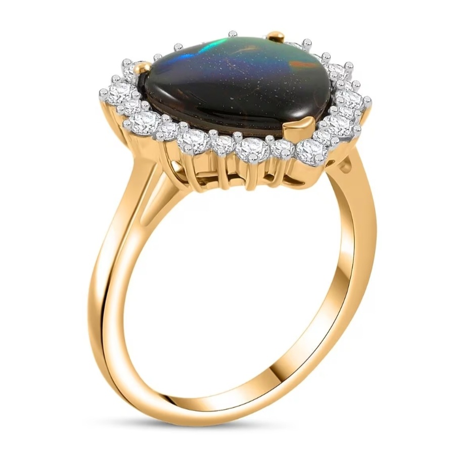 Surrounding the Ammolite is a crisp halo of Moissanite, adding high-impact white brilliance that sharpens the contrast and frames the gemstone’s multi-color fire. Rhodium-brightened prong tips elevate the sparkle, while the warm 18k yellow gold finish enhances the Ammolite’s rich color layers.