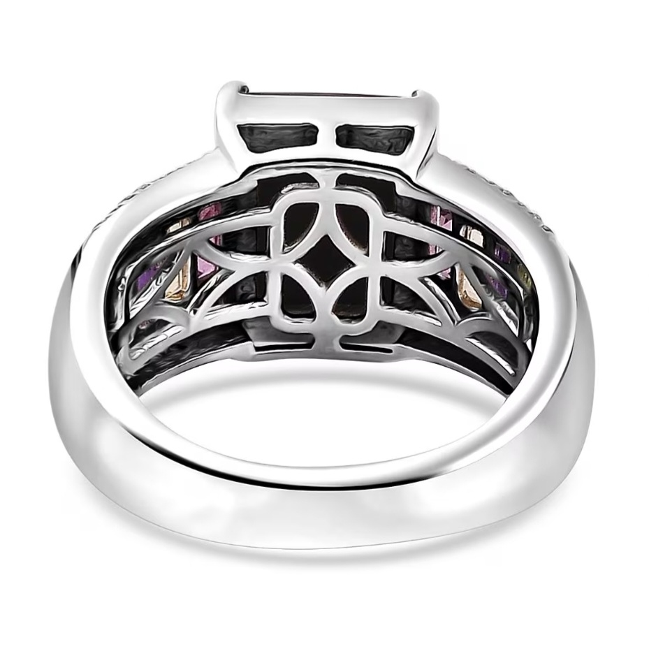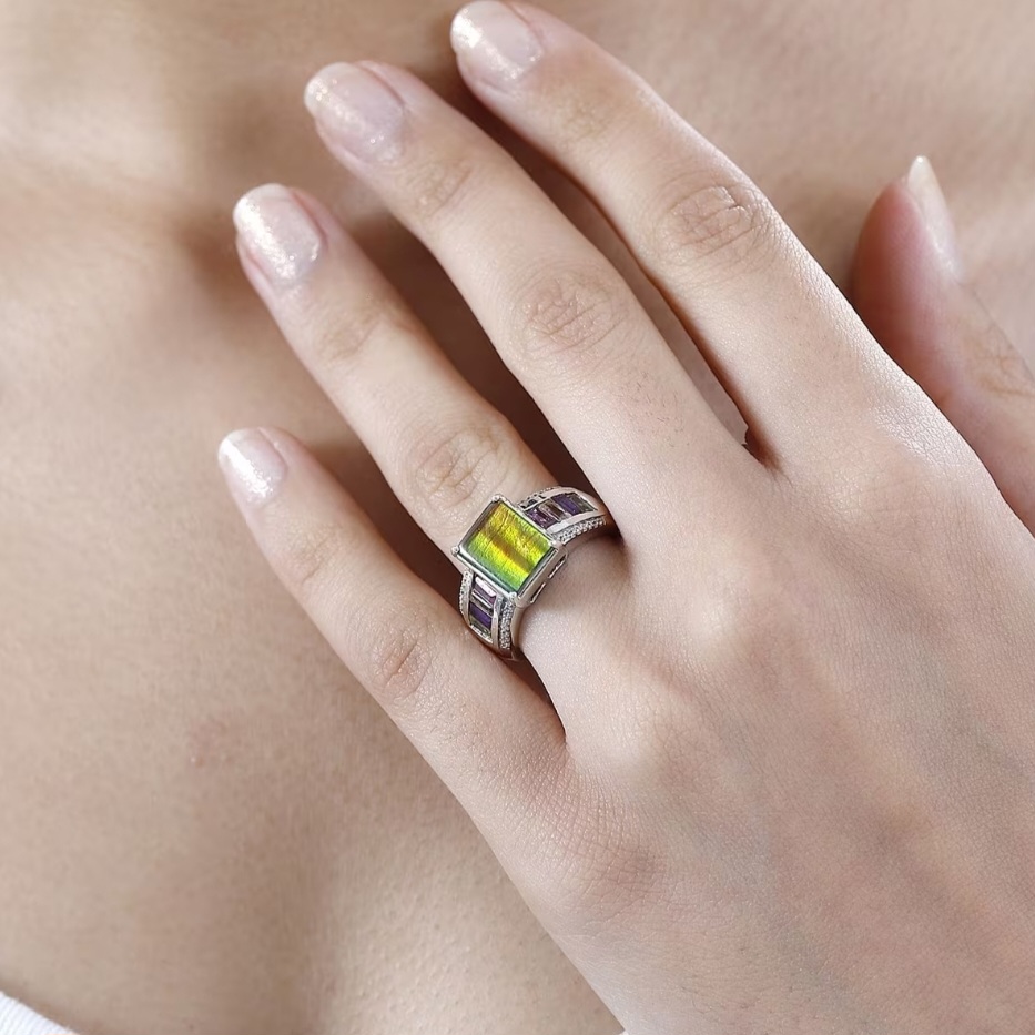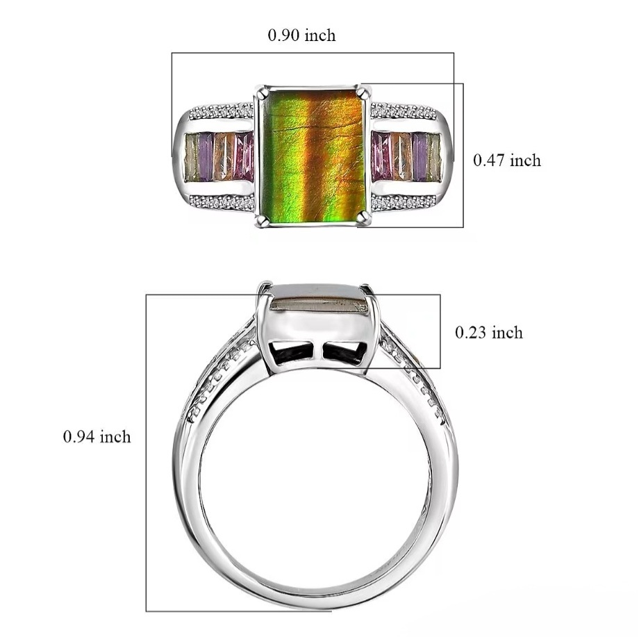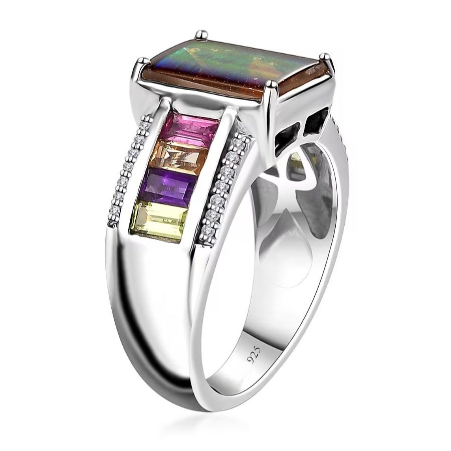 This ring is pure color alchemy. A rare Canadian ammolite radiates its full rainbow fire — flashes of gold, emerald, and crimson shifting across its fossilized surface — while precision-cut baguettes of rhodolite, citrine, amethyst, and peridot line each side like a gemstone spectrum. White zircon accents bring a final edge of brilliance, completing the perfect balance of nature’s color and crafted design. Set in solid 925 sterling silver with rhodium plating for mirror polish and durability, this ring isn’t just vivid — it’s alive. Every glance reveals a new wavelength, a new mood, and a new reason to stare.
