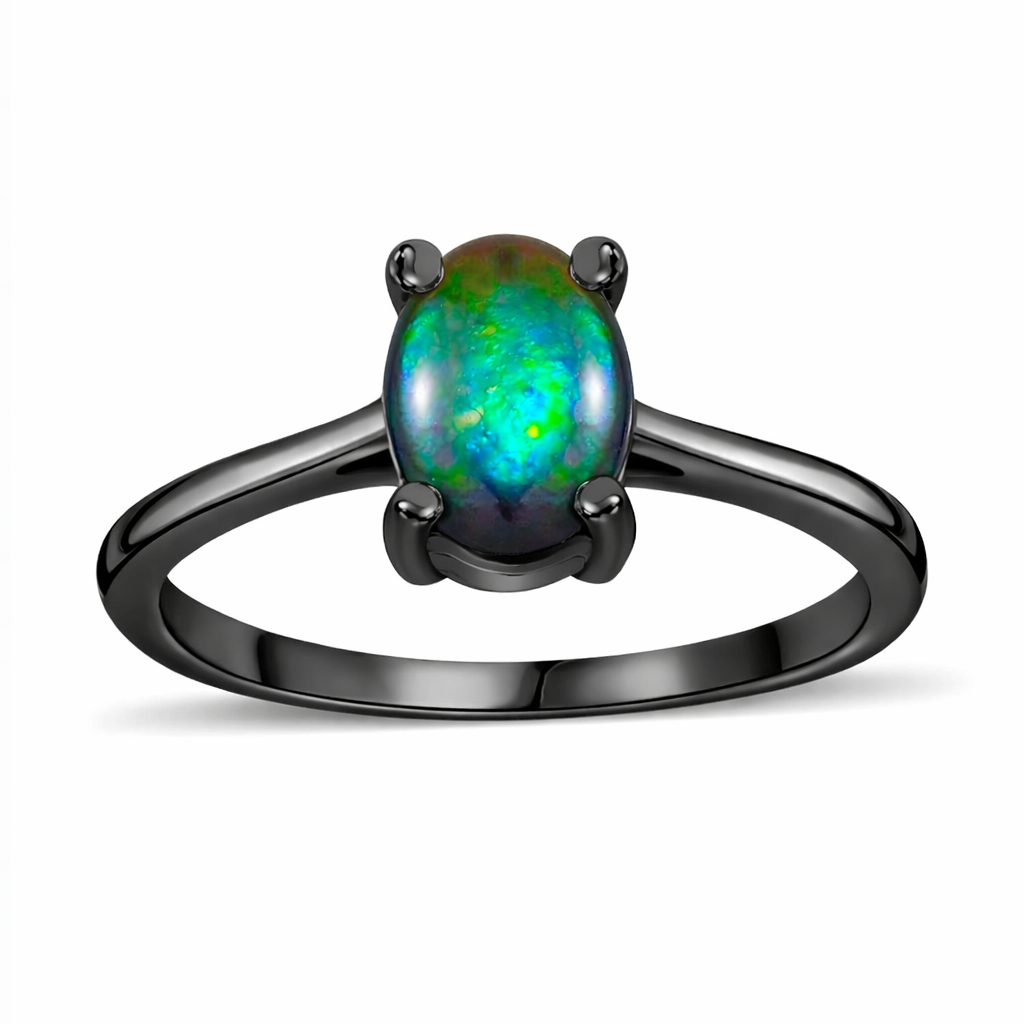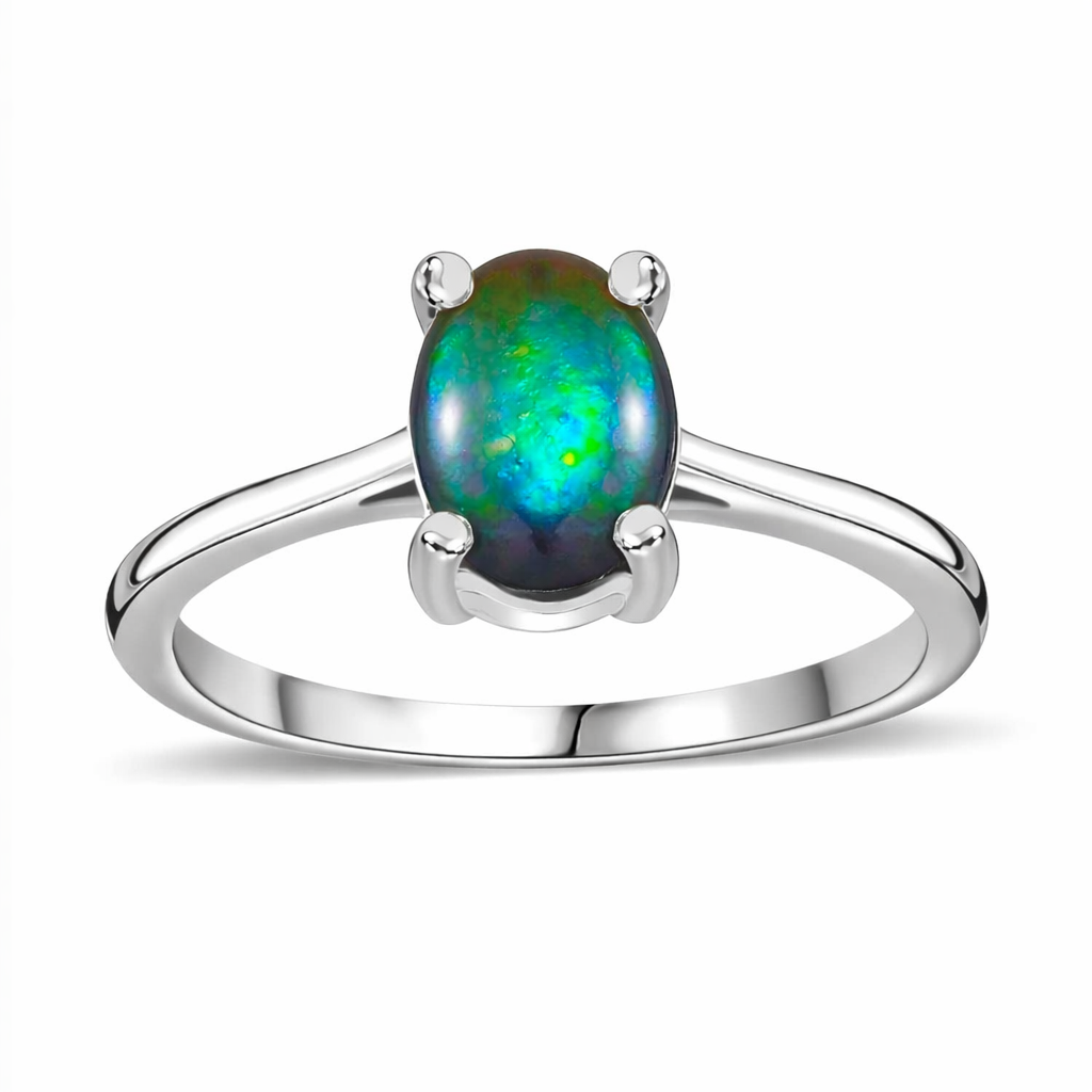 This ring is designed to let the gemstone lead. At the center sits a 10×8mm oval Canadian Ammolite cabochon, an organic gemstone formed from fossilized ammonite shell. Ammolite is prized for its naturally occurring spectral color zoning, with rich greens and darker tonal flashes created by layered aragonite structure. Each stone is inherently unique, with no two patterns ever the same.