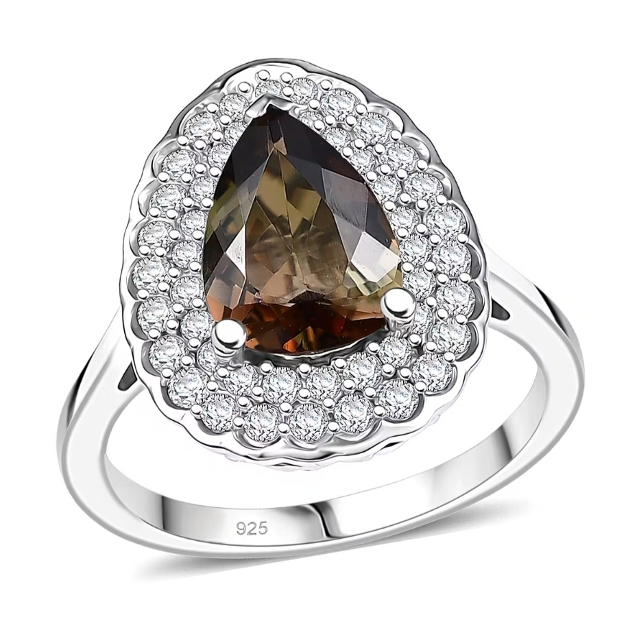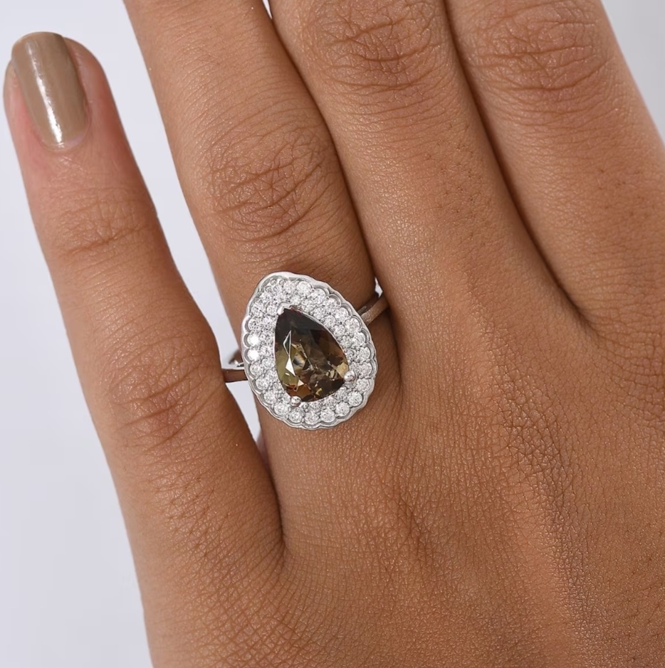 Surrounding the stone is a double halo of colorless moissanite, creating separation and lift without overwhelming the center. The layered halos frame the pear shape with precision, allowing the andalusite’s darker tone to stand forward while the moissanite provides controlled light and definition.