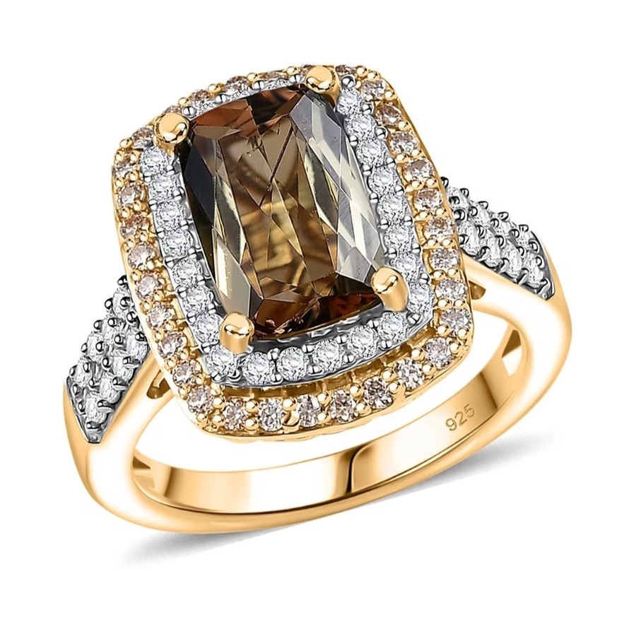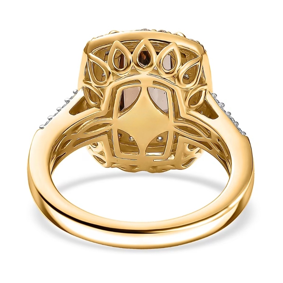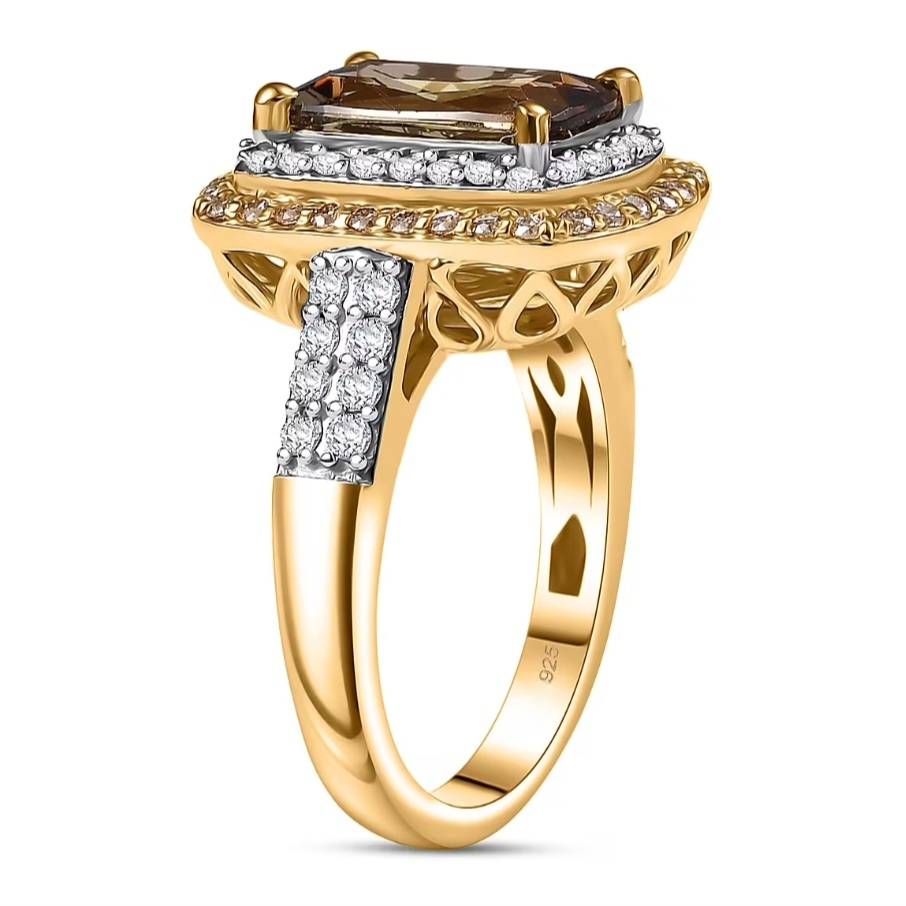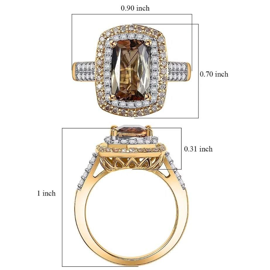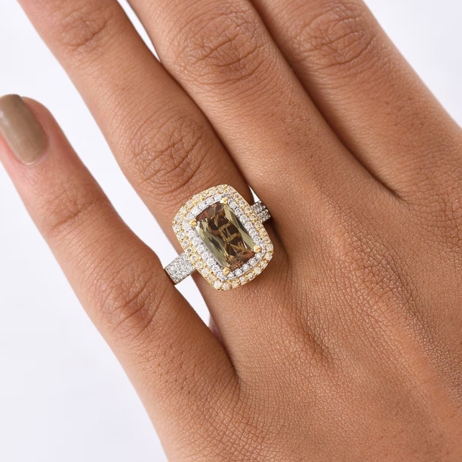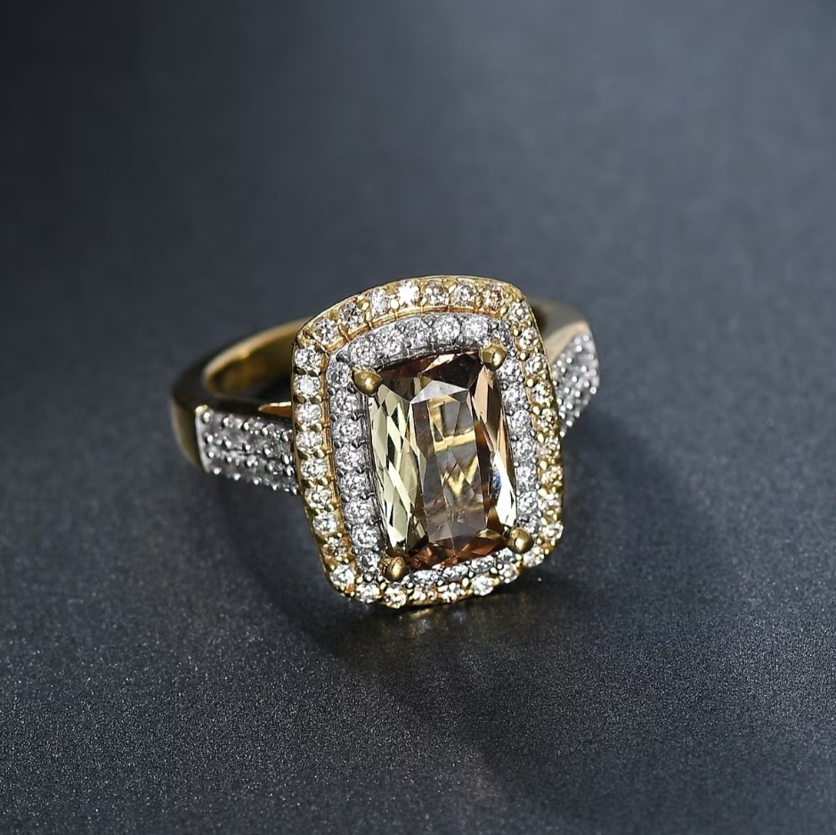 This design puts the 14×7mm Andalusite front and center — long, saturated, and prismatic under a precise four-prong setting. A tight double halo of white and champagne moissanite builds real dimension around the stone, creating contrast that makes the Andalusite’s natural shift even richer. The shoulders rise into the halo with clean, structured lines set with additional moissanite, then flow into a solid, uniform shank that keeps the ring grounded and substantial. The under-structure is fully finished for durability, and the overall silhouette is bold, refined, and confidently color-forward.