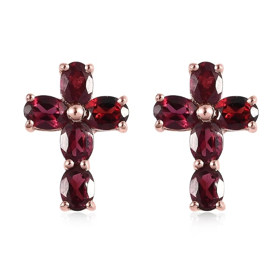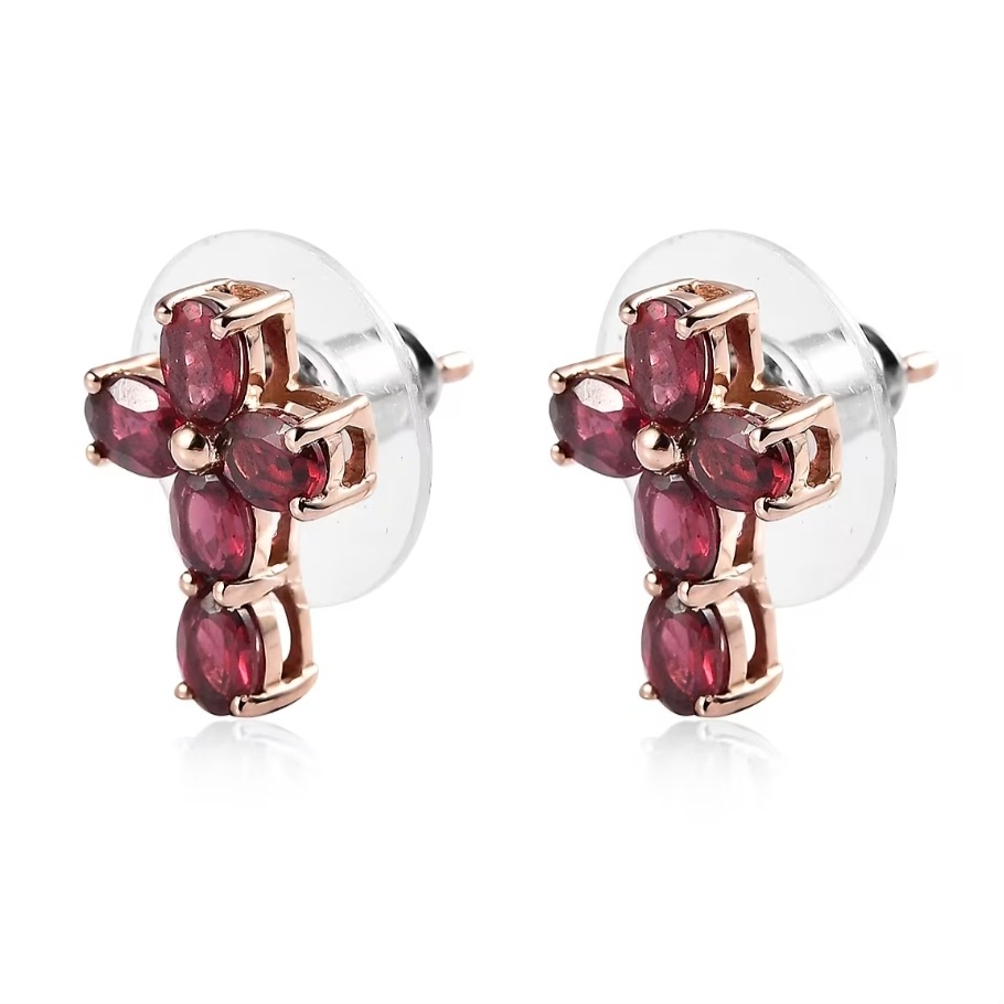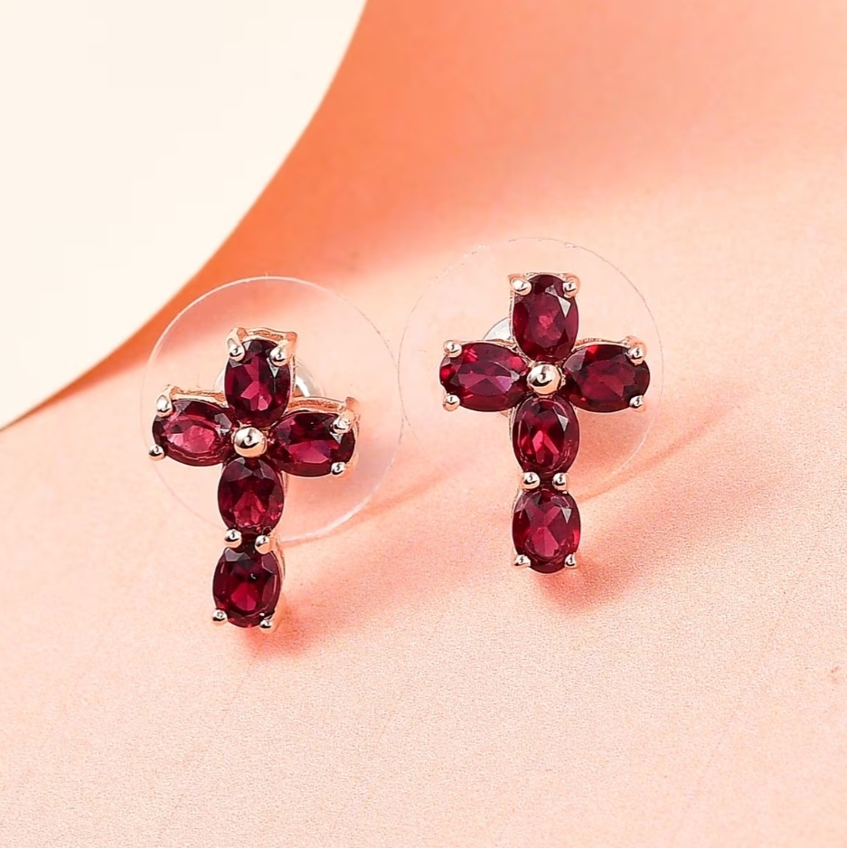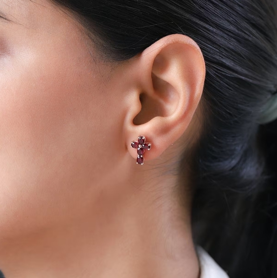 These cross studs showcase the rich beauty of natural Arizona Anthill Garnet, arranged in a balanced formation that radiates warmth and depth. Each earring features five matched oval-cut garnets, their deep red tones glowing against a soft 18k rose gold finish. The simple prong setting allows light to move freely through each gem, giving the design dimension without excess. Refined yet meaningful, they’re the perfect everyday pair — polished, versatile, and beautifully symbolic of strength and grace.
