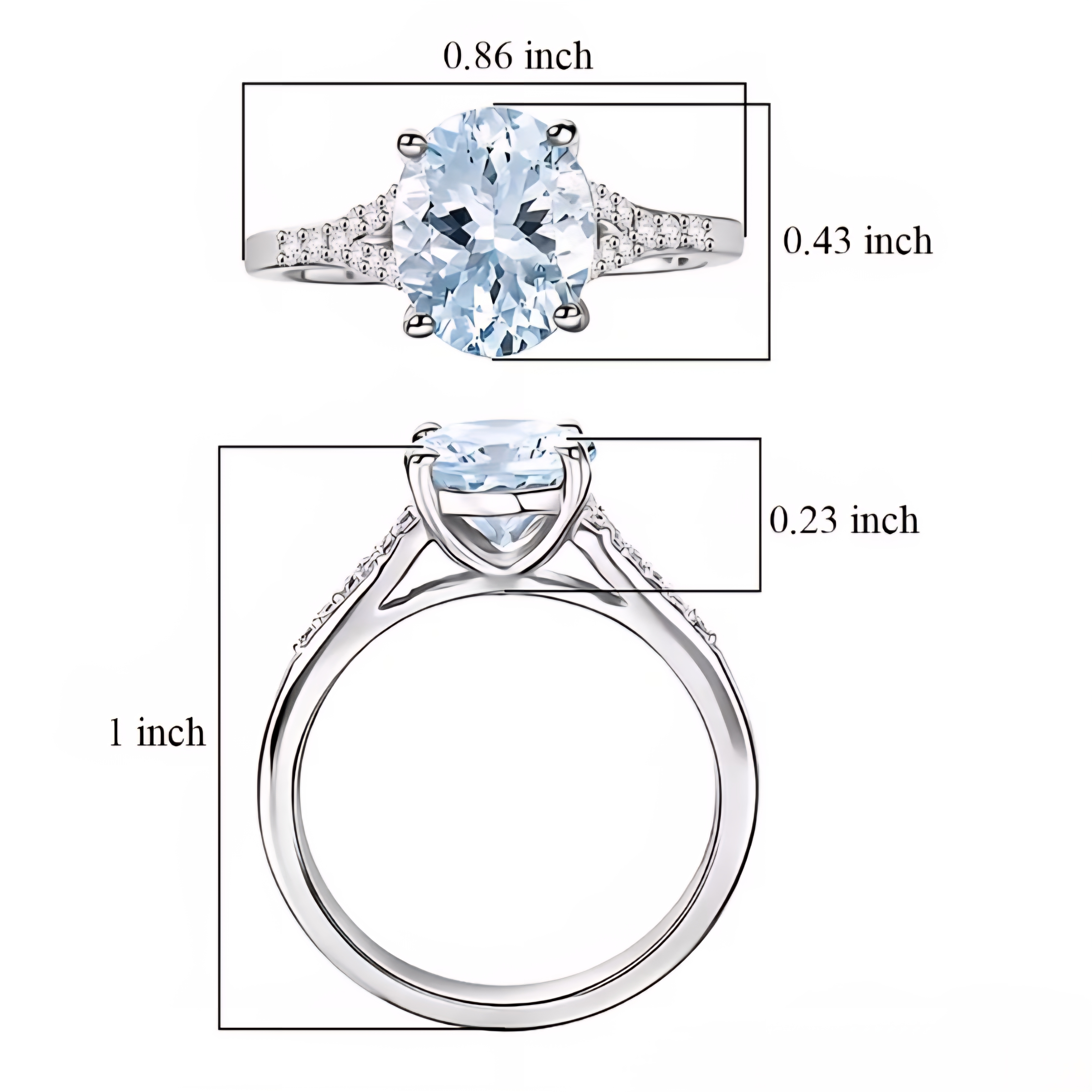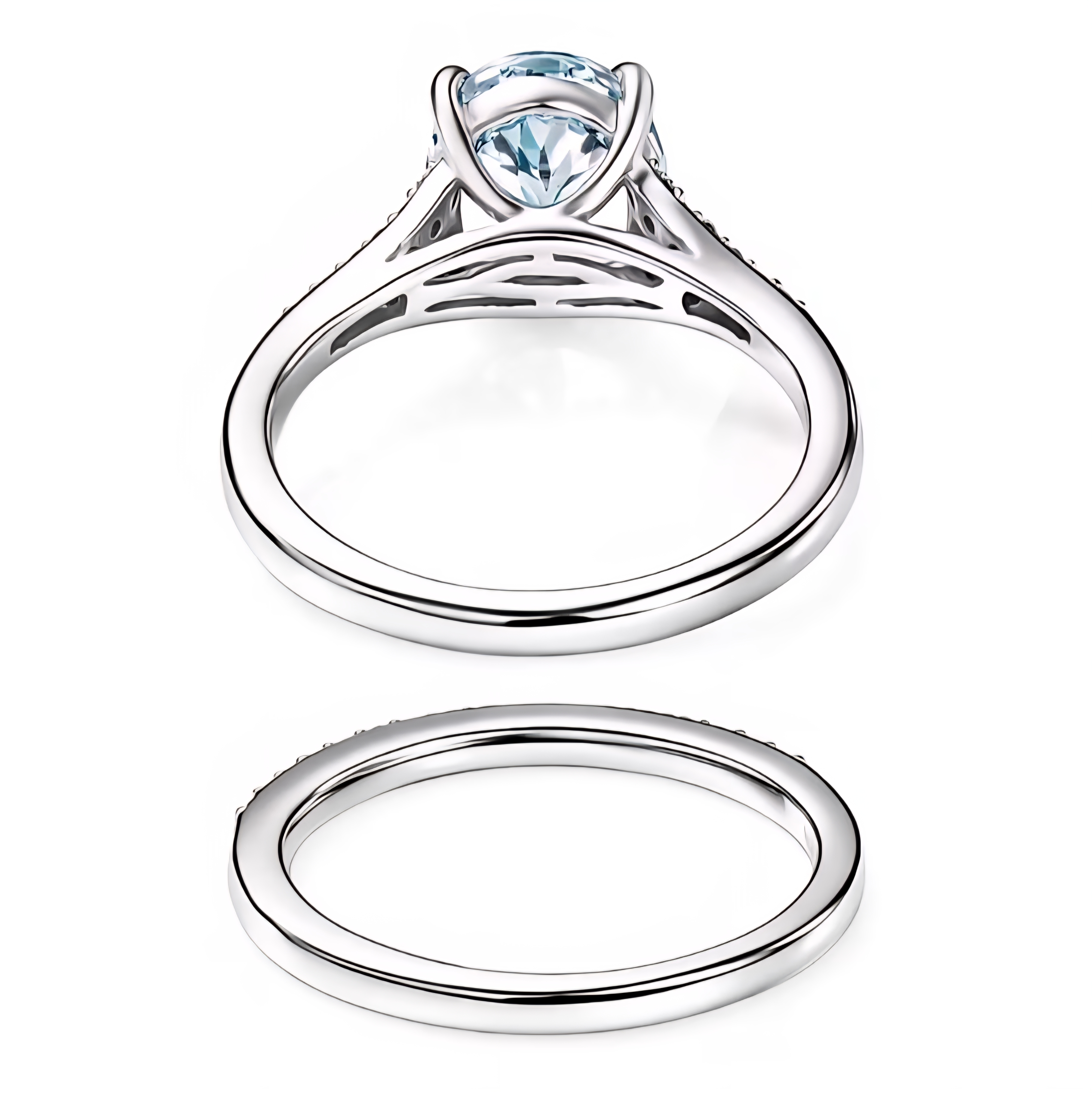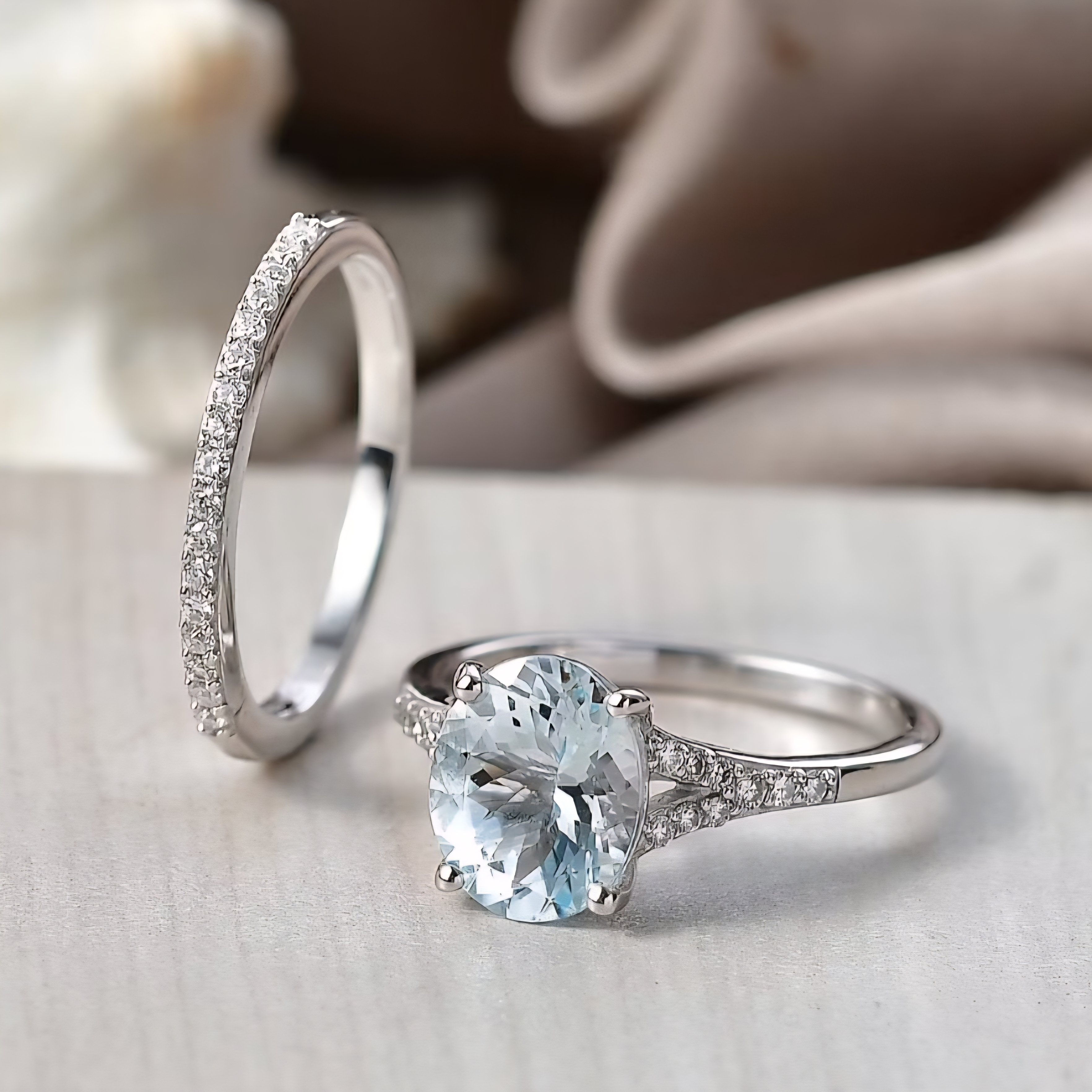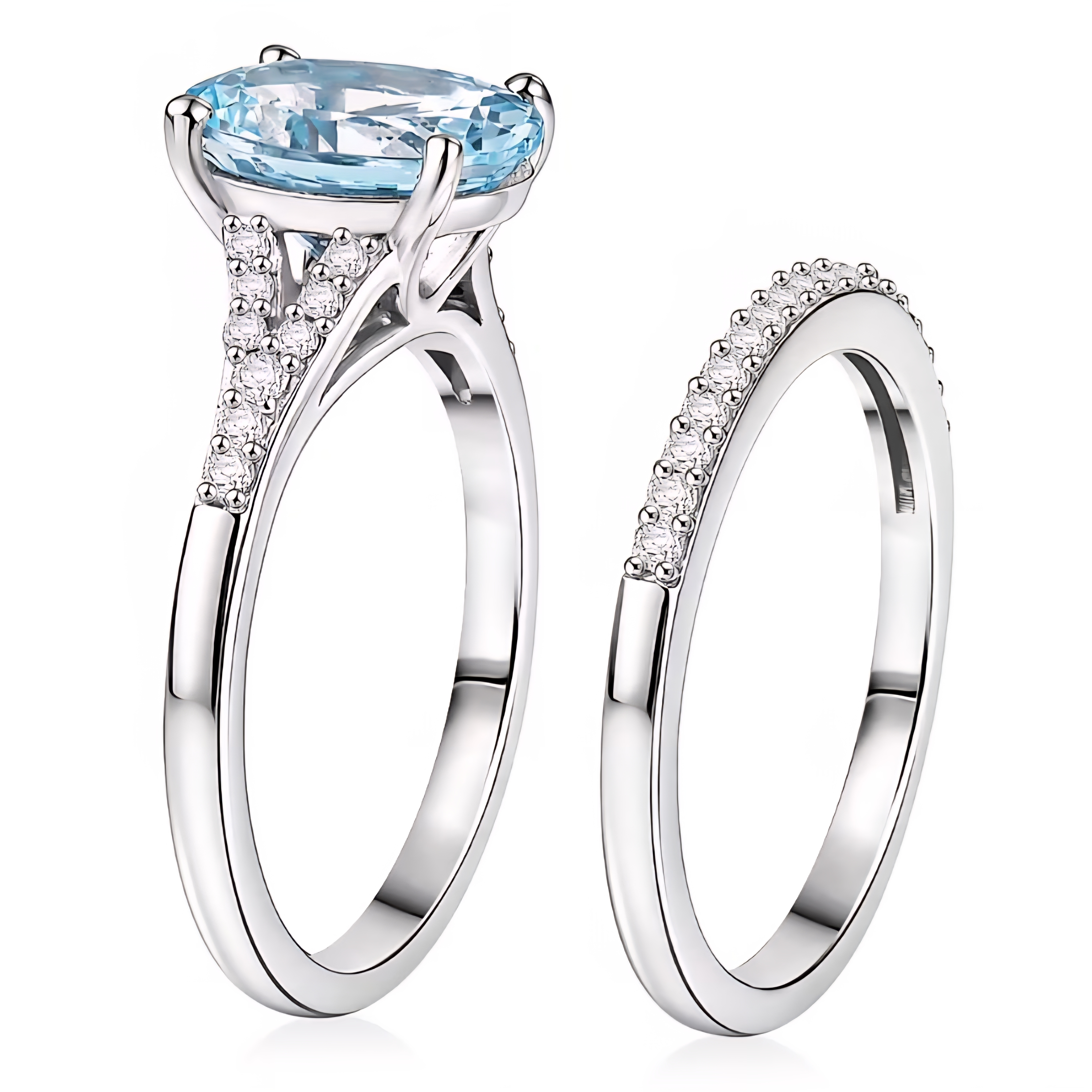 Elegant proportions meet soft color in this aquamarine bridal ring set. The engagement ring centers on a 2.25 carat oval aquamarine measuring 10x8mm. Its clear blue tone reflects light beautifully, giving the stone a crisp, luminous appearance that stands out against the cool rhodium finish.