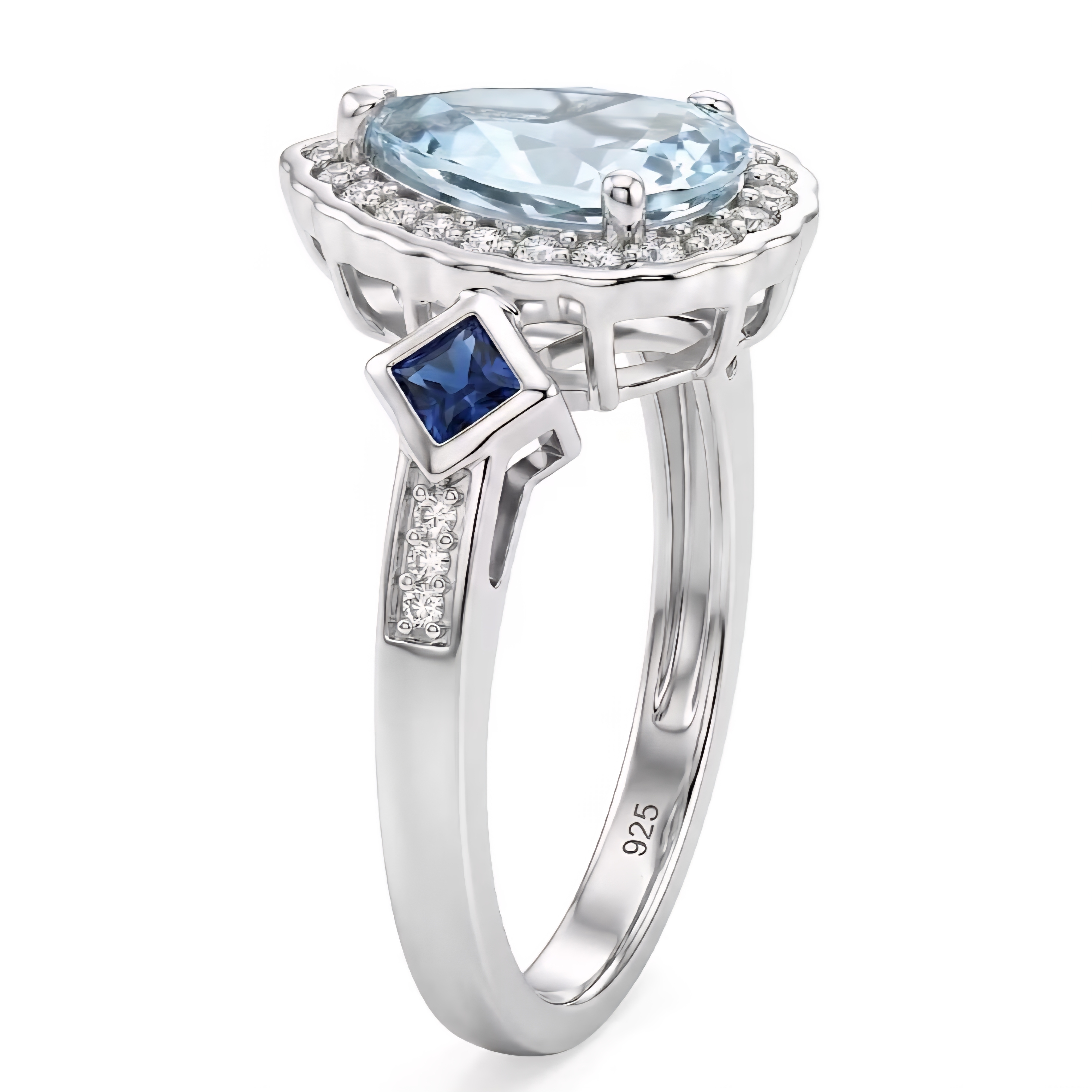 Crafted in solid 925 sterling silver and finished with rhodium plating, the ring has a bright white metal finish that complements the cool tones of the aquamarine and sapphires. A refined halo design that combines color, brilliance, and classic proportions.