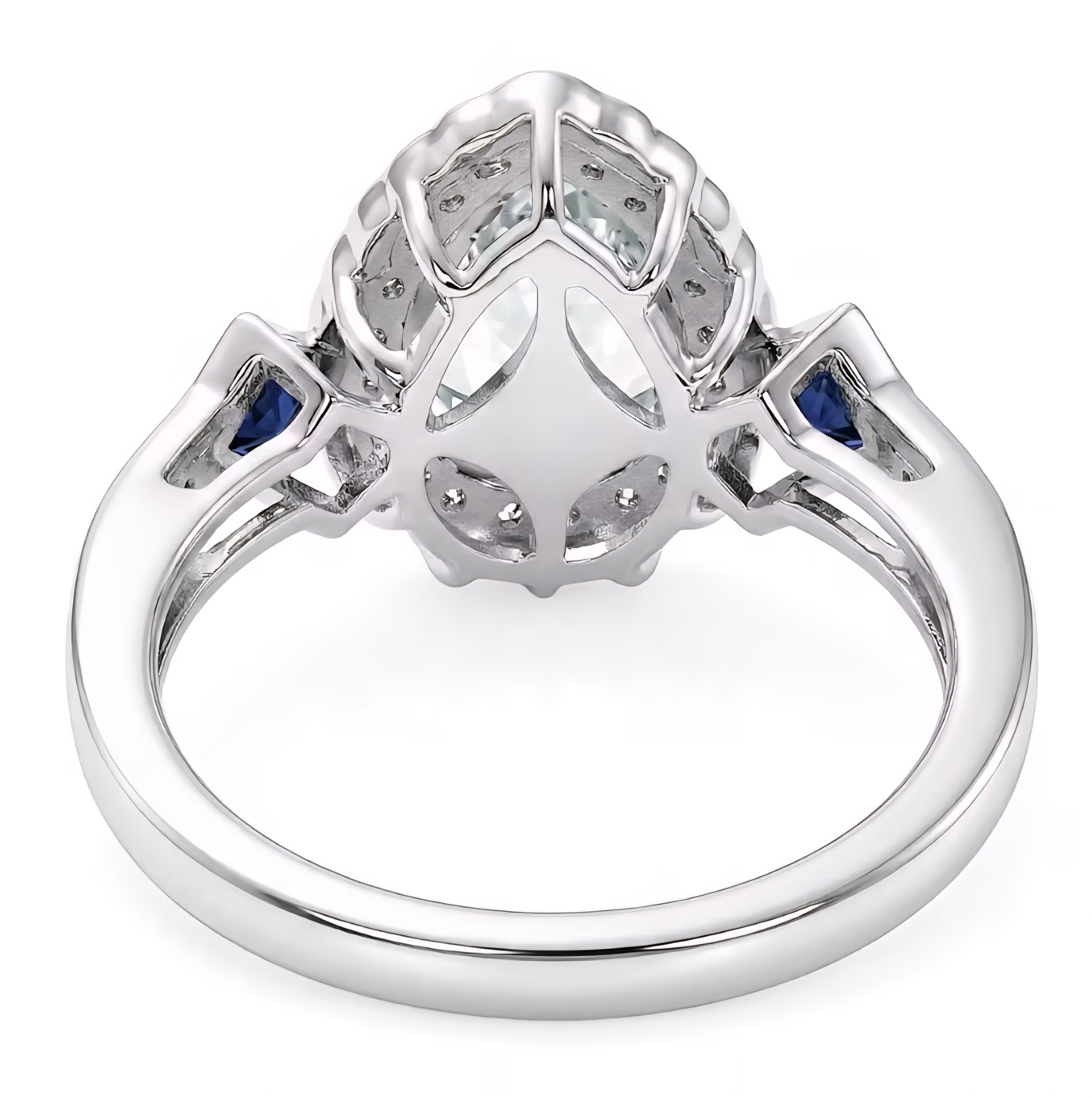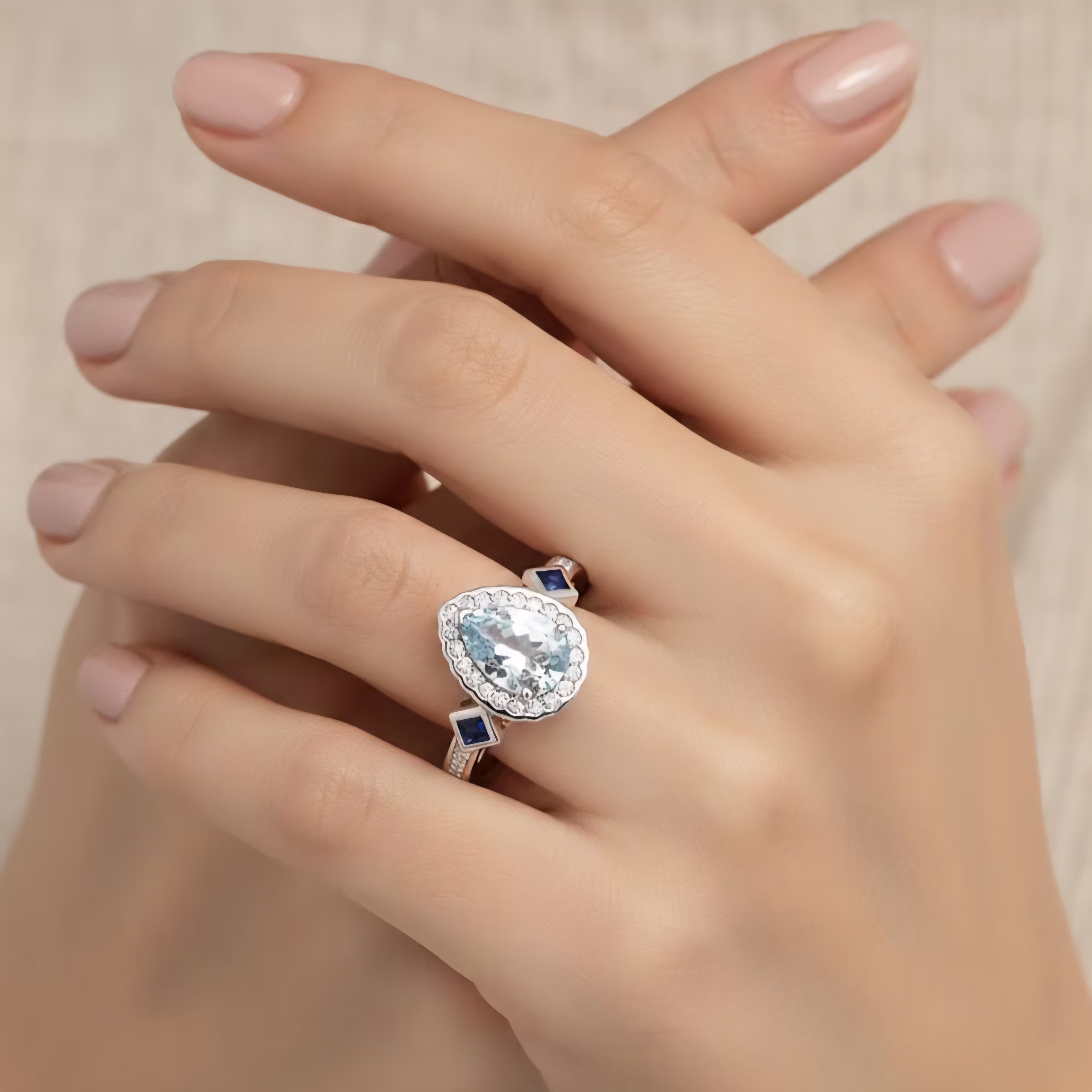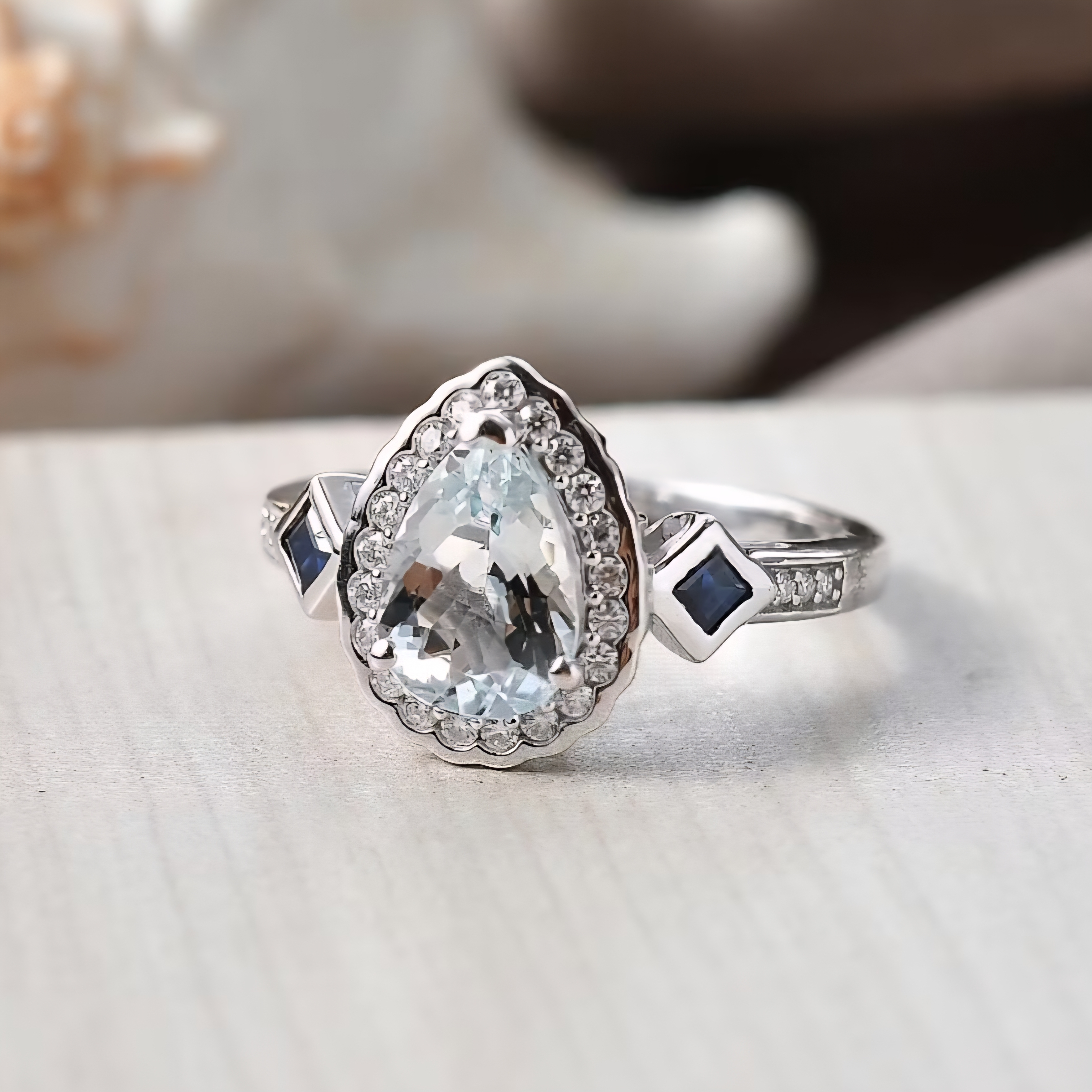A halo of colorless moissanite surrounds the aquamarine, adding refined sparkle and enhancing the overall size and presence of the center stone. On each shoulder, deep blue square-cut sapphires introduce rich contrast and balance to the composition. Additional moissanite accents along the band provide extra brilliance while maintaining a clean, elegant structure.