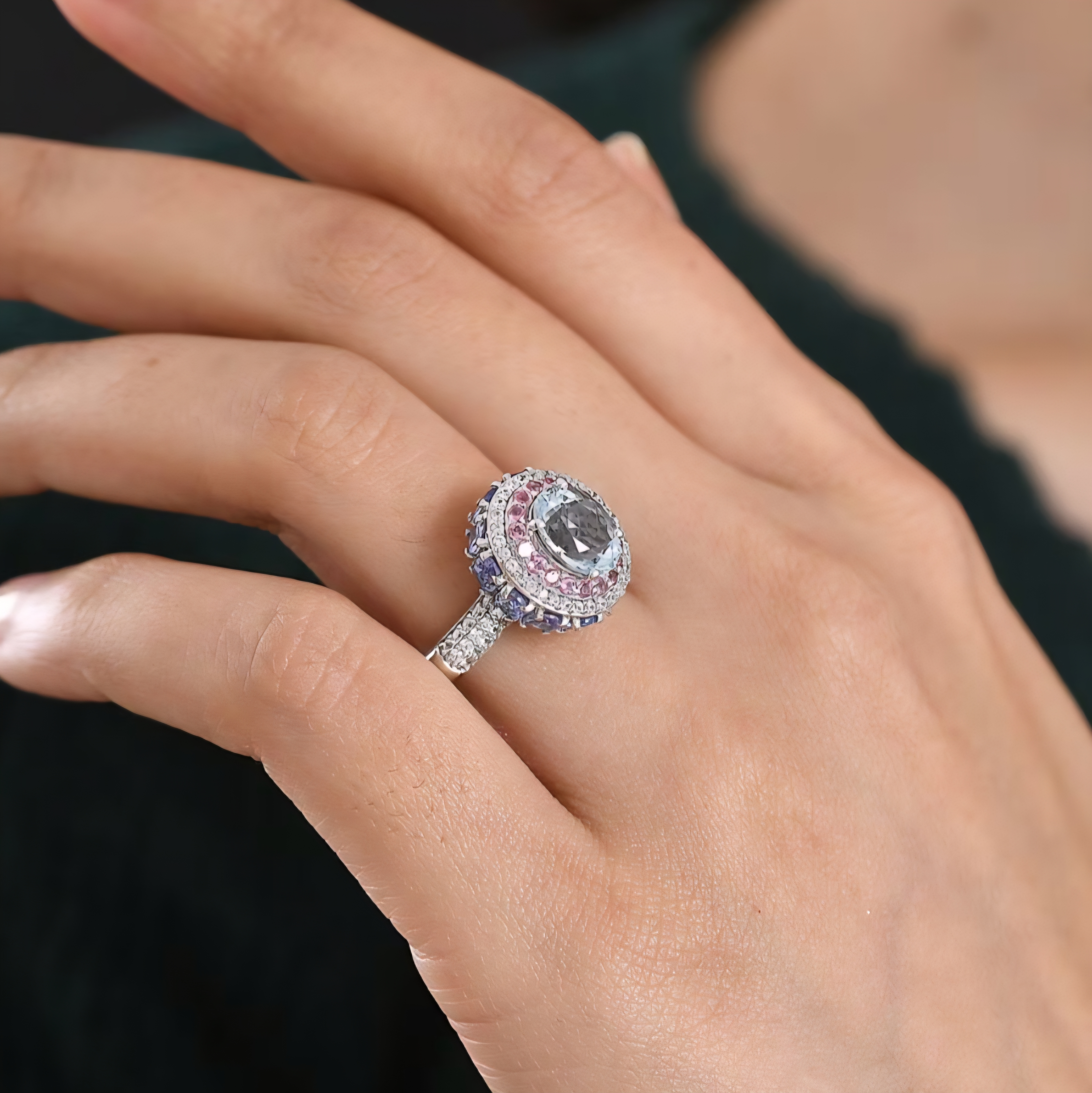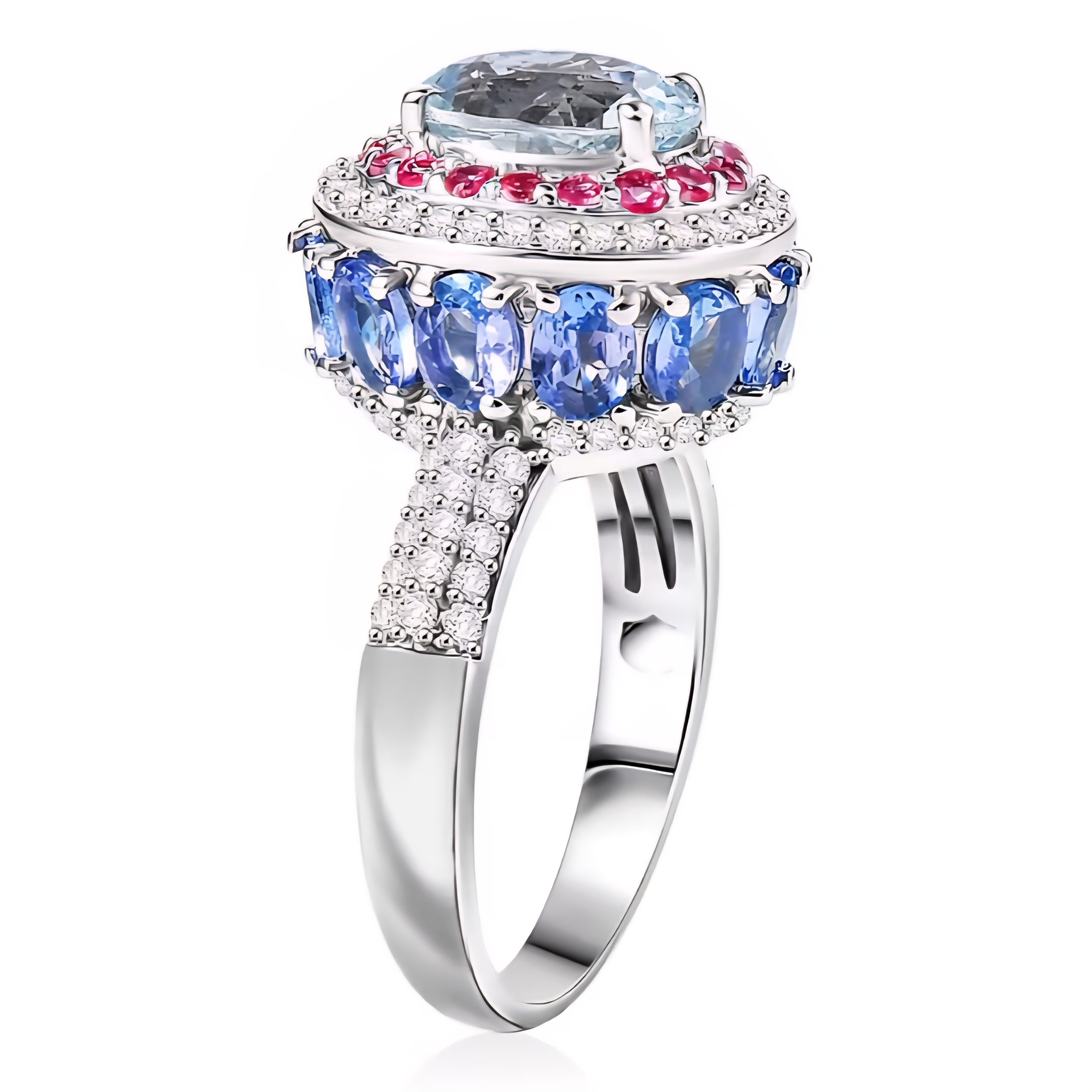 Encircling the aquamarine is a vivid halo of rubellite tourmaline, adding rich pink red contrast that makes the center stone stand out even more. A sparkling ring of white zircon enhances the brilliance, while deep blue tanzanite gemstones wrap around the outer halo and continue along the sides of the ring. The layered gemstone design creates color, sparkle, and dimension from every viewing angle.