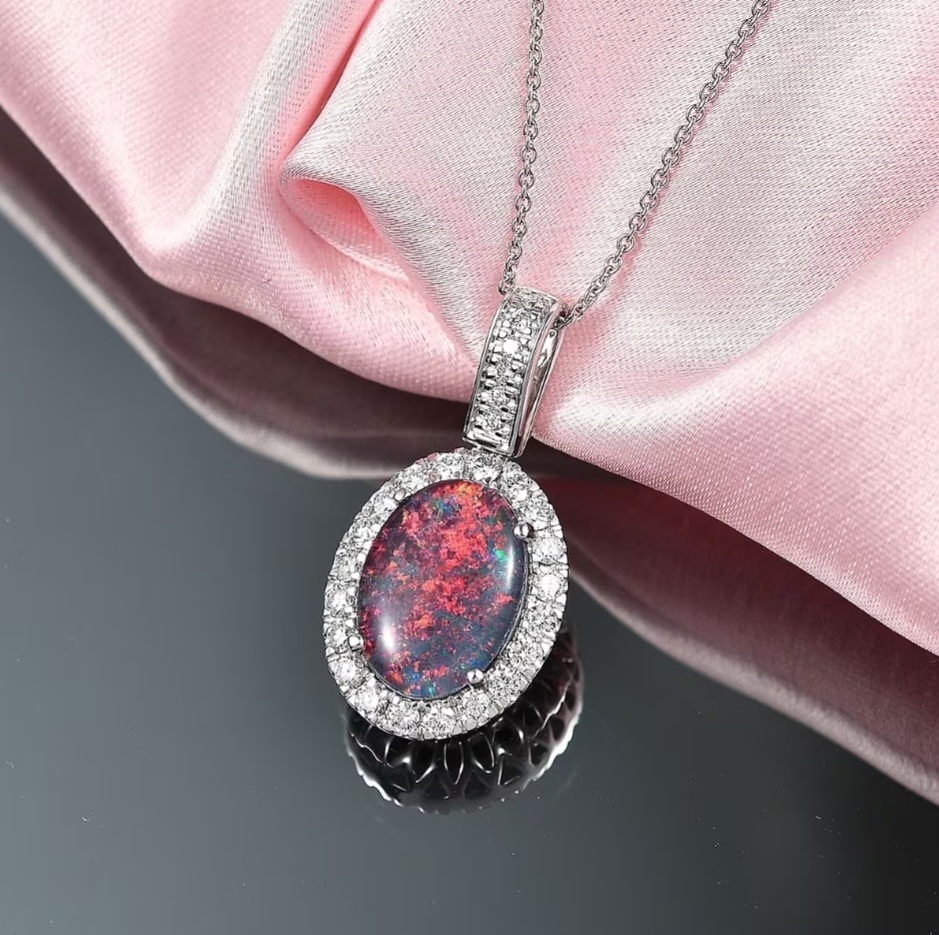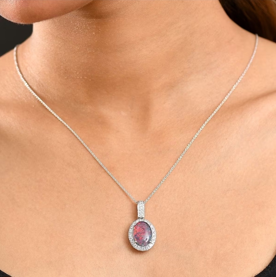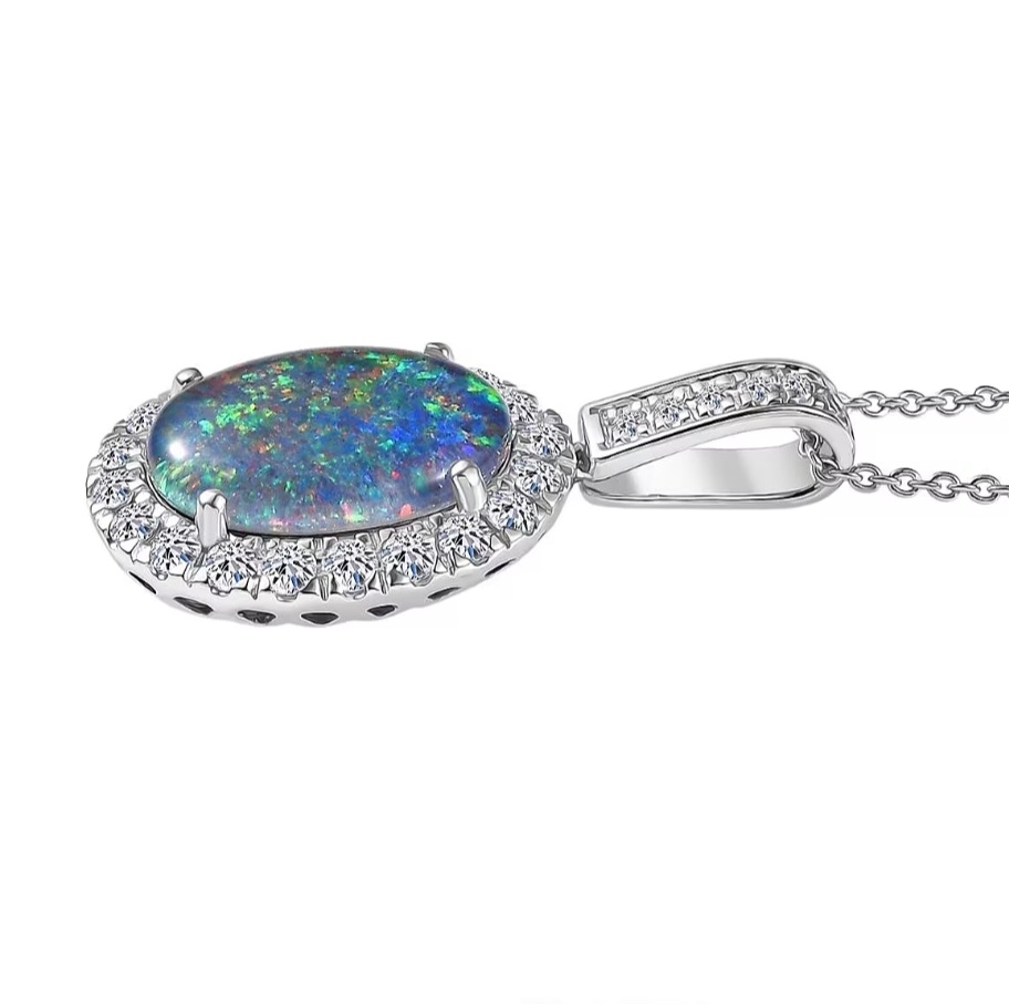 An opal that burns with lightning. At the heart of this pendant, a 14×10mm Australian boulder opal triplet cabochon (3.40ct) surges with flashes of neon red, green, and blue across a deep body tone. Surrounding the centerpiece, a halo of lab-grown diamonds (0.82ctw) radiates brilliance, bringing fire to every flicker of light. Cast in solid 10k white gold and finished with rhodium plating, this necklace is refined yet electric. A versatile oval halo design, suspended on your choice of chain with a secure lobster claw clasp, makes this the perfect everyday signature or a spotlight-ready treasure.