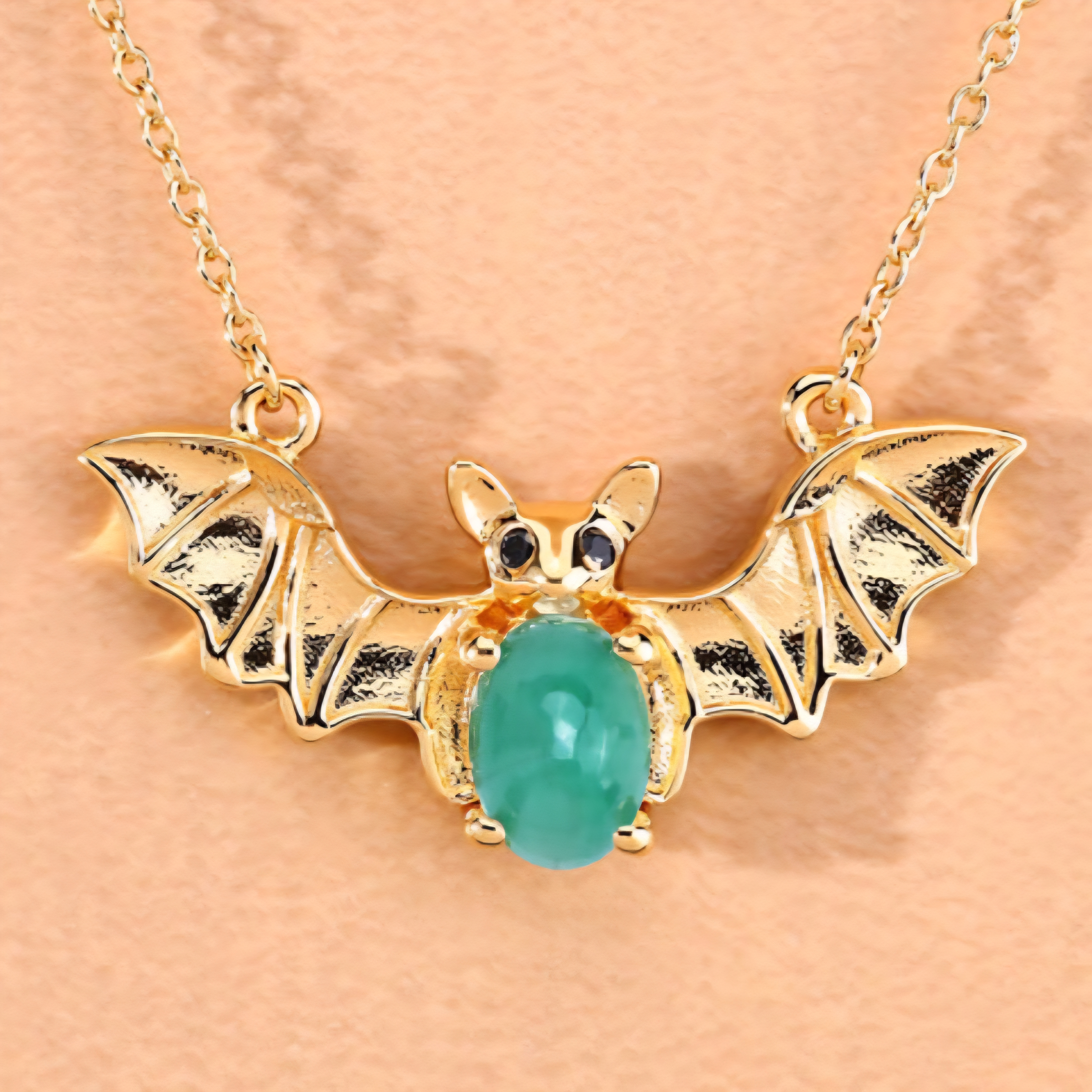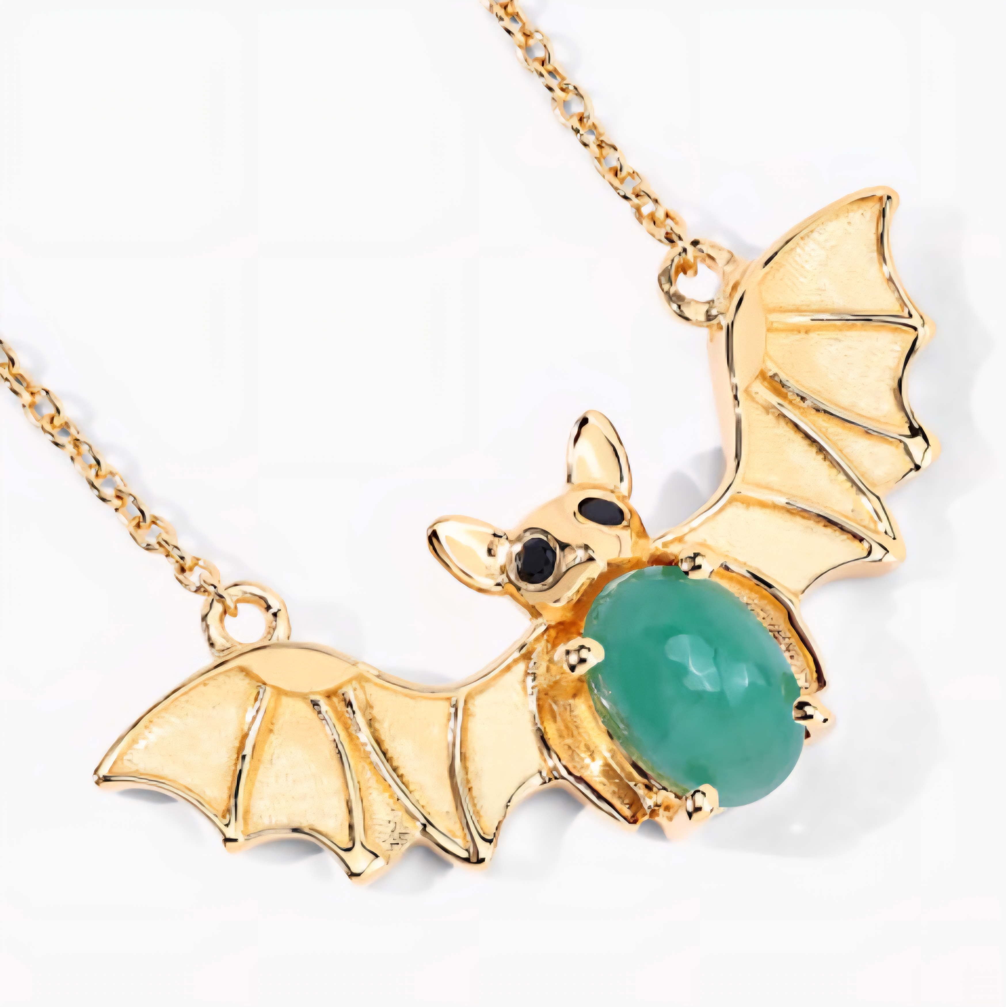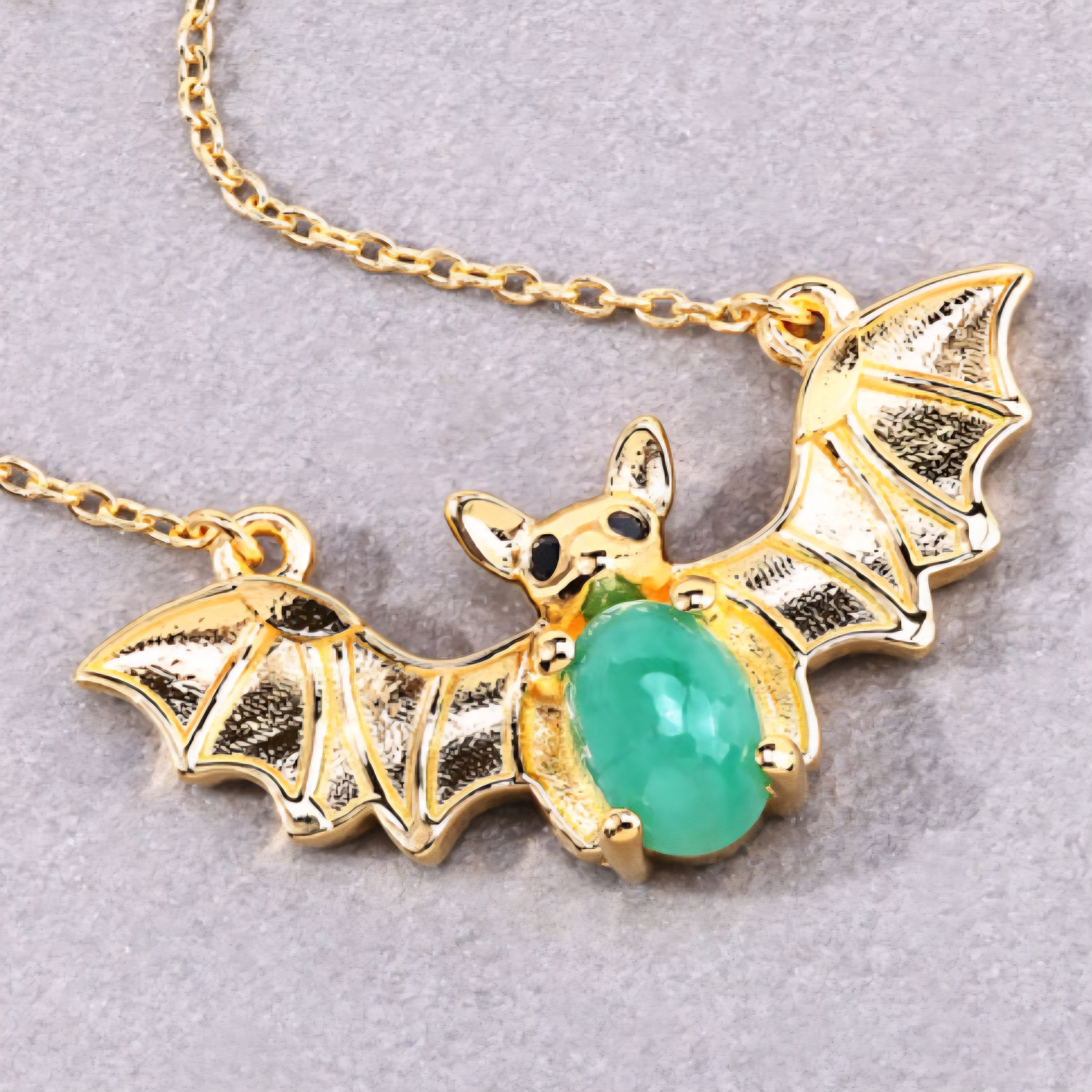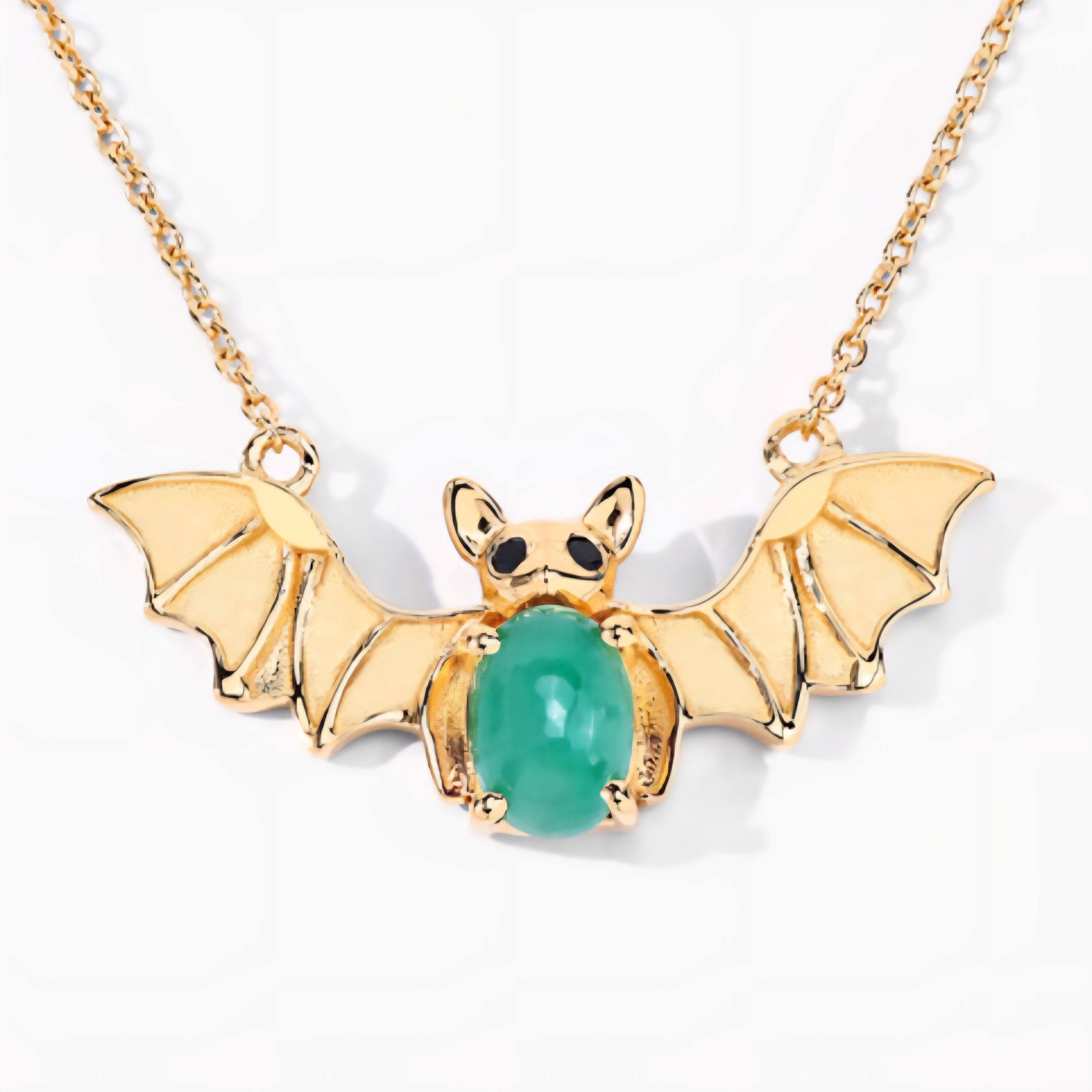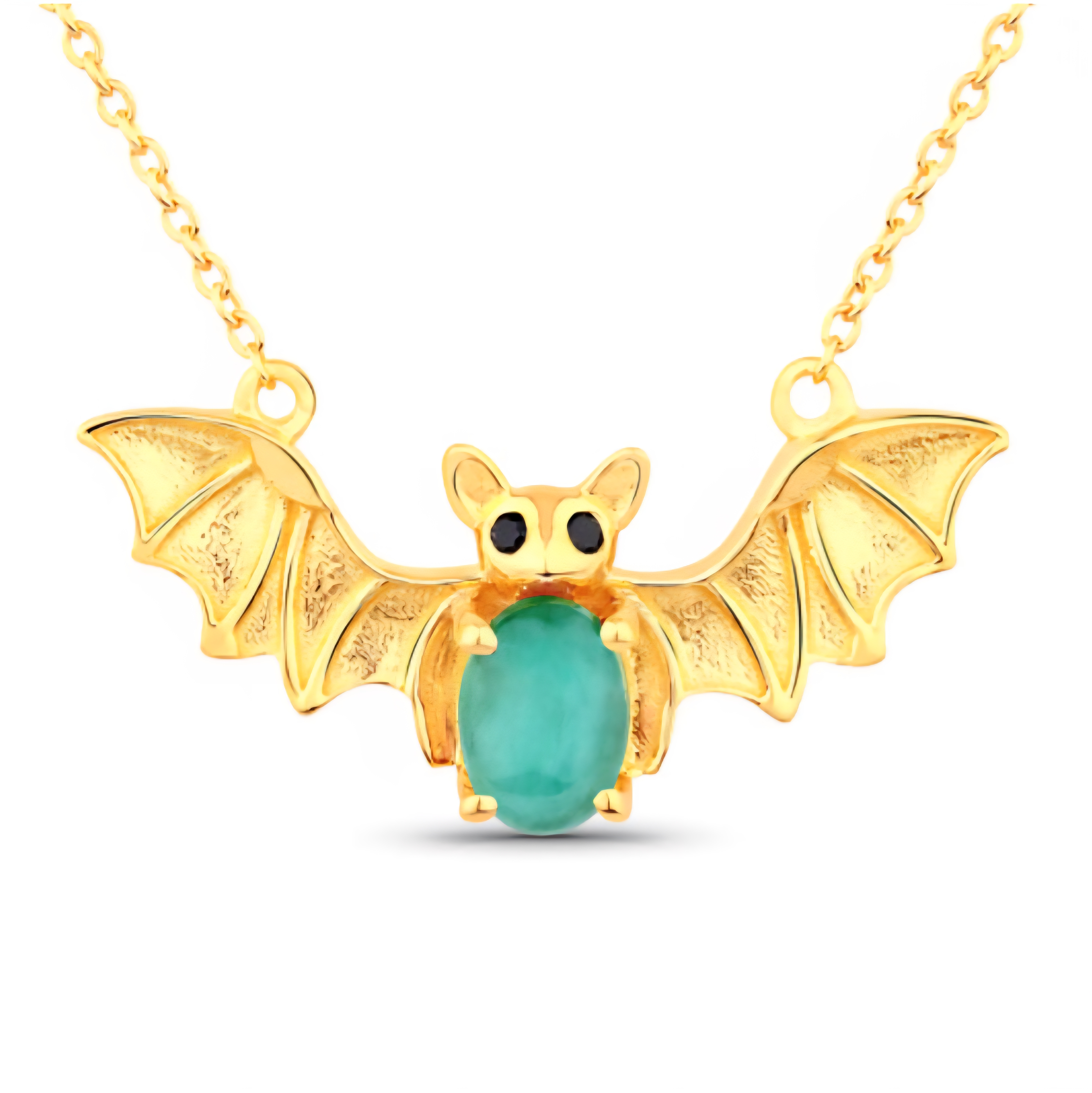Playful. Powerful. A little dangerous. This emerald bat pendant necklace brings a flash of color to the dark side — a glowing 7x5mm green cabochon emerald forms the body, framed by sculpted gold-plated wings and black spinel eyes. Crafted from solid 925 sterling silver and finished in 18K yellow gold, it’s a perfect mix of eerie elegance and luxury craftsmanship. Vivid green. Midnight details. Pure personality.
