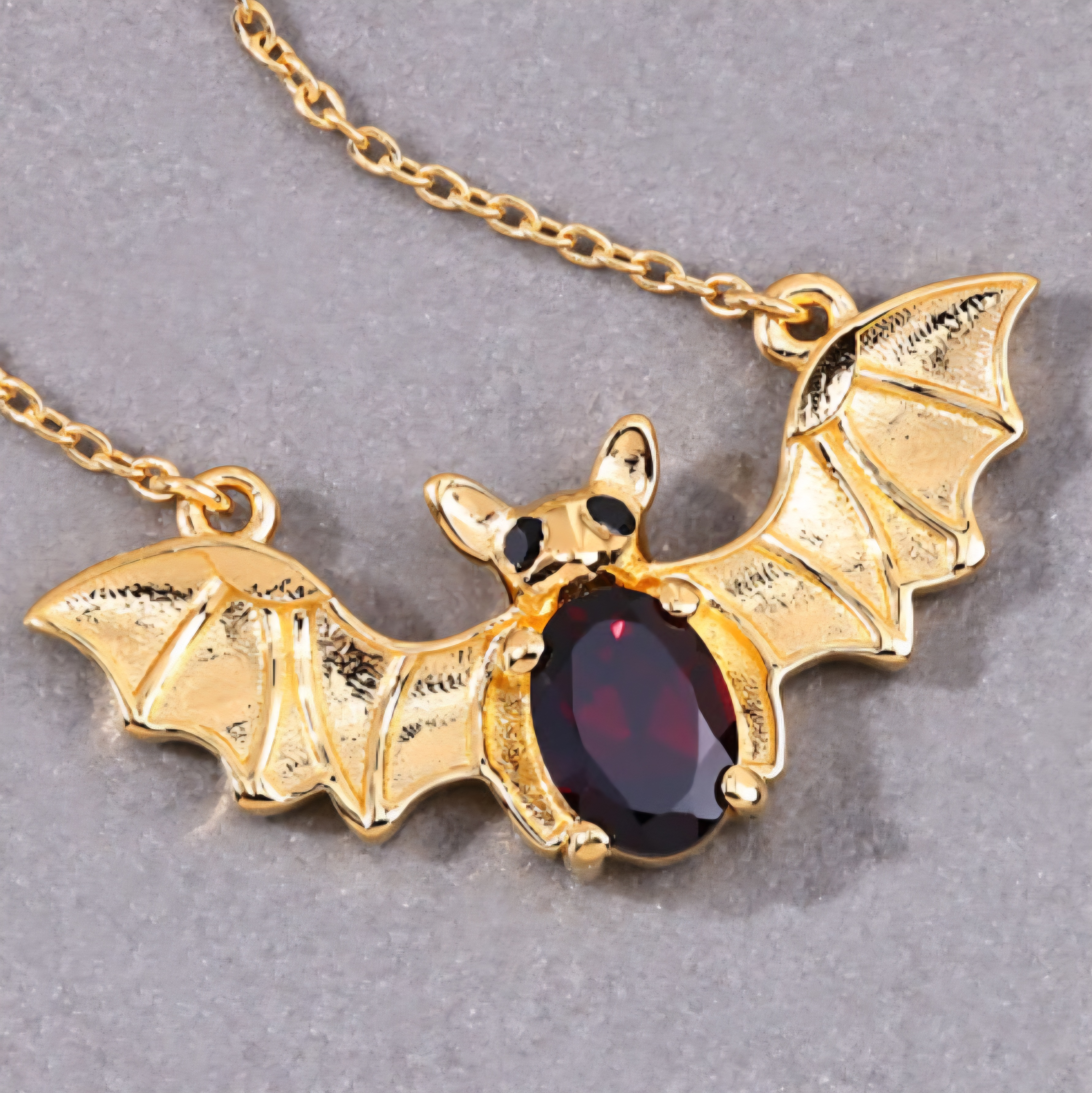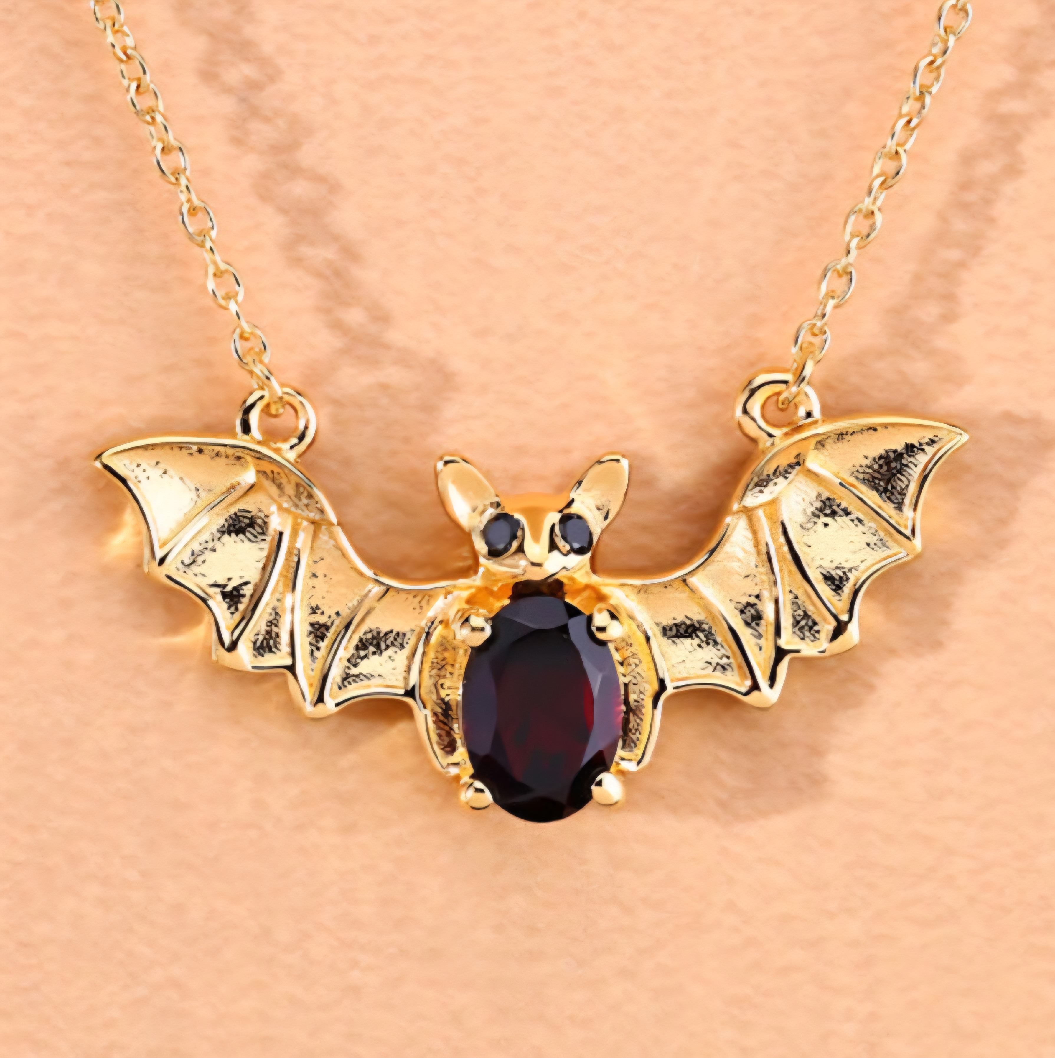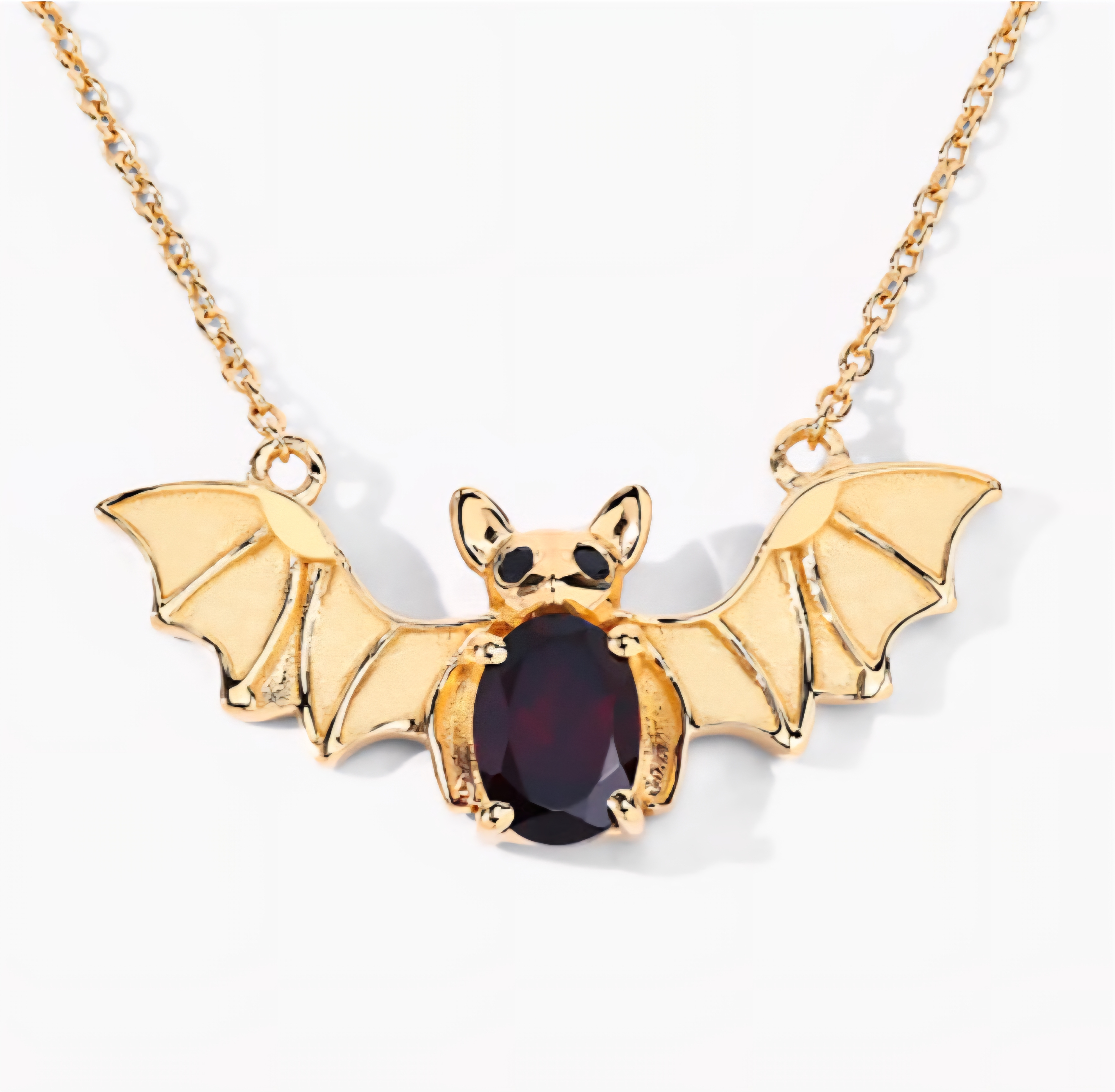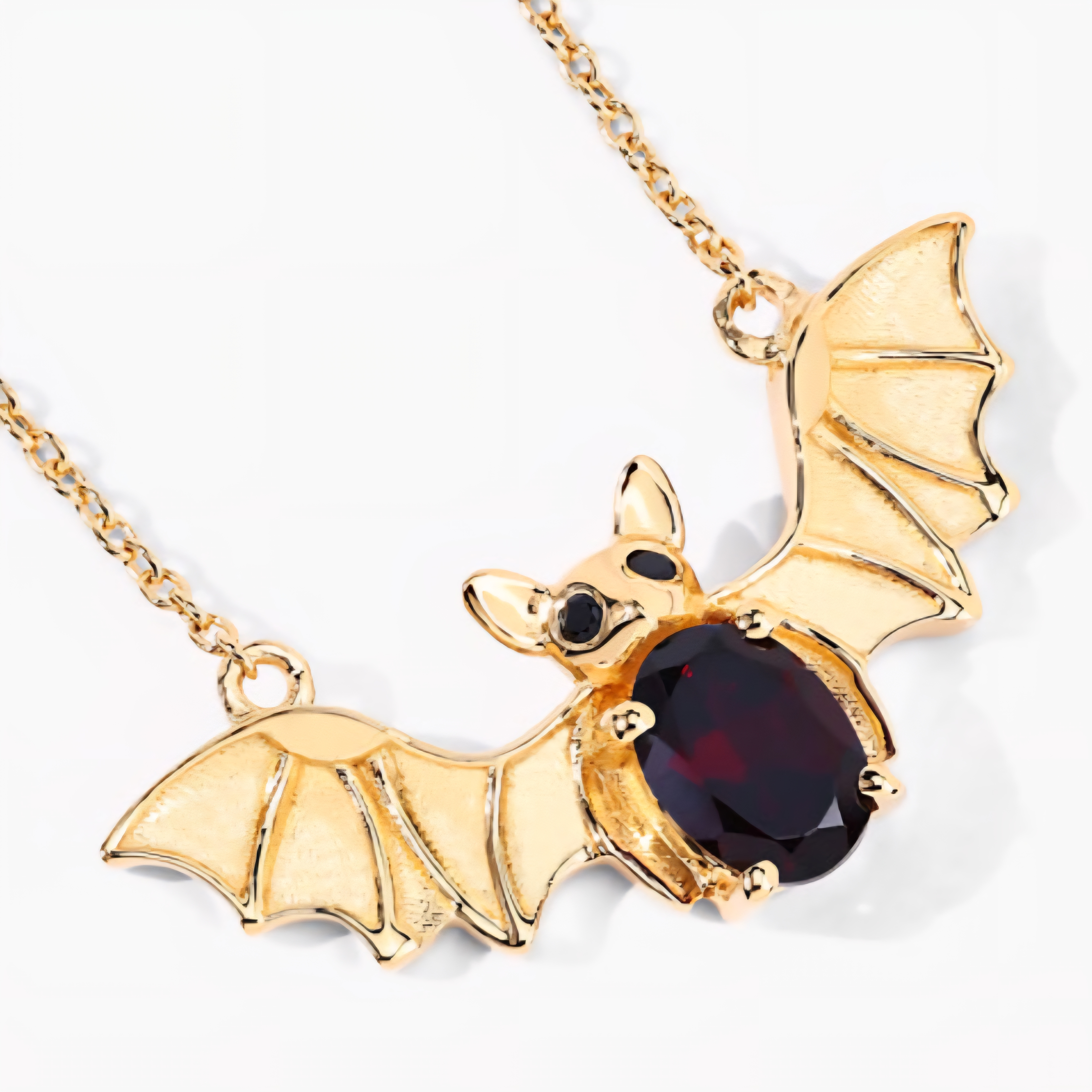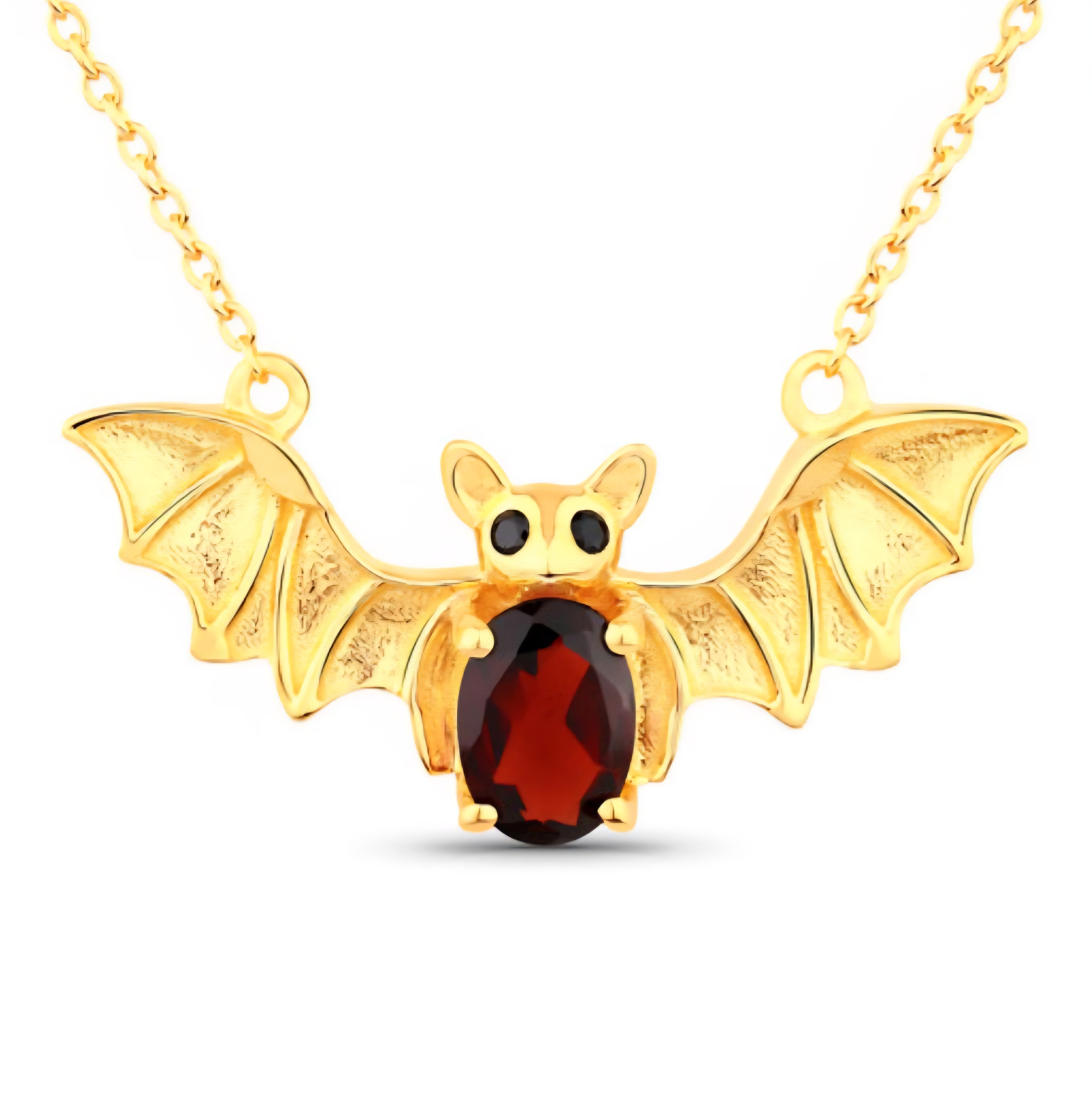 A little gothic. A lot of gold. This bat pendant necklace brings red fire and bold design together — a rich 7x5mm oval garnet forms the heart of the bat, framed by sculpted gold-plated wings and black spinel eyes. Crafted in solid 925 sterling silver and drenched in 18K yellow gold, this piece blends dark fantasy with pure luxury energy. The perfect mix of fierce and fine.