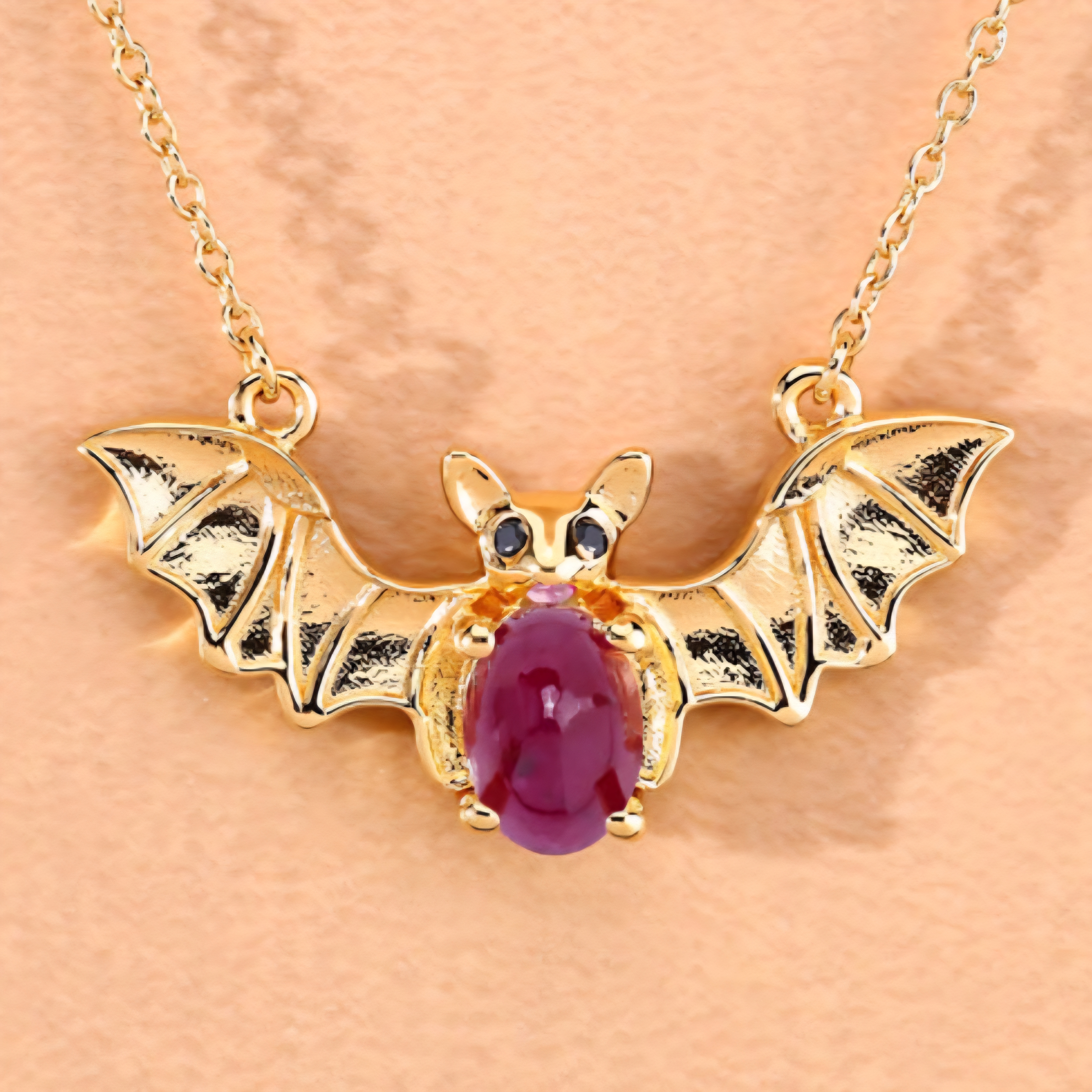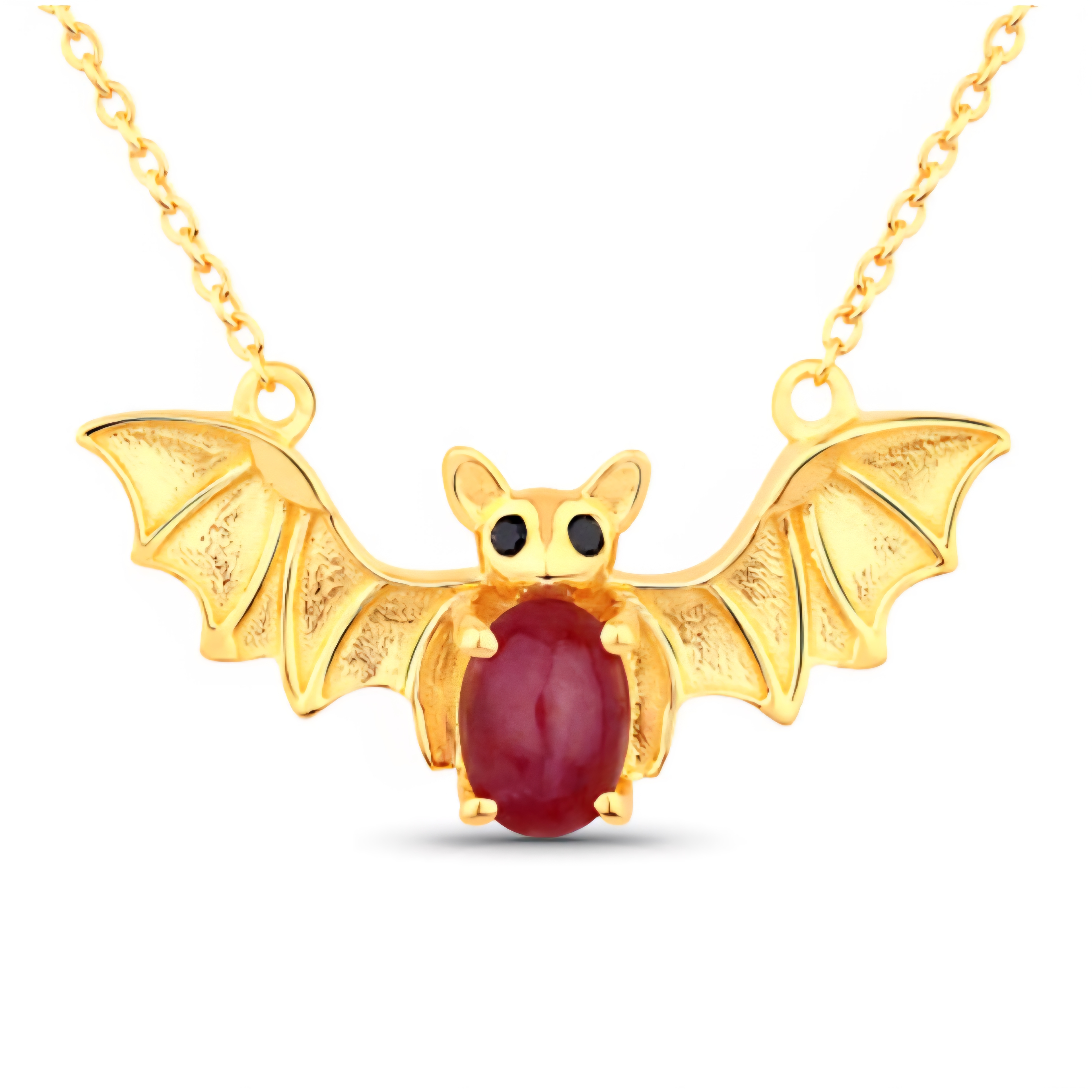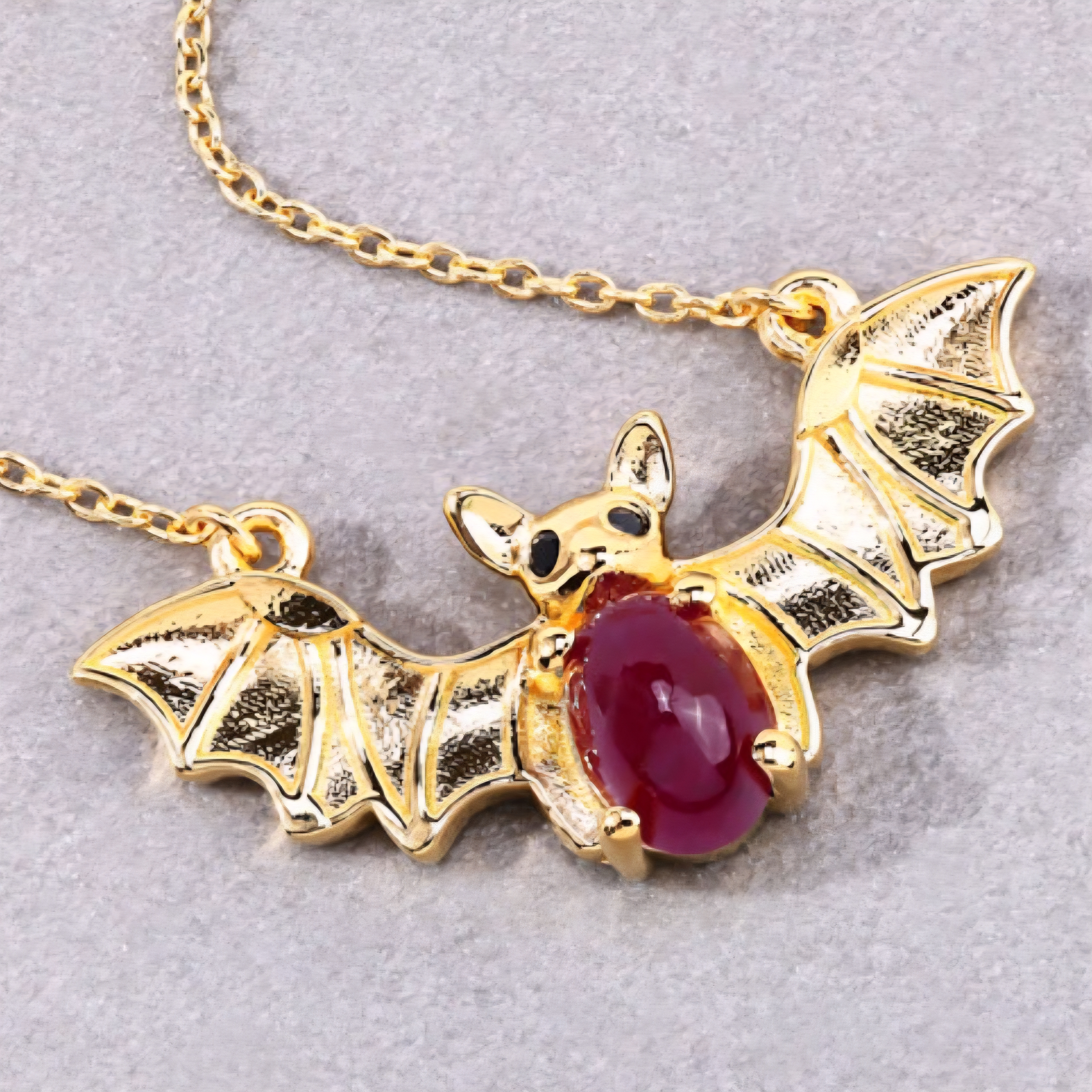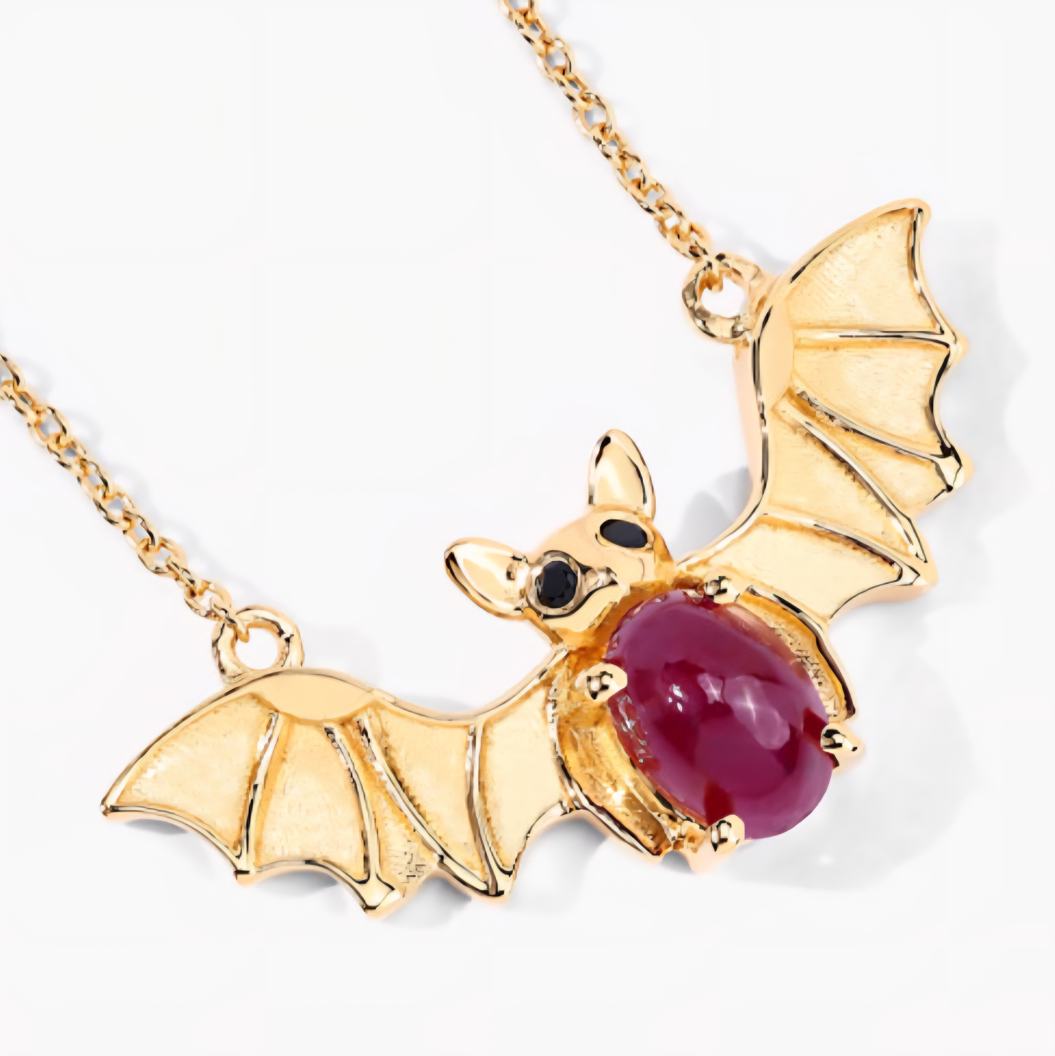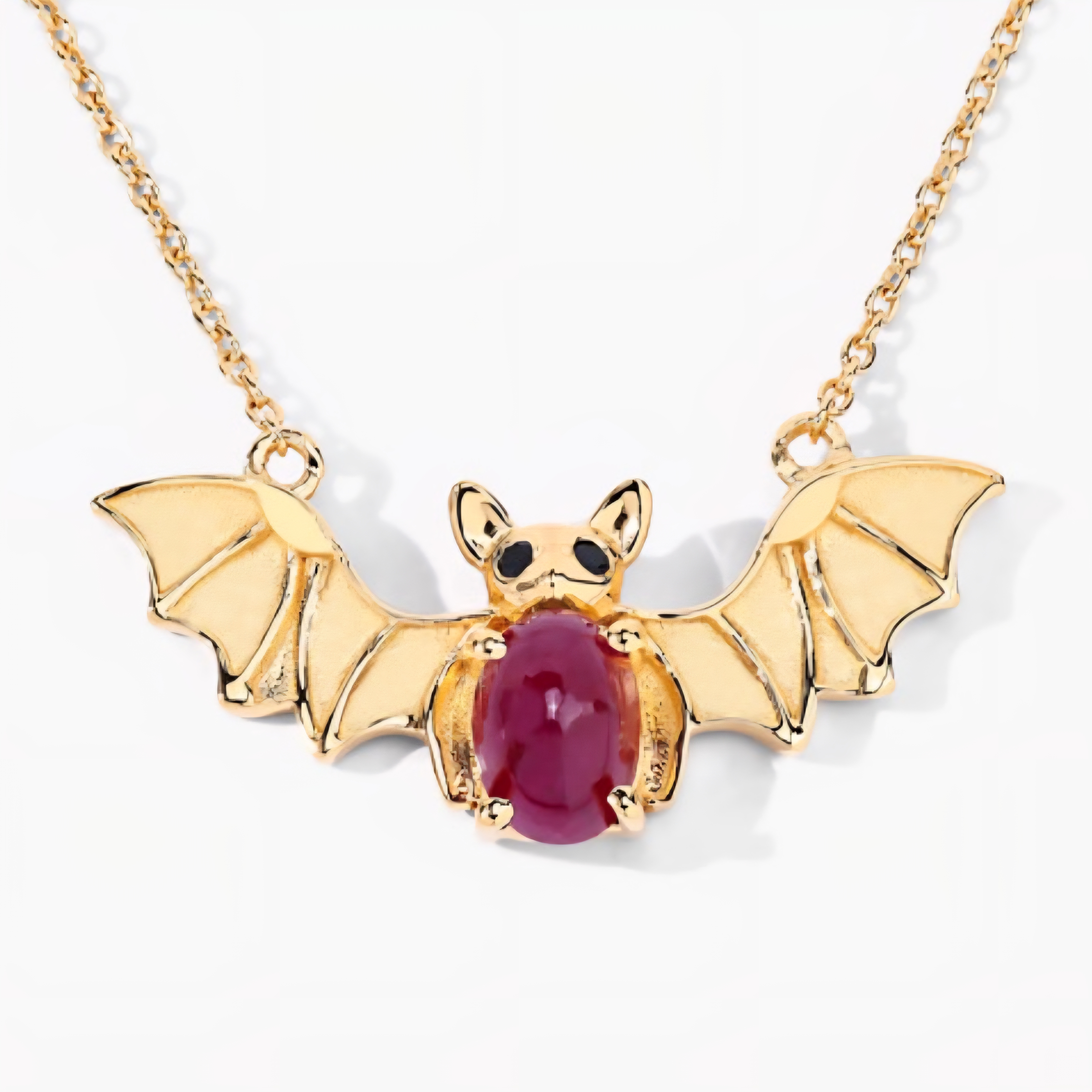 A tiny creature of the night — crafted to perfection. This gothic bat pendant necklace features a vivid 7x5mm oval cabochon Ruby as the body, glowing with deep crimson life. Jet-black spinel accents form its piercing eyes, while finely sculpted 18K gold-plated wings stretch wide in flight. Cast in solid 925 sterling silver, this piece blends eerie charm with luxury craftsmanship — equal parts spooky and stunning. Daring, dramatic, and darkly adorable.