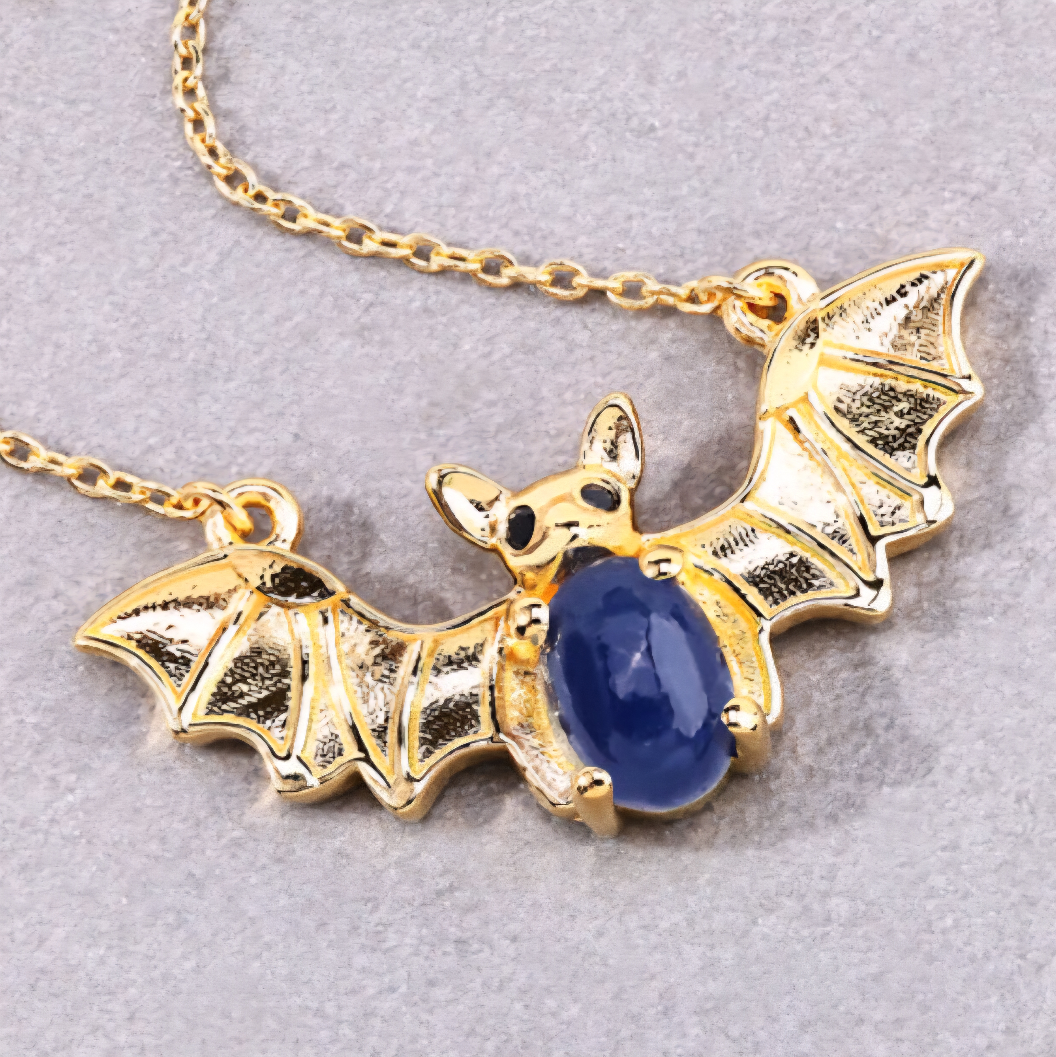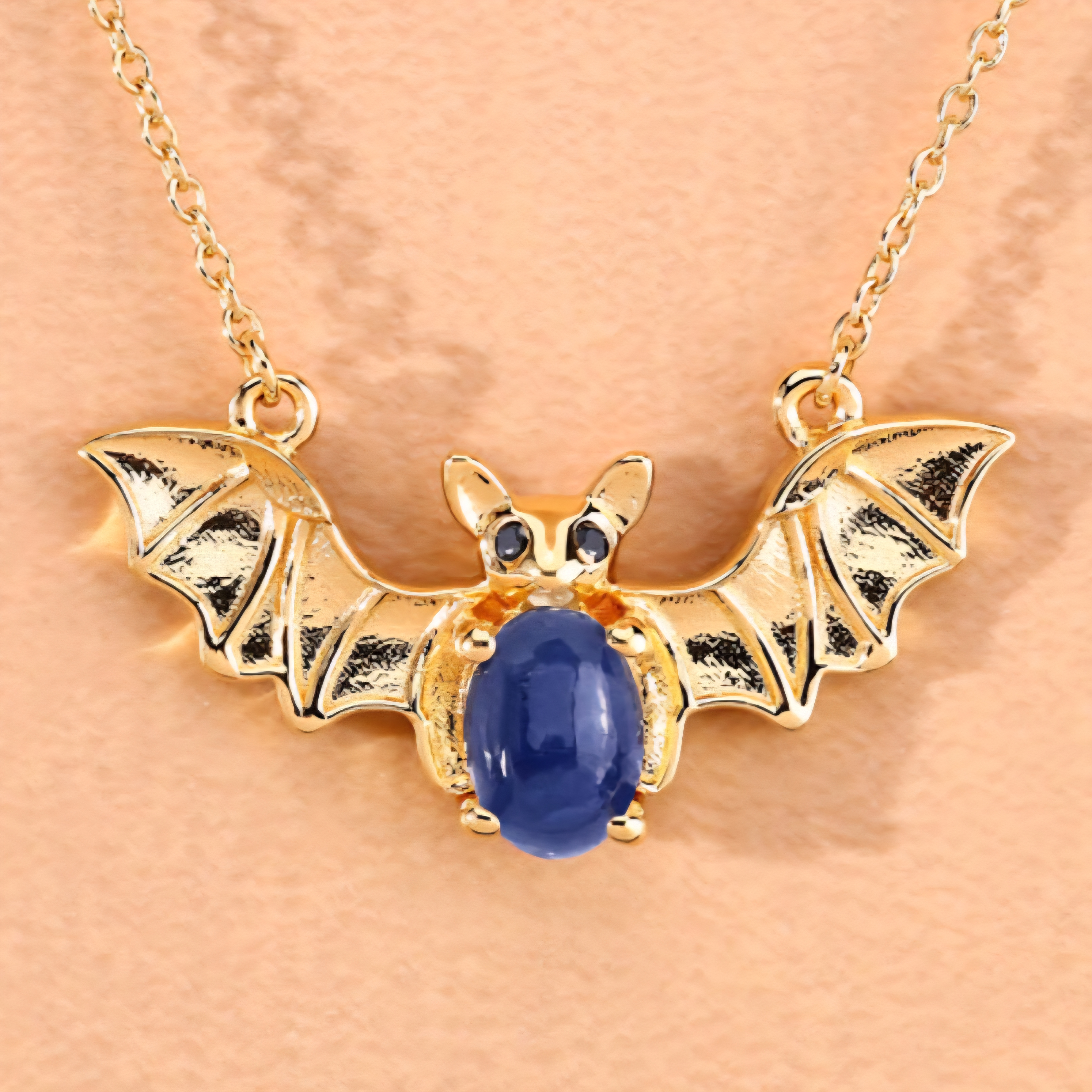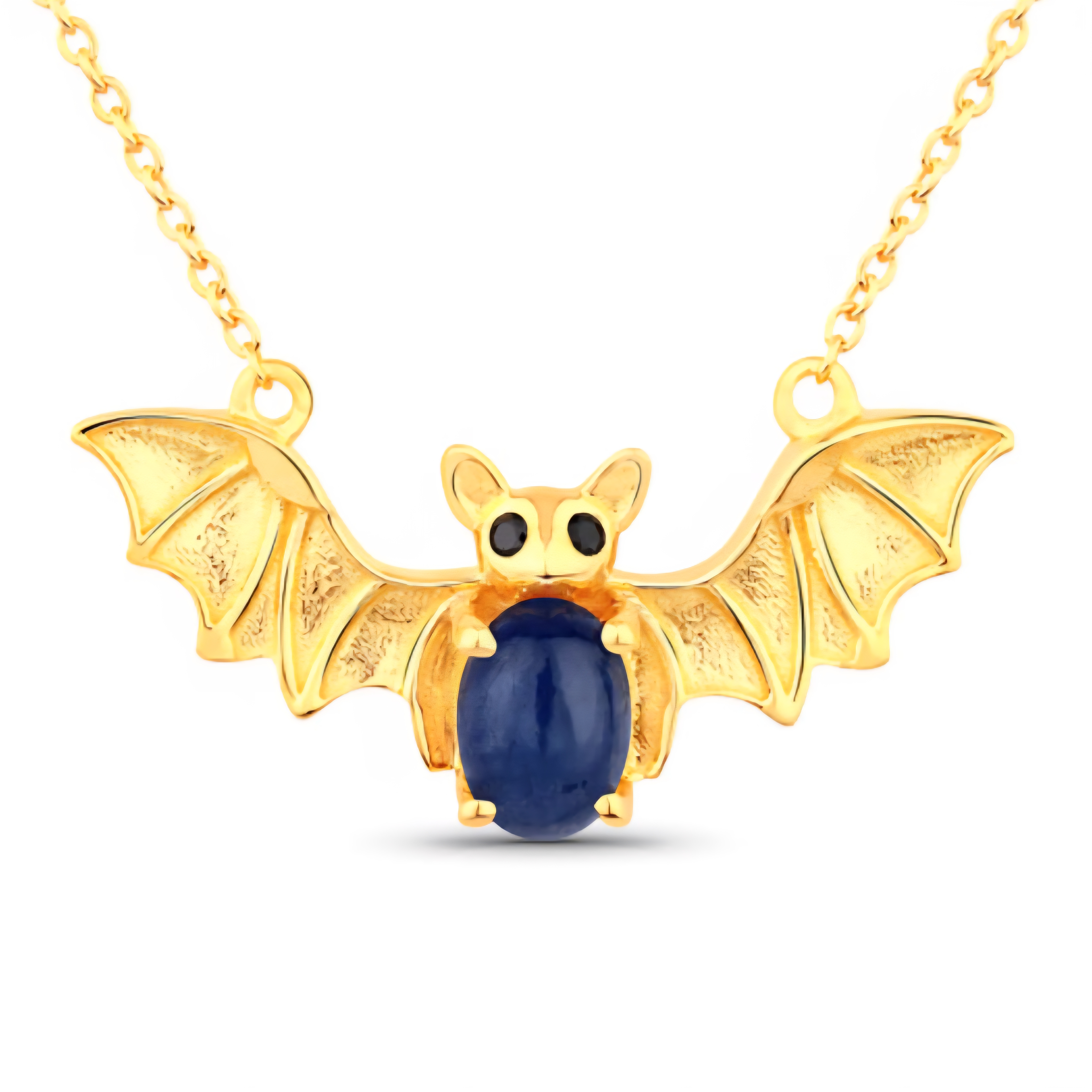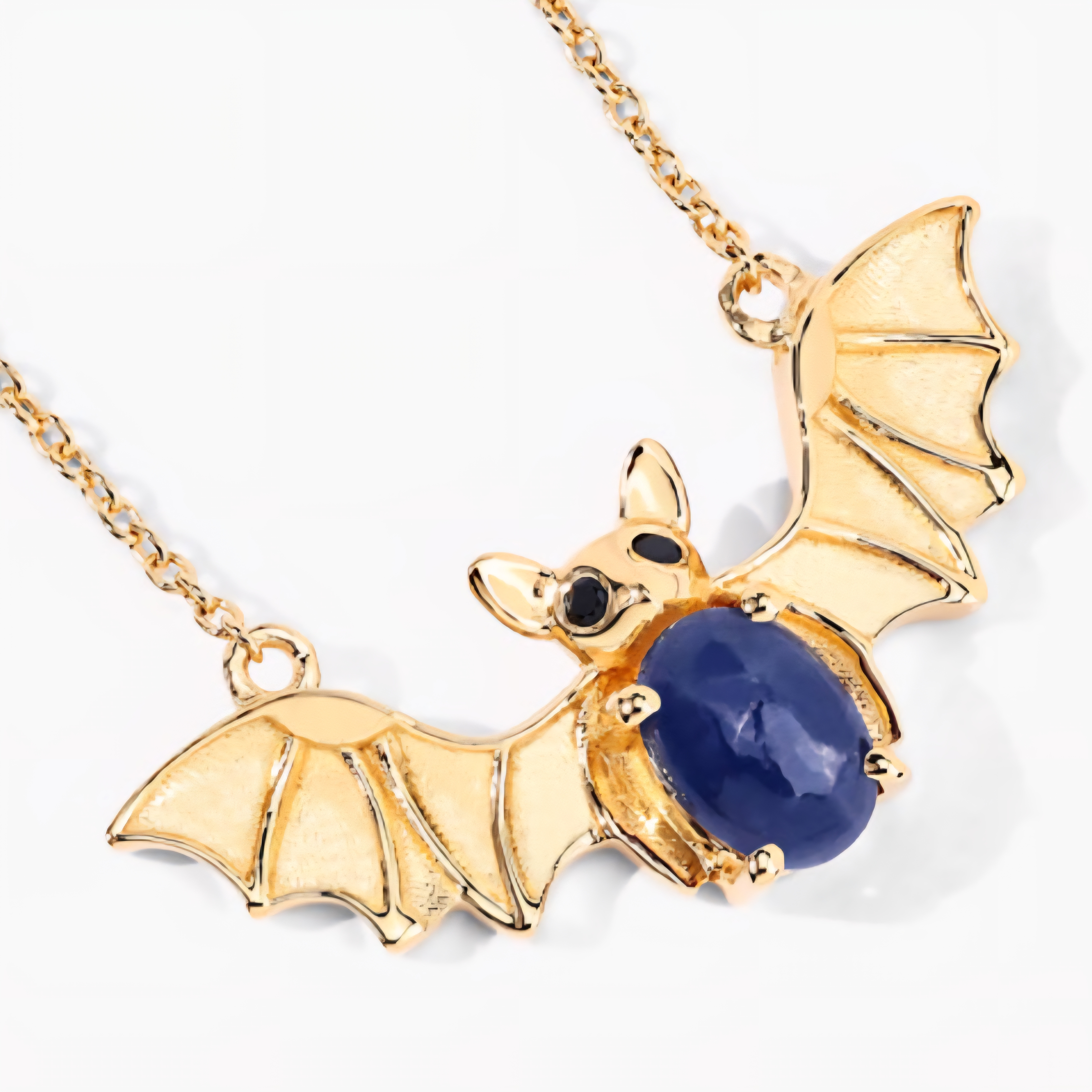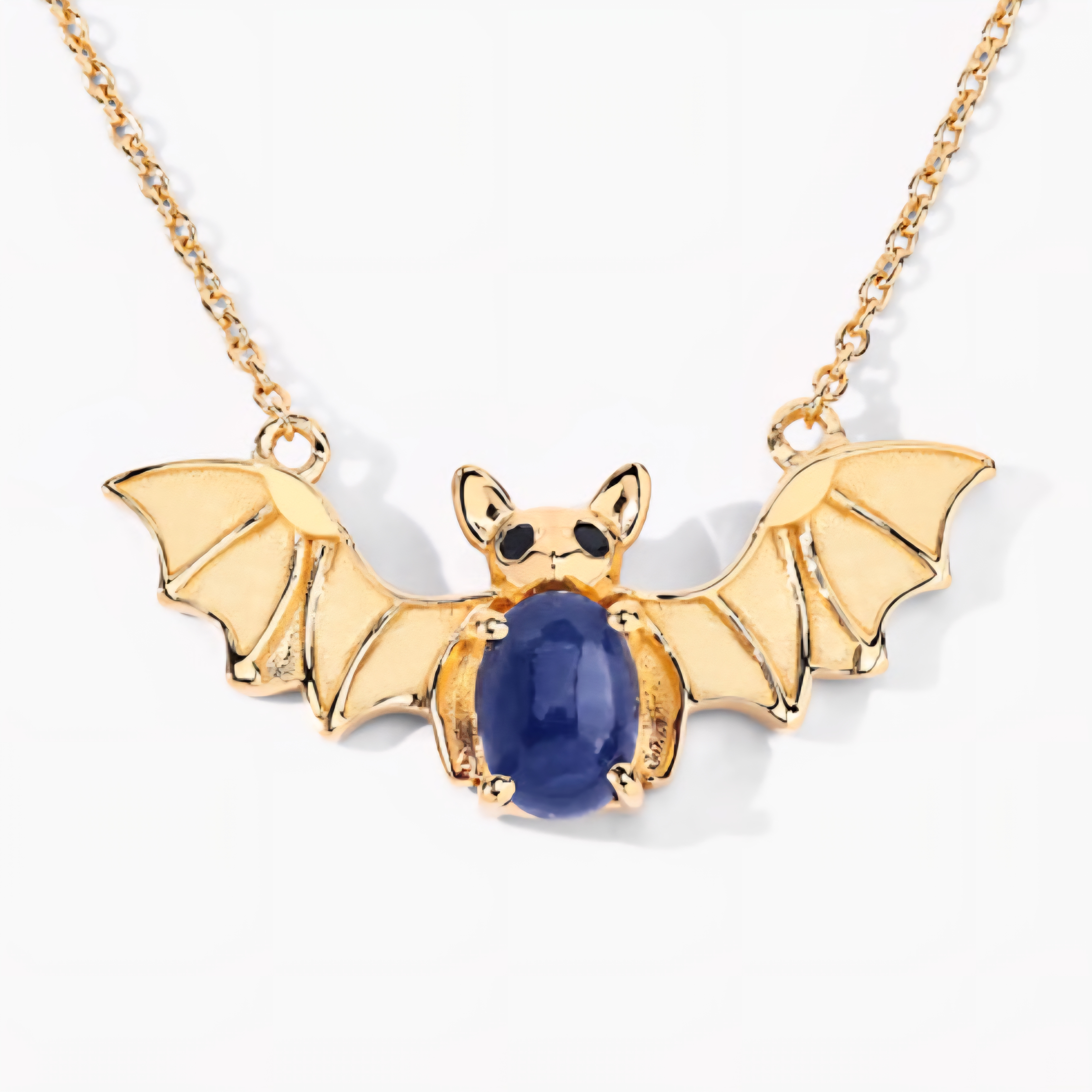 Midnight in motion. This sapphire bat necklace fuses dark charm with pure luxury — a deep blue 7x5mm cabochon sapphire forms the bat’s body, its eyes gleaming with black spinel fire. Sculpted wings and a smooth 18K gold finish complete this striking design, handcrafted in solid 925 sterling silver. It’s not just jewelry — it’s a nocturnal masterpiece.