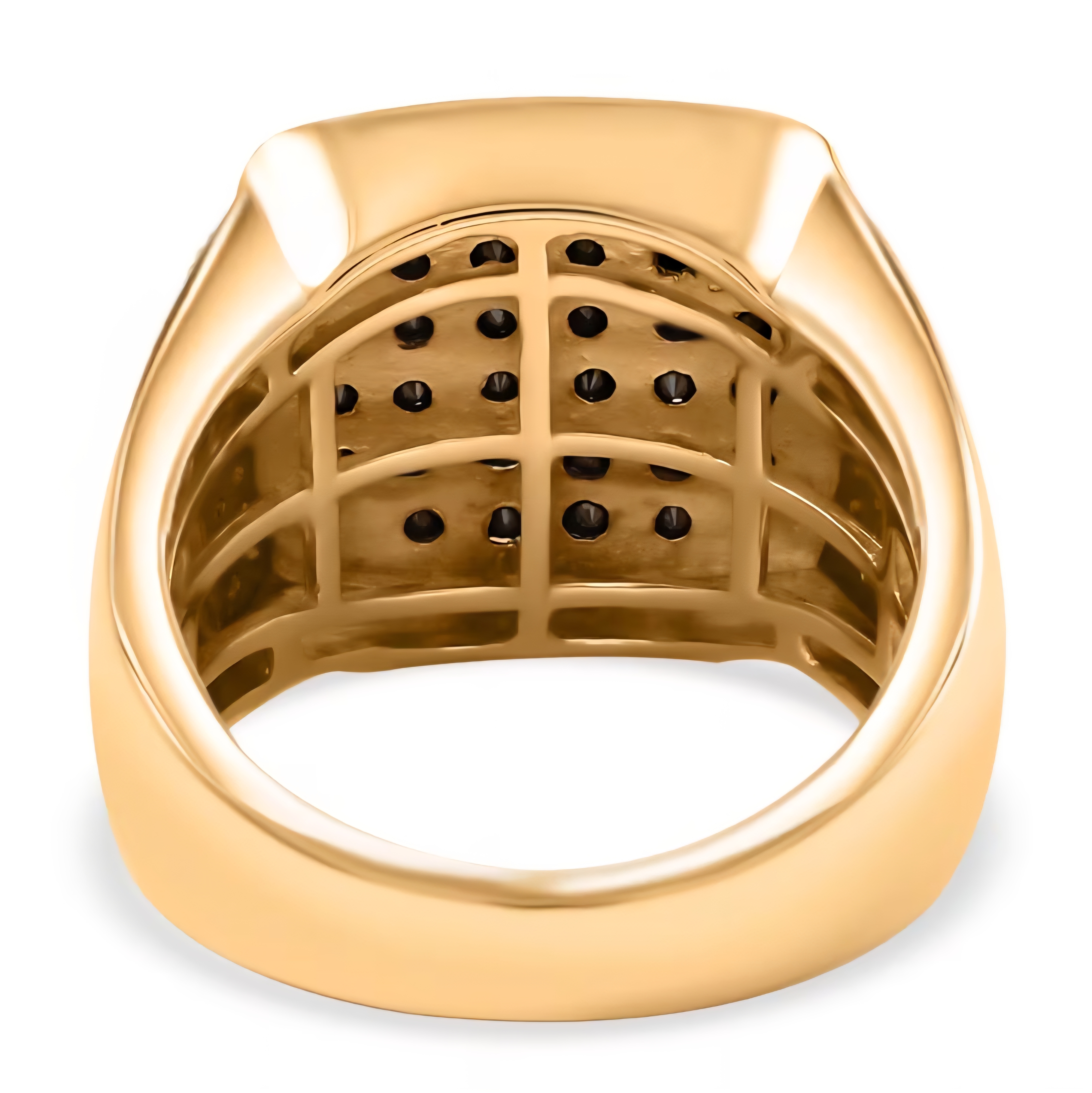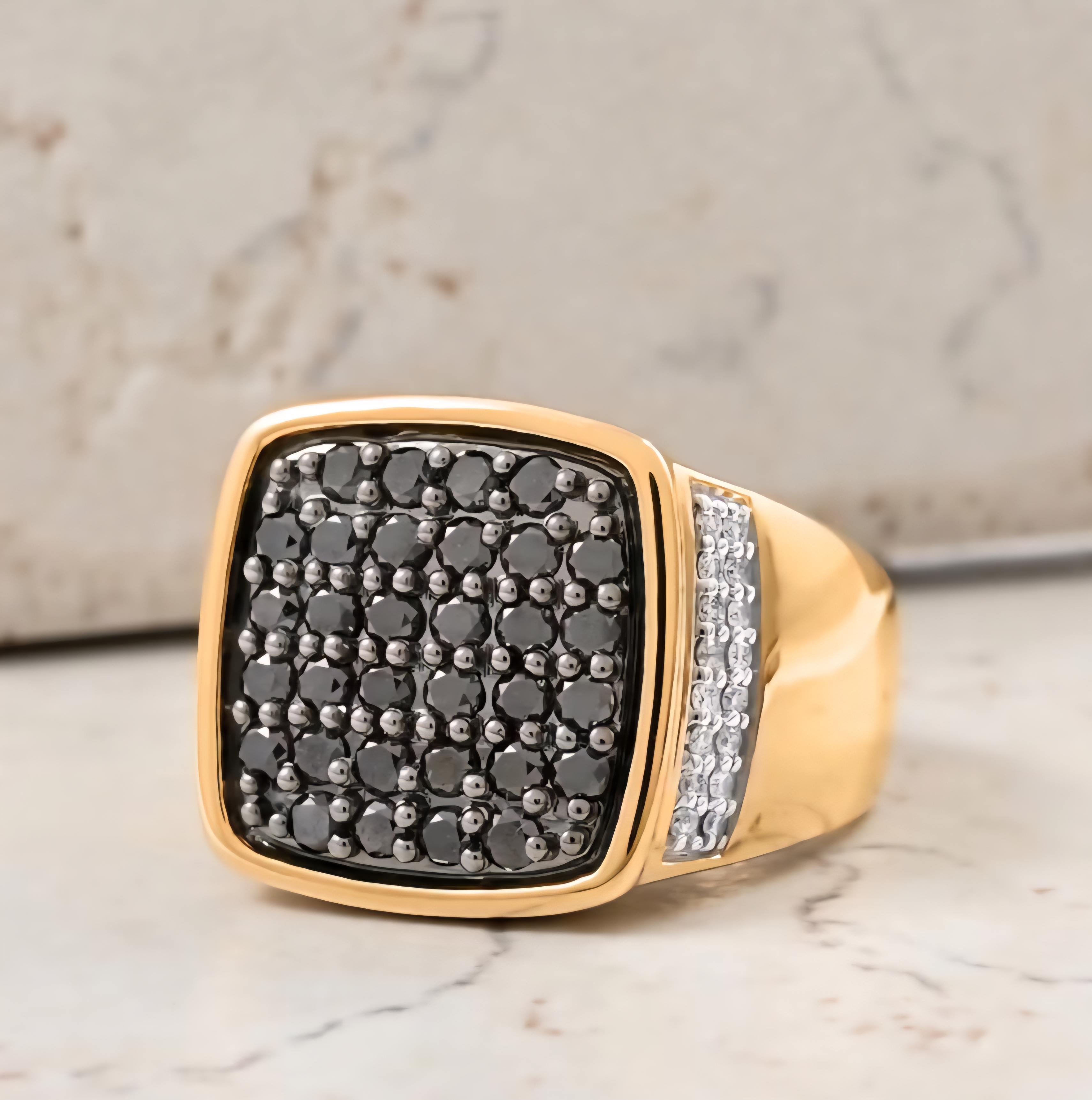 Exude strength and style with this striking gents ring, featuring a bold, square cluster of genuine black diamonds at its center. The deep, intense black of the diamonds creates a commanding presence. Adding a touch of brilliant contrast, rows of sparkling white diamonds are pavé set, flanking the central cluster on the shoulders of the ring. Crafted in warm and substantial 10K yellow gold, this ring offers a luxurious and masculine aesthetic. With a total carat weight of 1.50 ctw, this is a distinguished piece that makes a confident statement. Enjoy free worldwide shipping and a free lifetime warranty with your purchase.