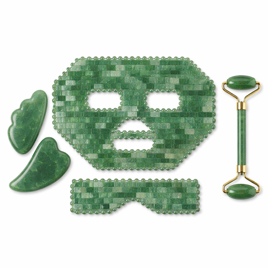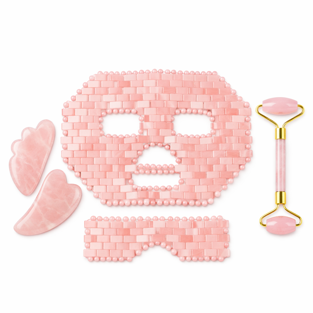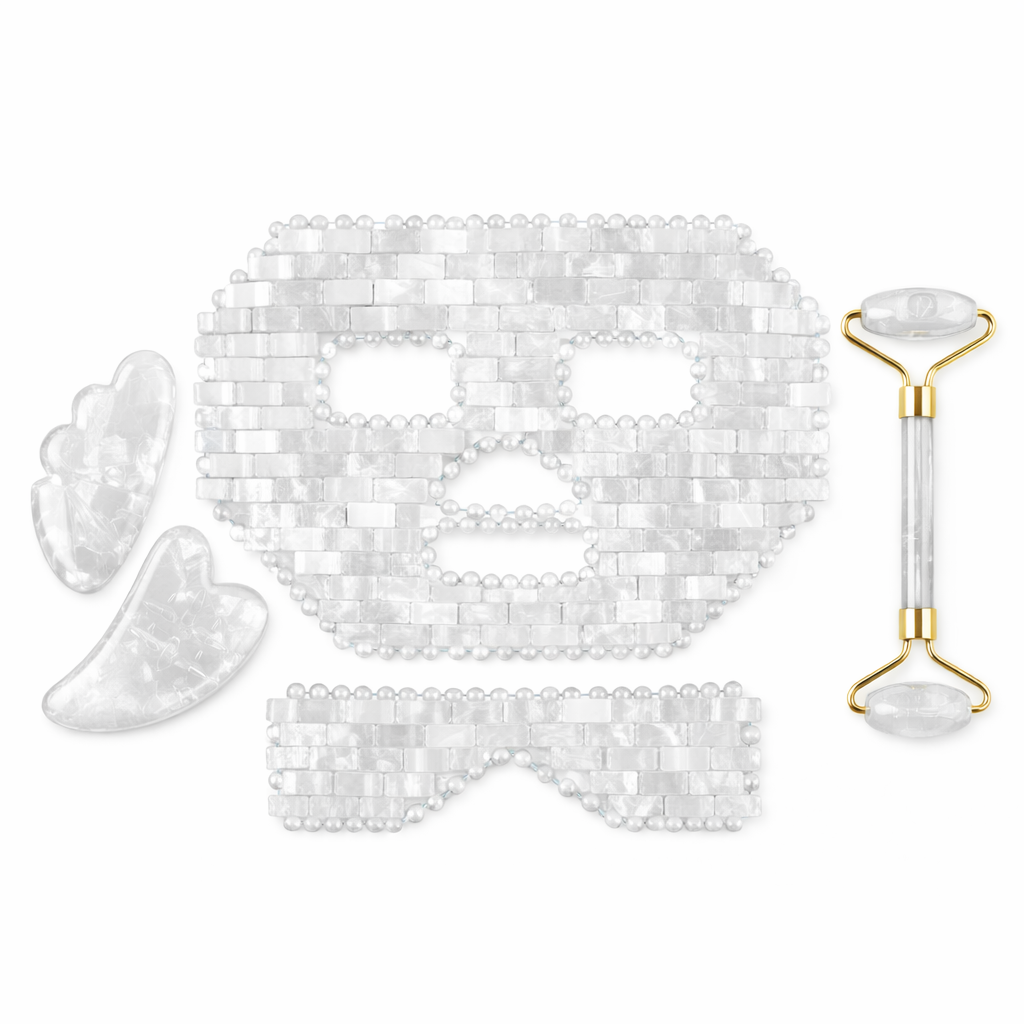 This premium set includes a full crystal face mask, a matching crystal eye mask, two gua sha tools, and a dual-ended facial roller, all beautifully paired with gold-tone hardware for a sleek, high-end finish.