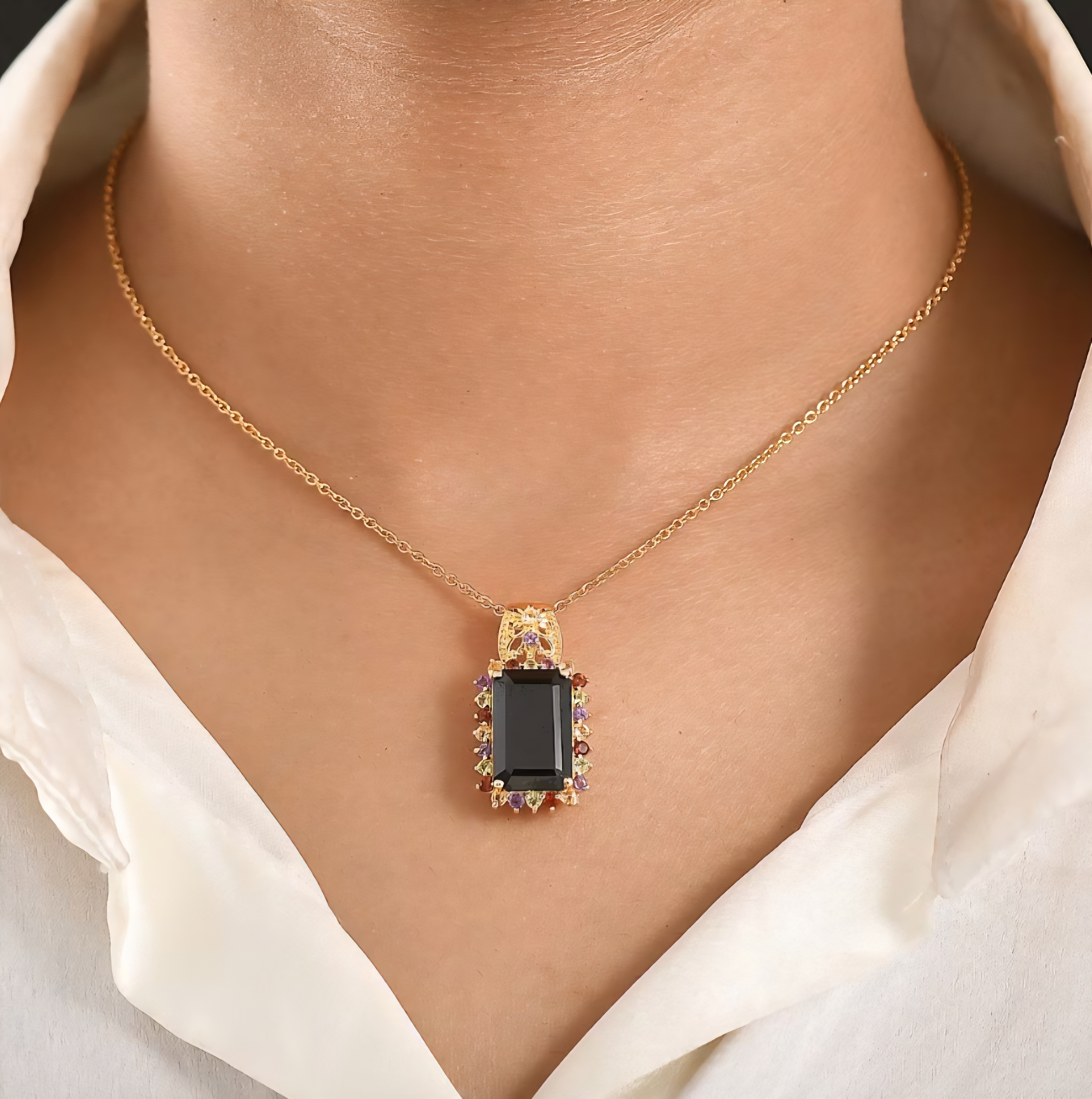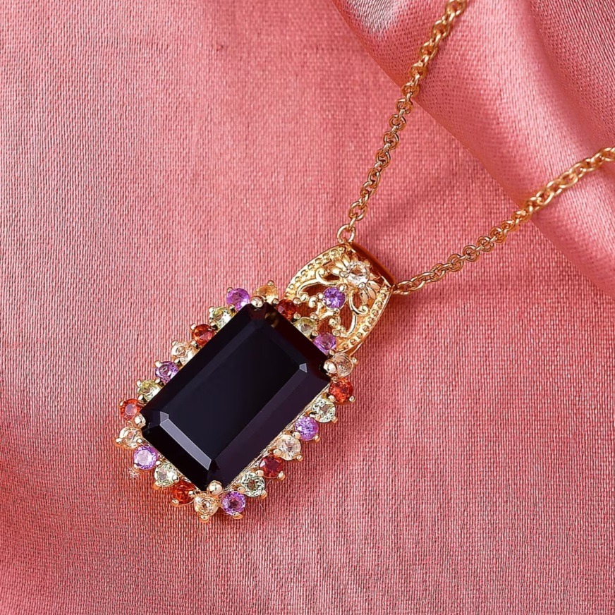 Finished in 18K yellow gold over solid sterling silver, this 11.50 carat pendant balances structure and color in a strong, statement ready silhouette.