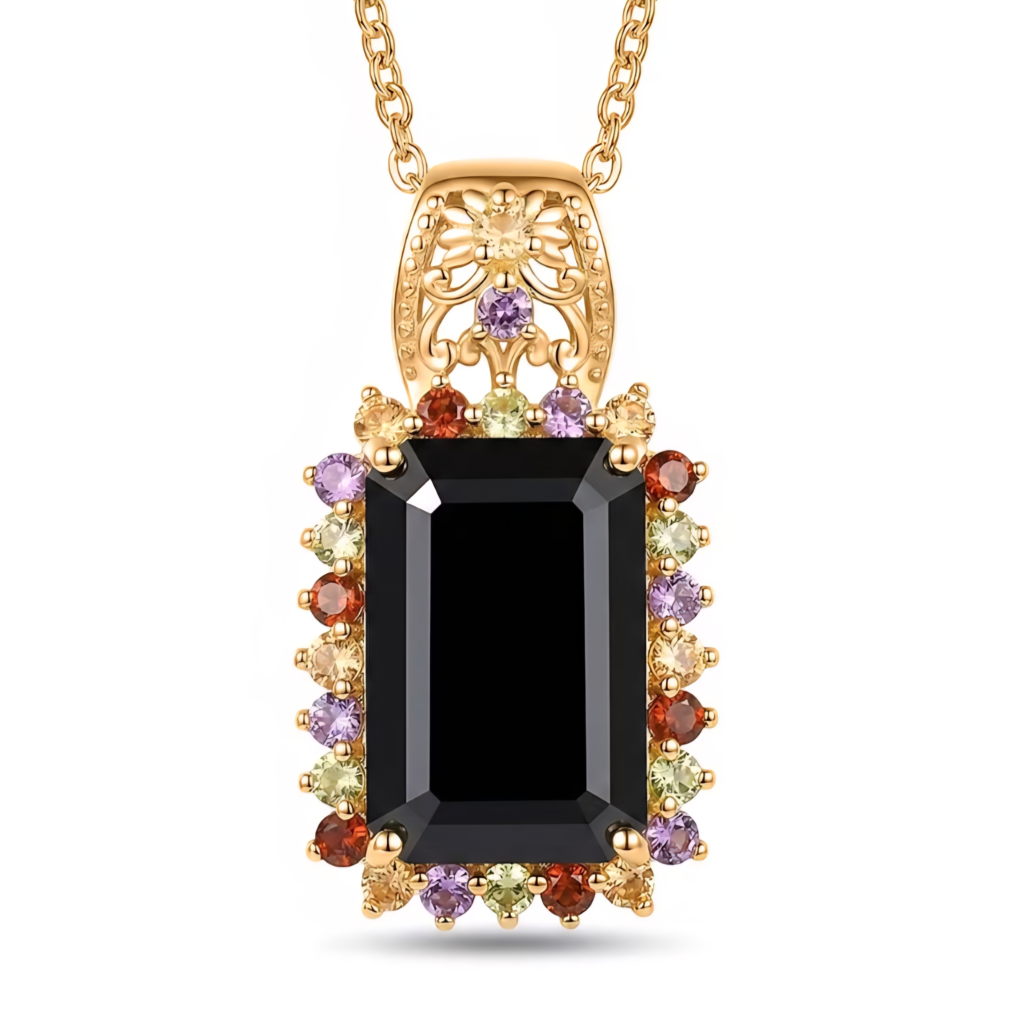 Surrounding it is a vibrant halo of natural amethyst, citrine, and garnet. The mix of purple, golden yellow, and rich red creates contrast against the black spinel, giving the piece color, energy, and dimension from every angle.