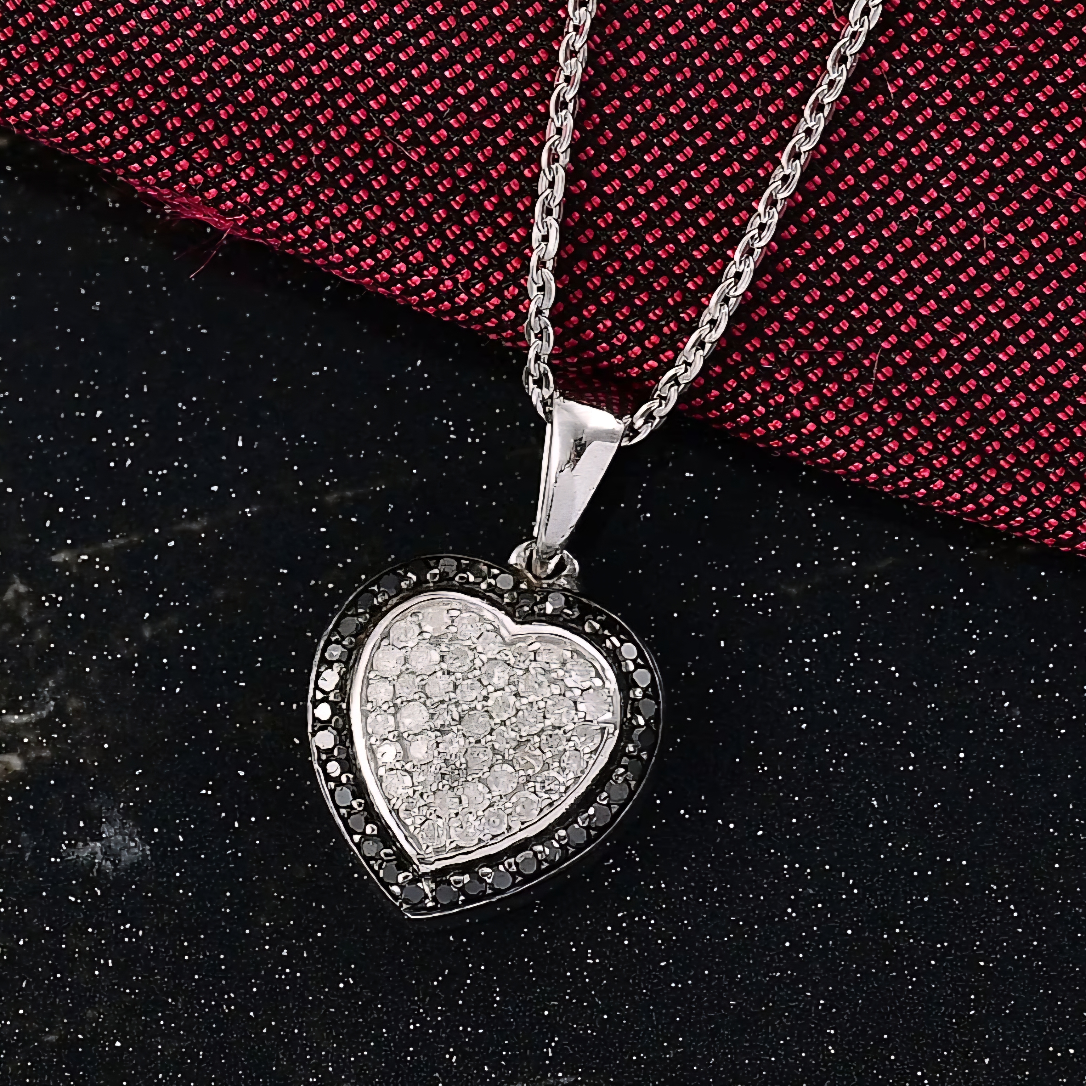 The heart form is defined by a mix of natural white and black diamonds, arranged to emphasize depth and structure rather than softness. White diamonds bring light and clarity to the center, while black diamonds frame the design with quiet intensity, creating a measured balance of brightness and shadow.