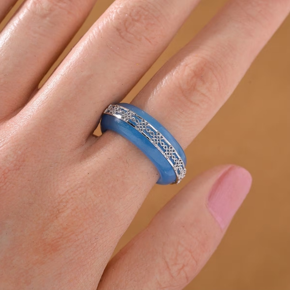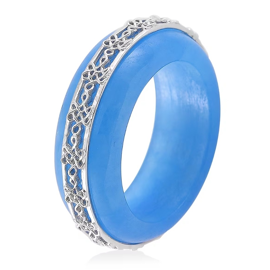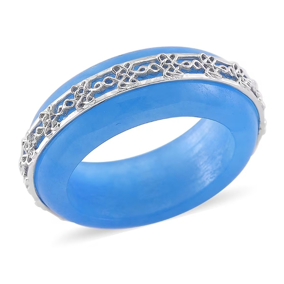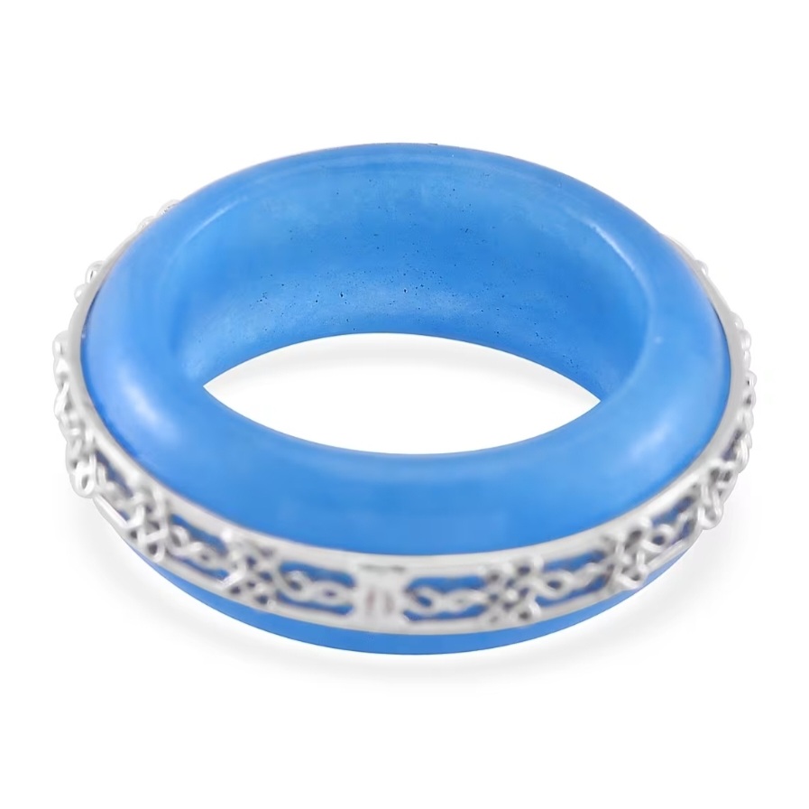 A full, sculpted band of rich blue jadeite carved into a smooth free form ring, wrapped in rhodium over sterling silver detailing. The bright white scrollwork sits like a crown along the top edge, adding structure and contrast without taking away from the stone itself.