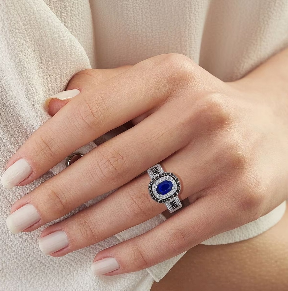 A statement ring with true contrast—bold blue, warm sparkle, and clean white shine all working together in one powerful design.