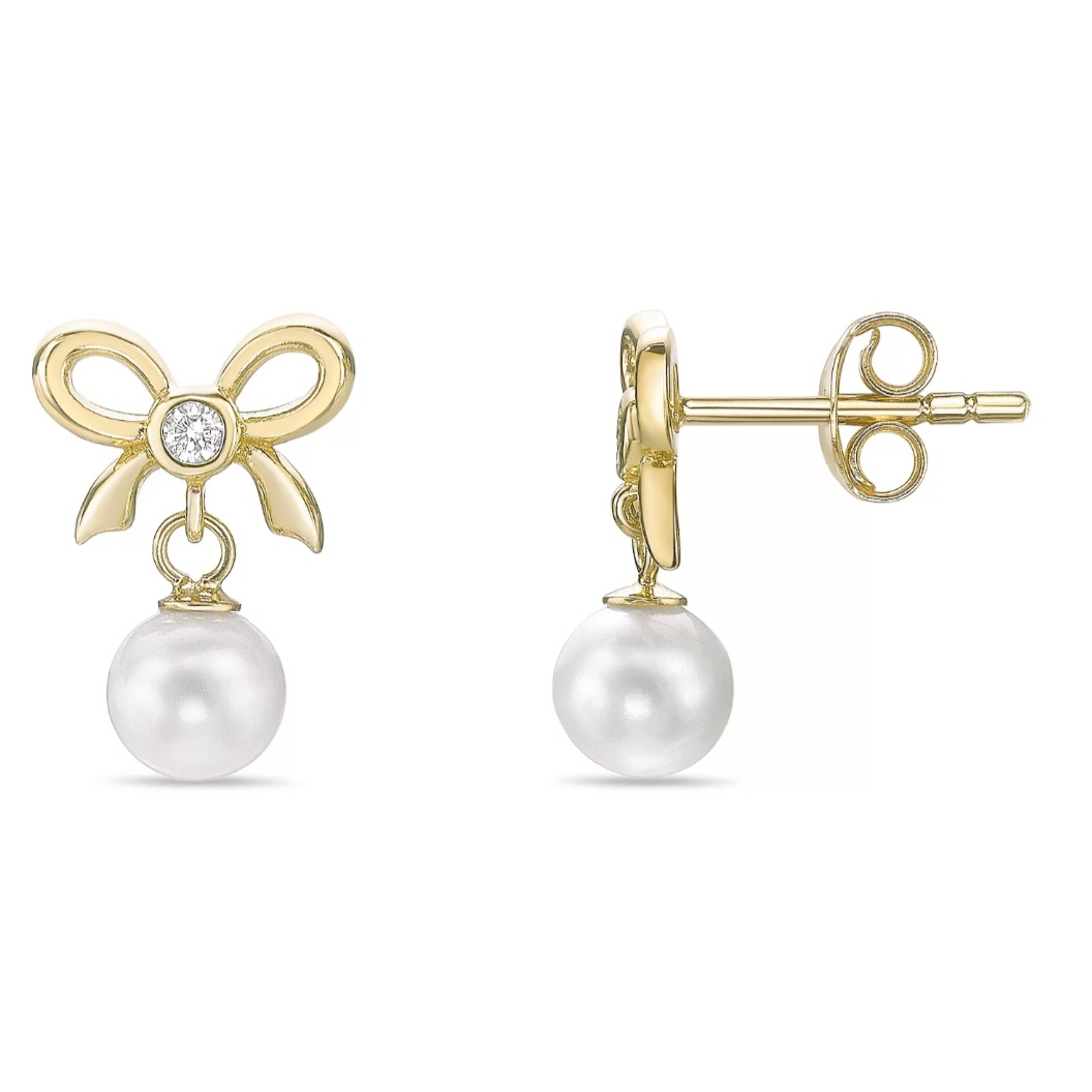 Delicate and timeless, these bow-inspired earrings combine playful charm with refined luxury. Each earring features a luminous cultured freshwater pearl suspended beneath a polished gold bow, centered with a brilliant lab grown diamond for a touch of sparkle. Crafted in solid 925 sterling silver and finished in 18K yellow gold plating, this design captures effortless femininity with a graceful, classic silhouette.Delicate and timeless, these bow-inspired earrings combine playful charm with refined luxury. Each earring features a luminous cultured freshwater pearl suspended beneath a polished gold bow, centered with a brilliant lab grown diamond for a touch of sparkle. Crafted in solid 925 sterling silver and finished in 18K yellow gold plating, this design captures effortless femininity with a graceful, classic silhouette.