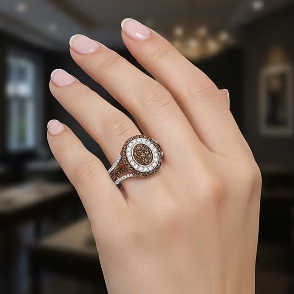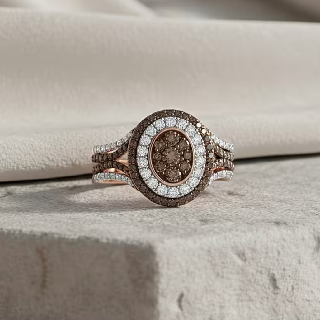 This diamond cluster halo ring features rich brown diamonds set at the center, creating a deep, smoky brilliance that feels bold and grounded. A surrounding halo of white diamonds adds contrast and lift, sharpening the profile and amplifying the overall sparkle without overpowering the center cluster.