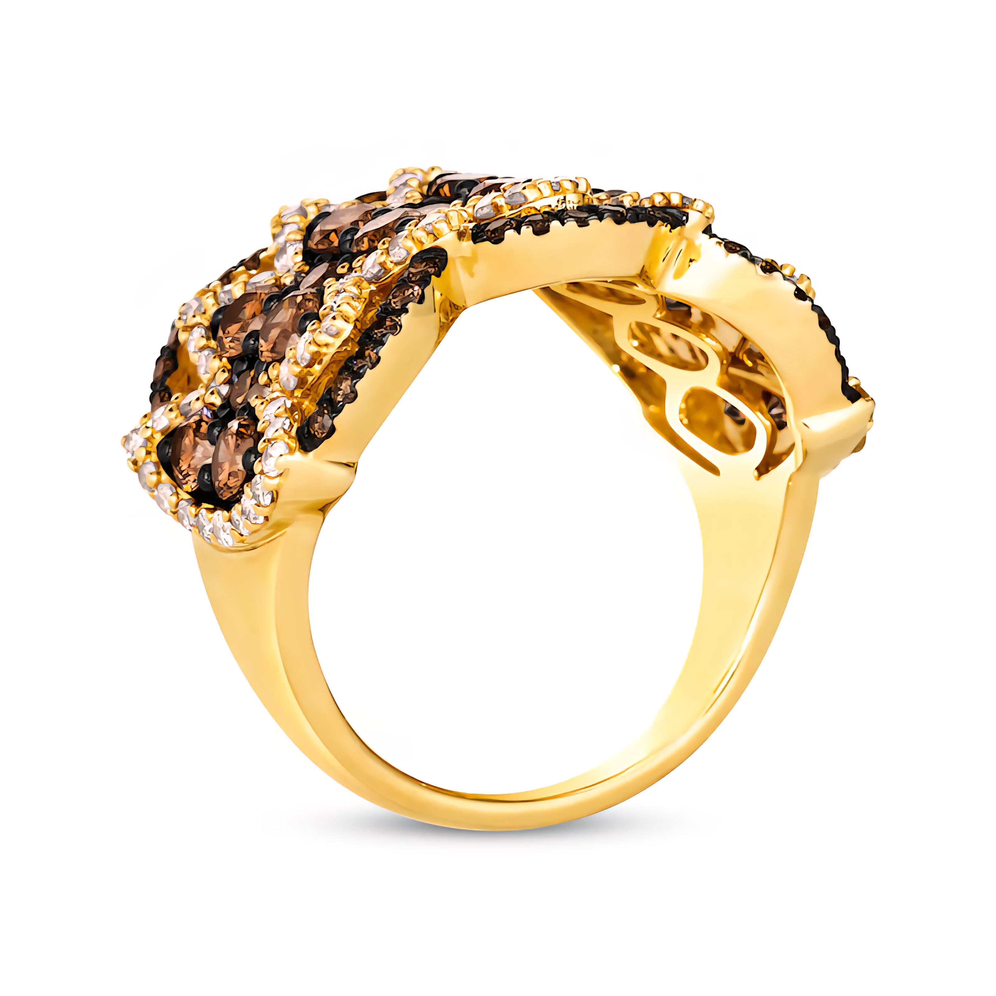 This ring is unapologetically bold. Over two carats of natural diamonds slash across your finger in a zigzag crown of fire and shadow. Rows of fancy brown diamonds dominate the center, graduating from larger 3.0mm rounds to smaller accents, while crisp white diamonds line each chevron edge for contrast. Black rhodium detailing pulls every line into sharp focus against the richness of solid 14K yellow gold. This isn’t background jewelry — it’s the piece that commands the room.