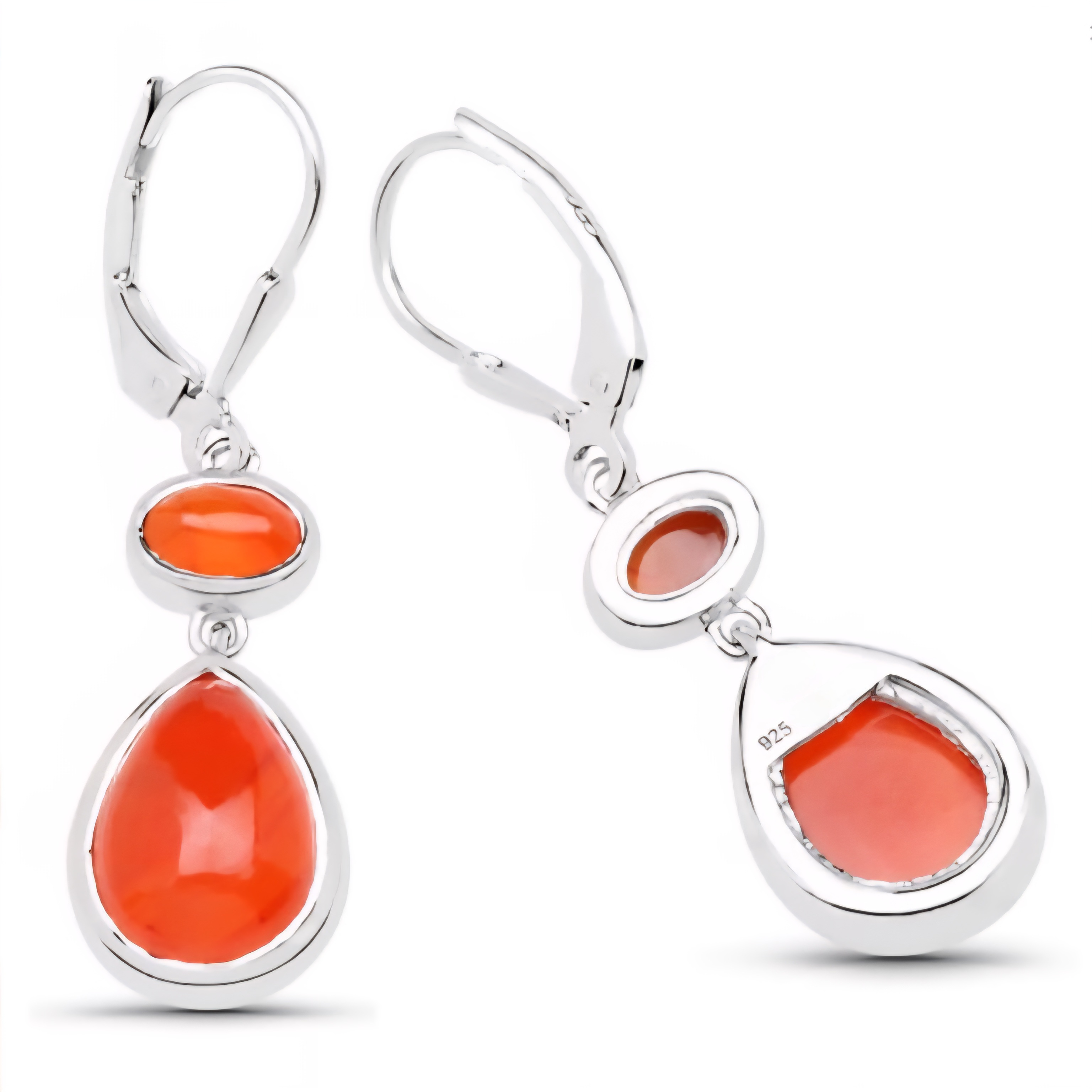 Effortlessly elegant and bursting with color, these Carnelian drop earrings radiate warmth and sophistication. Each earring features smooth cabochon Carnelian gems — a glowing oval atop a teardrop — bezel set in luminous rhodium over sterling silver. The fiery orange stones bring vibrant contrast to the sleek metal finish, while the lever-back closures ensure secure, comfortable wear. Designed to move gracefully with every turn of the head, this pair captures the perfect balance of modern simplicity and timeless gemstone beauty.