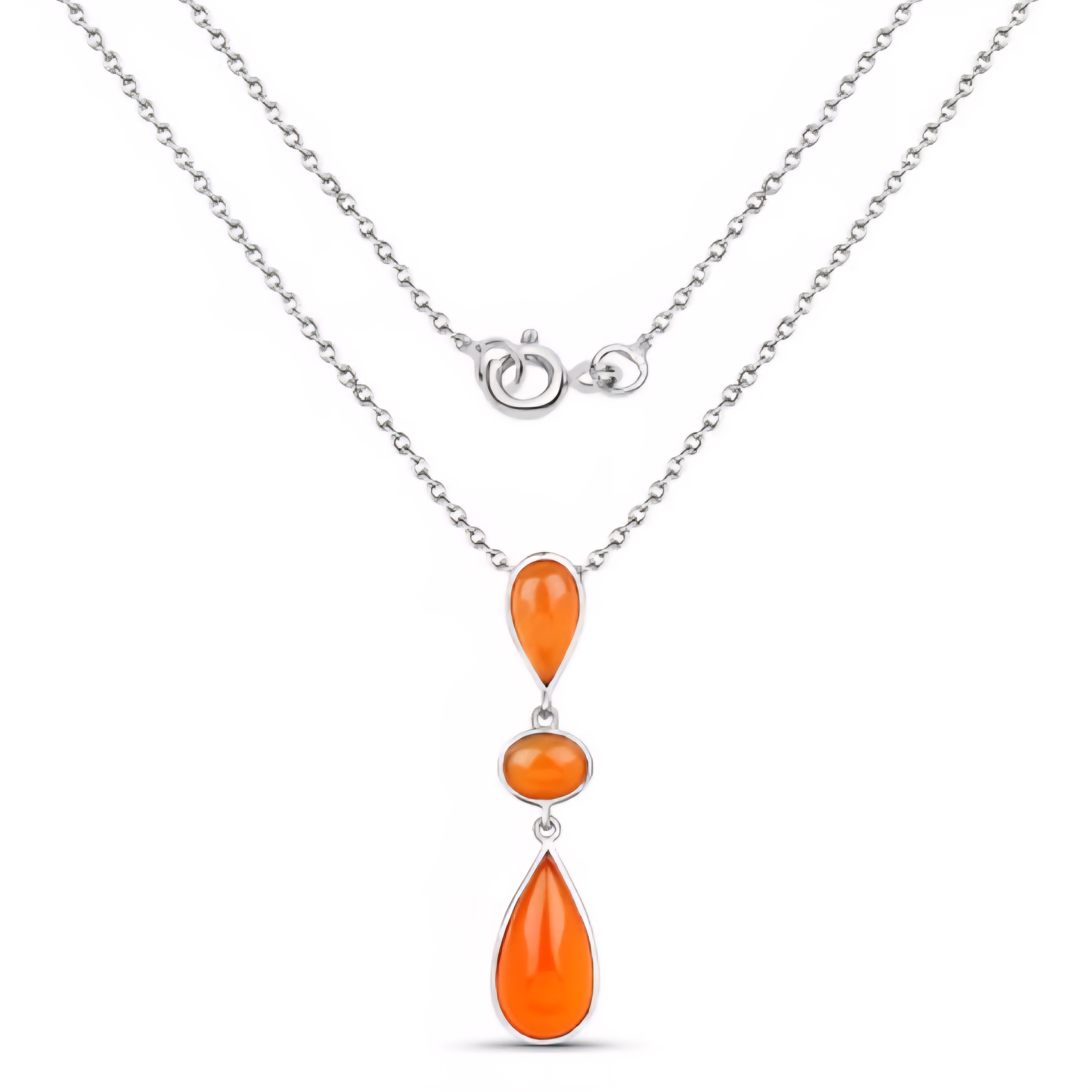 A radiant trio of cabochon Carnelian gems glows with deep sunset orange hues — bezel-set in luminous rhodium over sterling silver. The cascading teardrop and oval design elongates the neckline with graceful movement, blending modern simplicity with timeless gemstone warmth. Each smooth cabochon is polished to perfection, allowing light to play across the stone’s surface with a soft, internal fire. Finished with a high-polish silver frame and your choice of chain length, it’s elegant, fiery, and effortlessly refined.