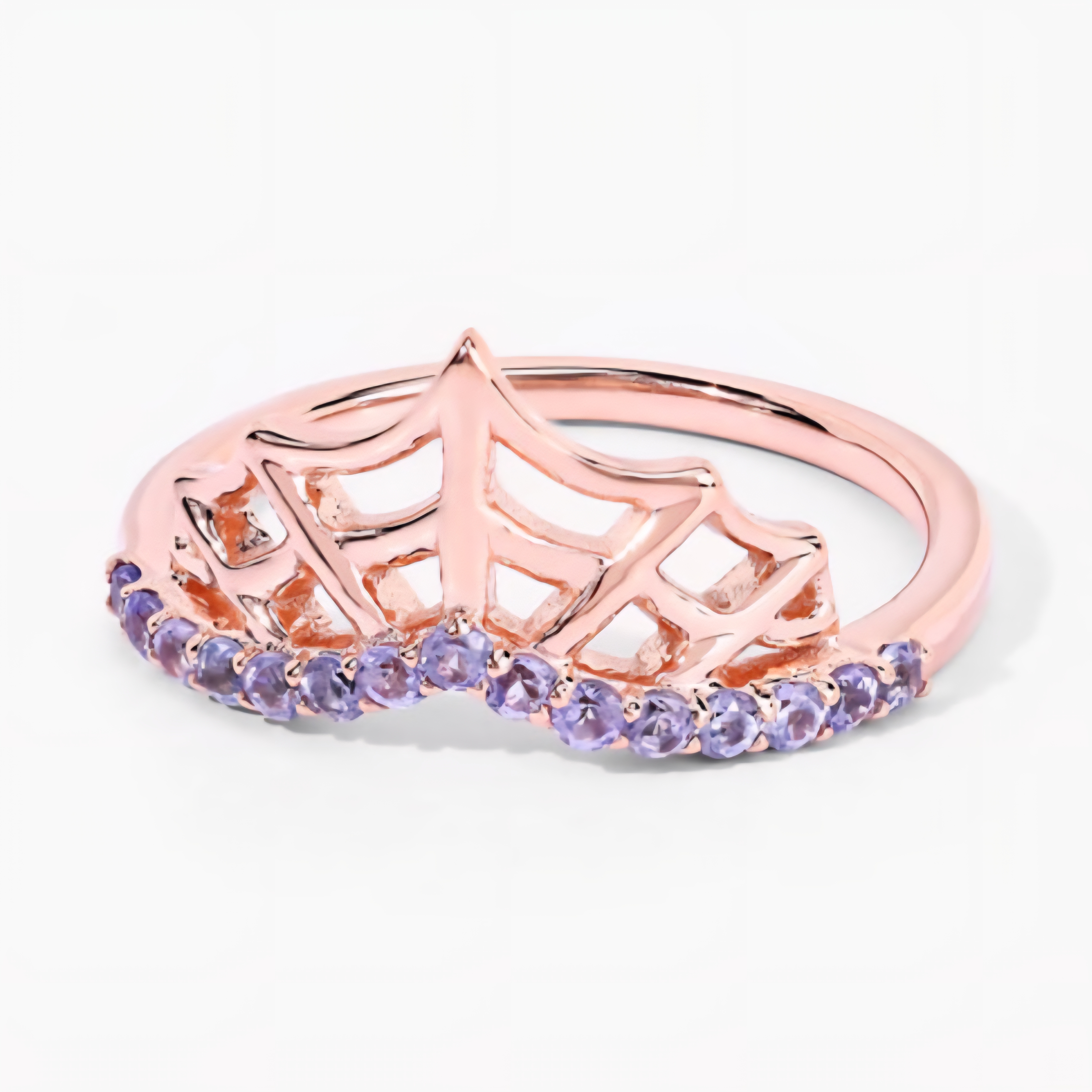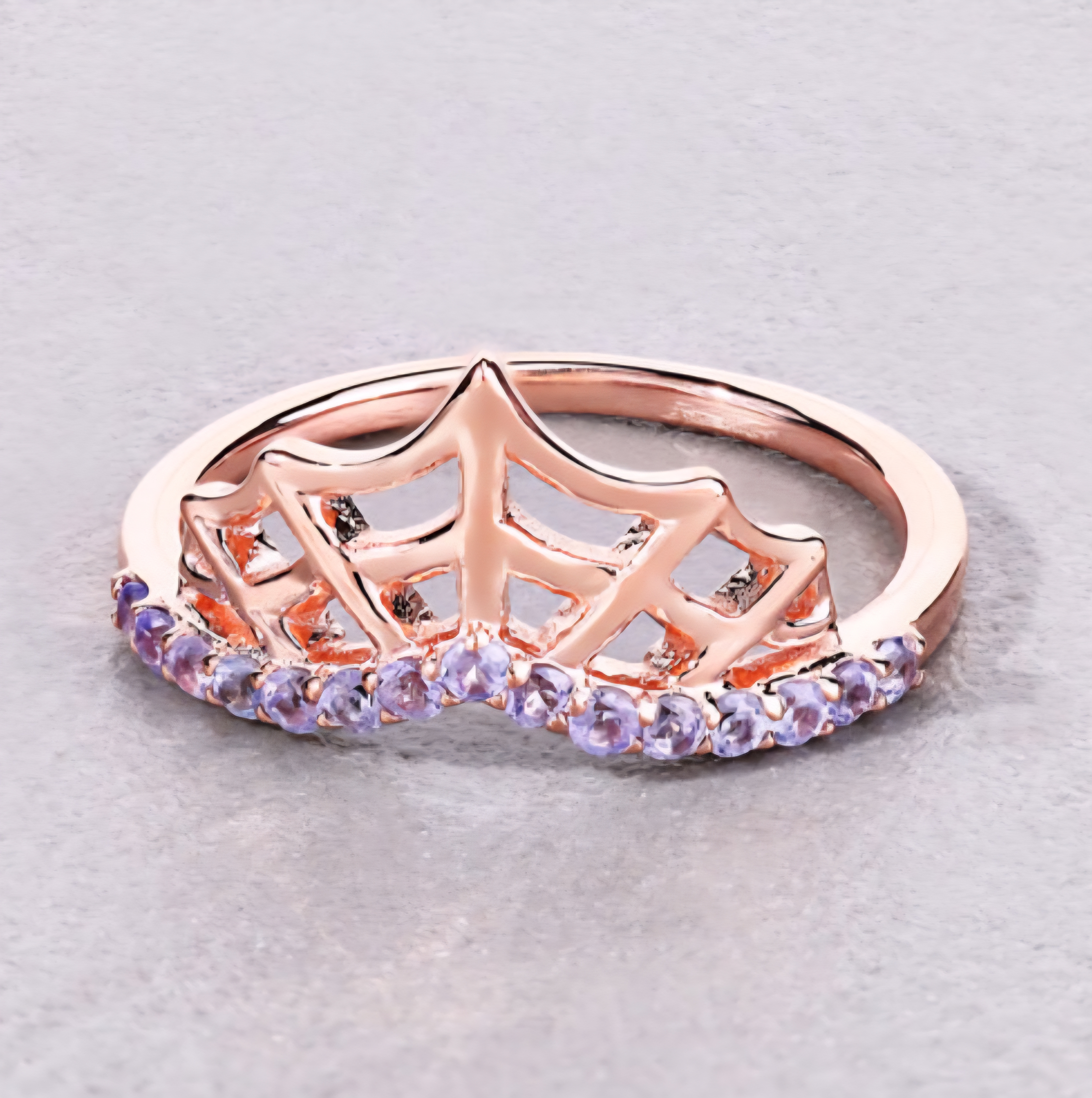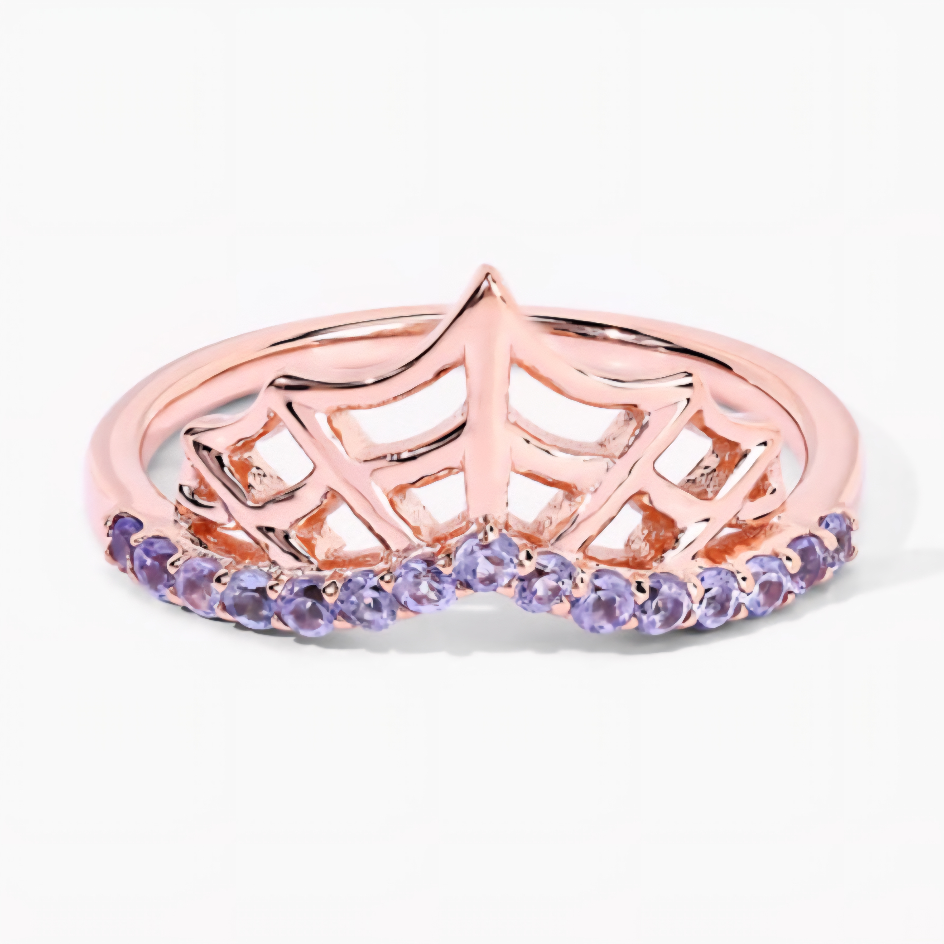 A little gothic. A little glam. Entirely unforgettable. This chevron-style spider web ring is crafted in solid sterling silver and finished with 18K rose gold plating for a soft, glowing contrast against vivid tanzanite gemstones. The delicate arc of violet stones outlines a sculpted geometric web — elegant, edgy, and built for stacking or standing alone. It’s equal parts spooky and sophisticated — the kind of piece that sneaks up on you.