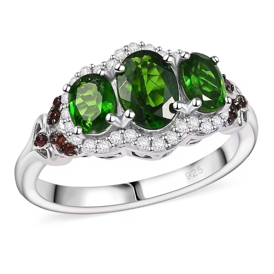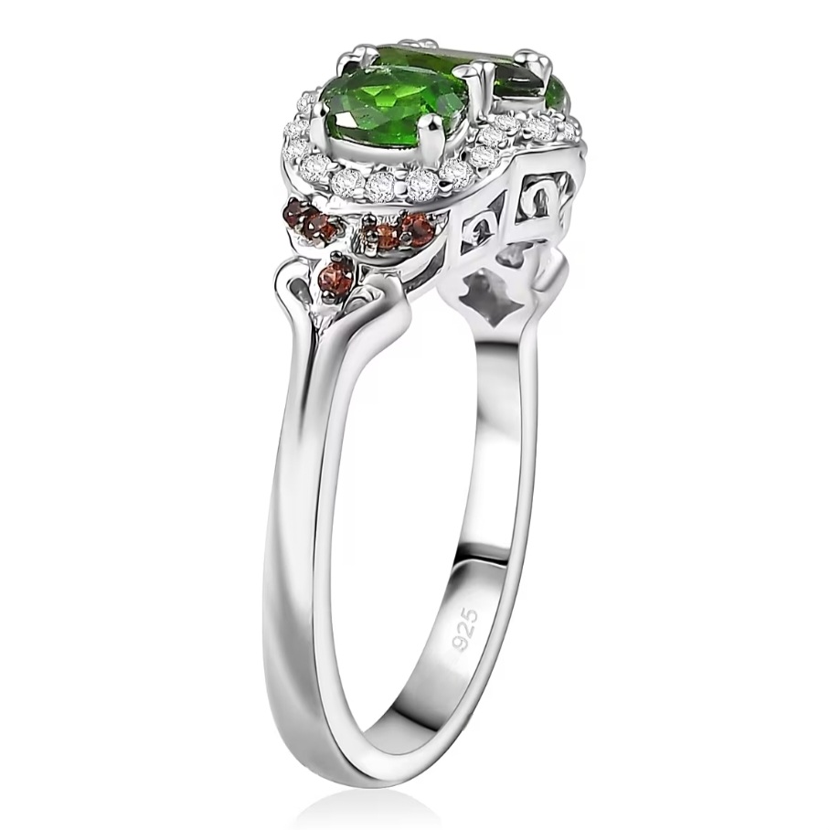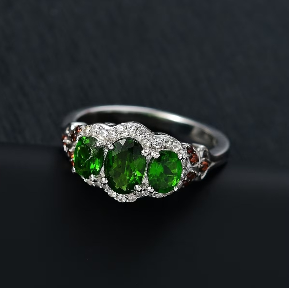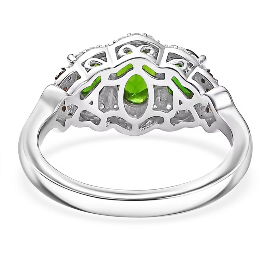 A vivid balance of earth and light. This trilogy ring features rich Chrome Diopside, prized for its intense forest-green hue and natural brilliance. The trio of stones creates a refined symmetry, accented by white and cognac-toned zircons that frame the design with layered sparkle and warmth.