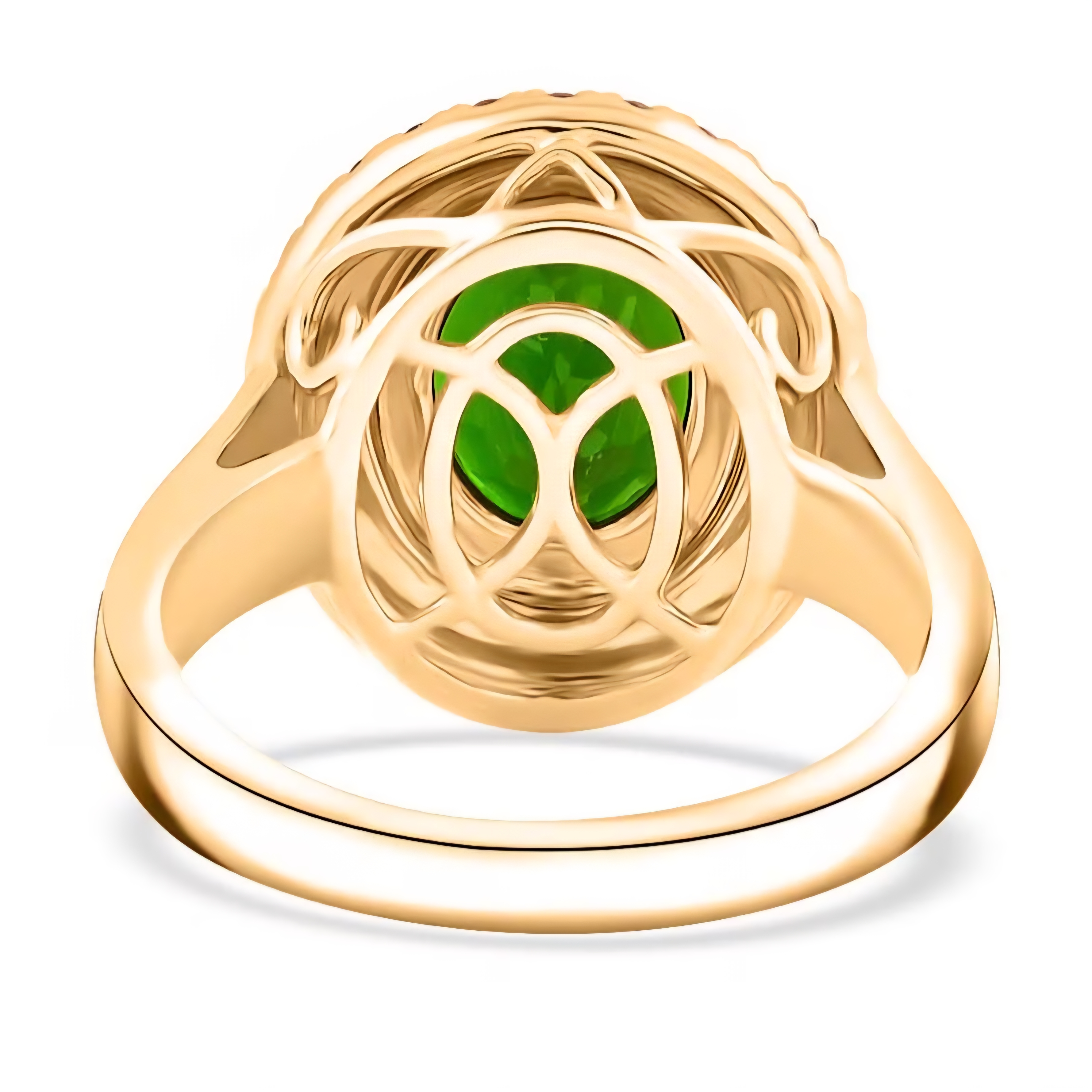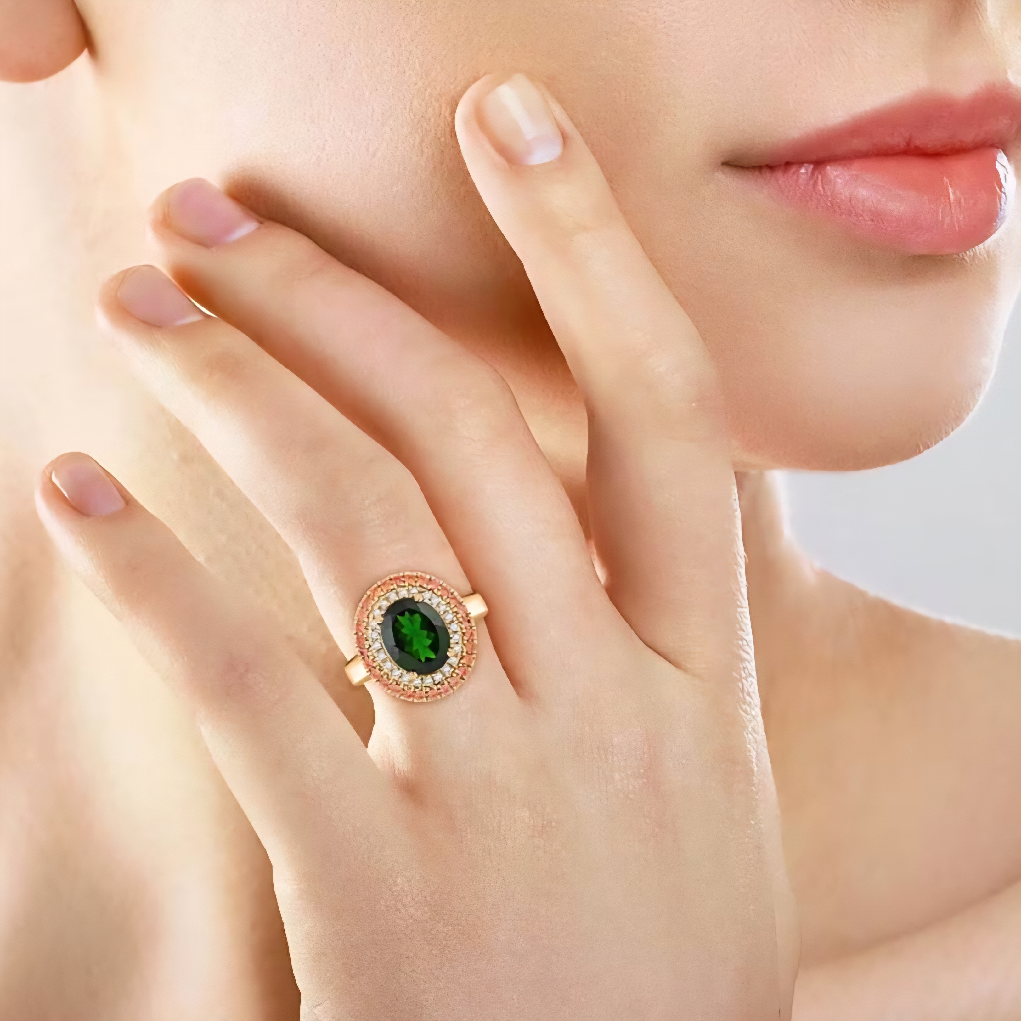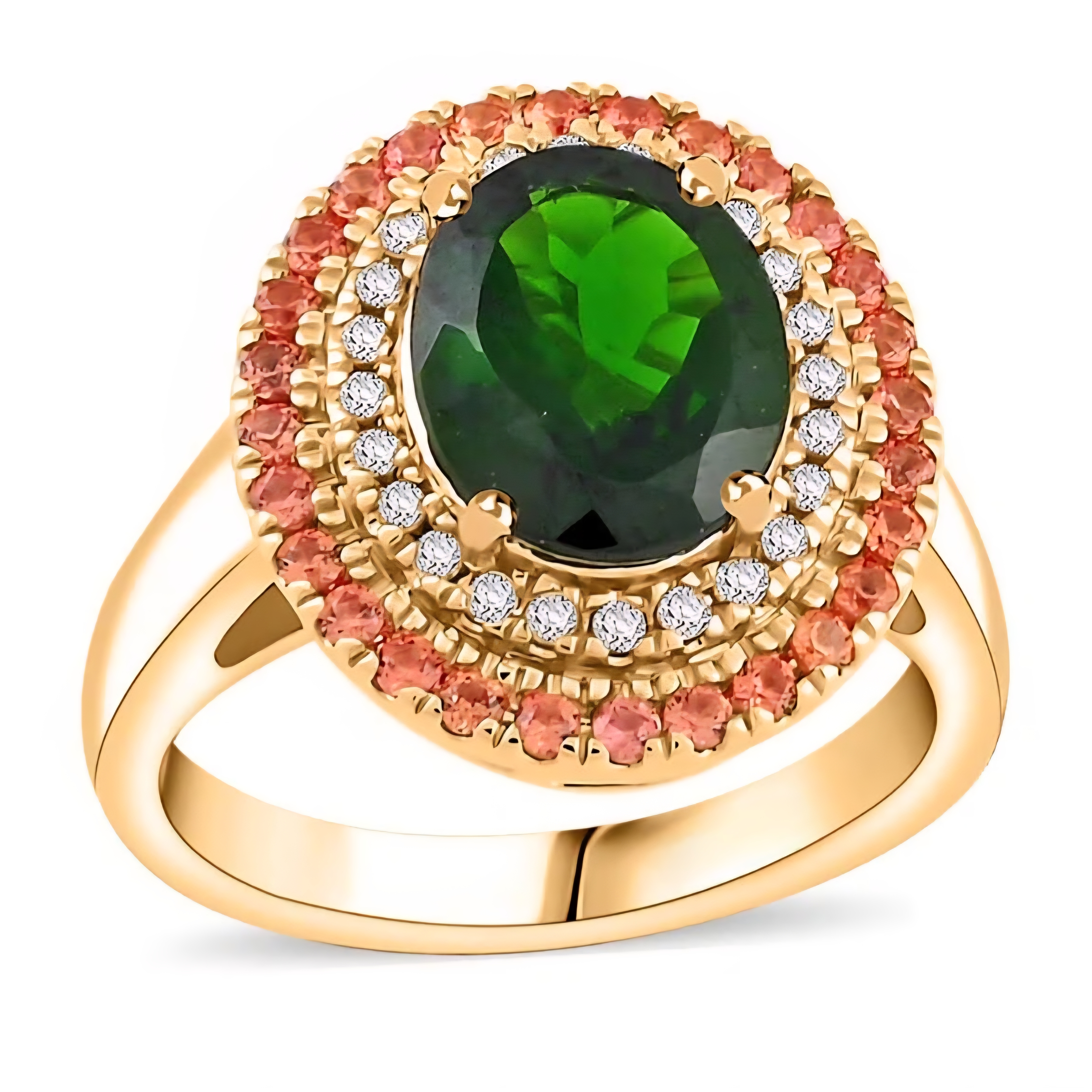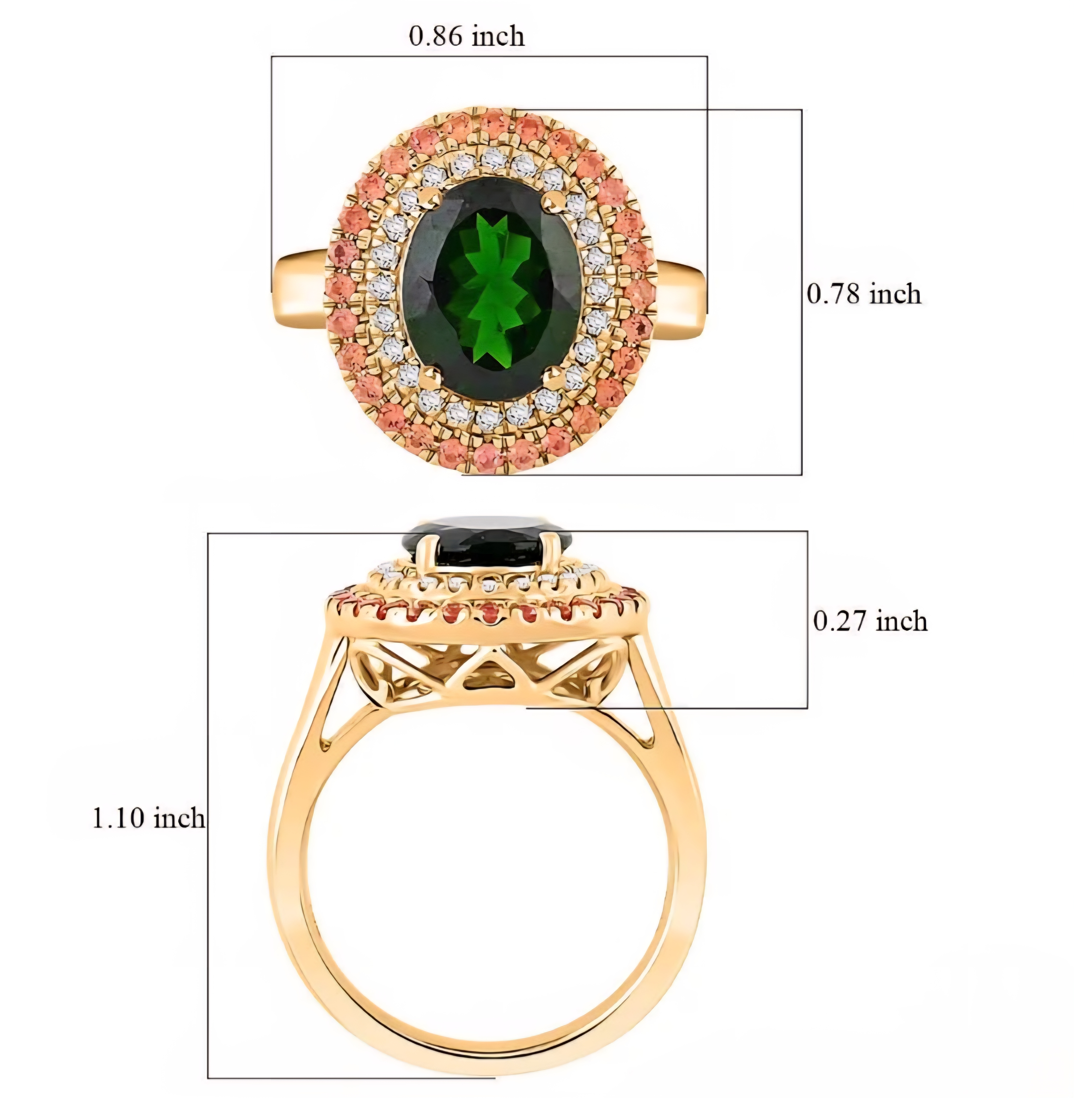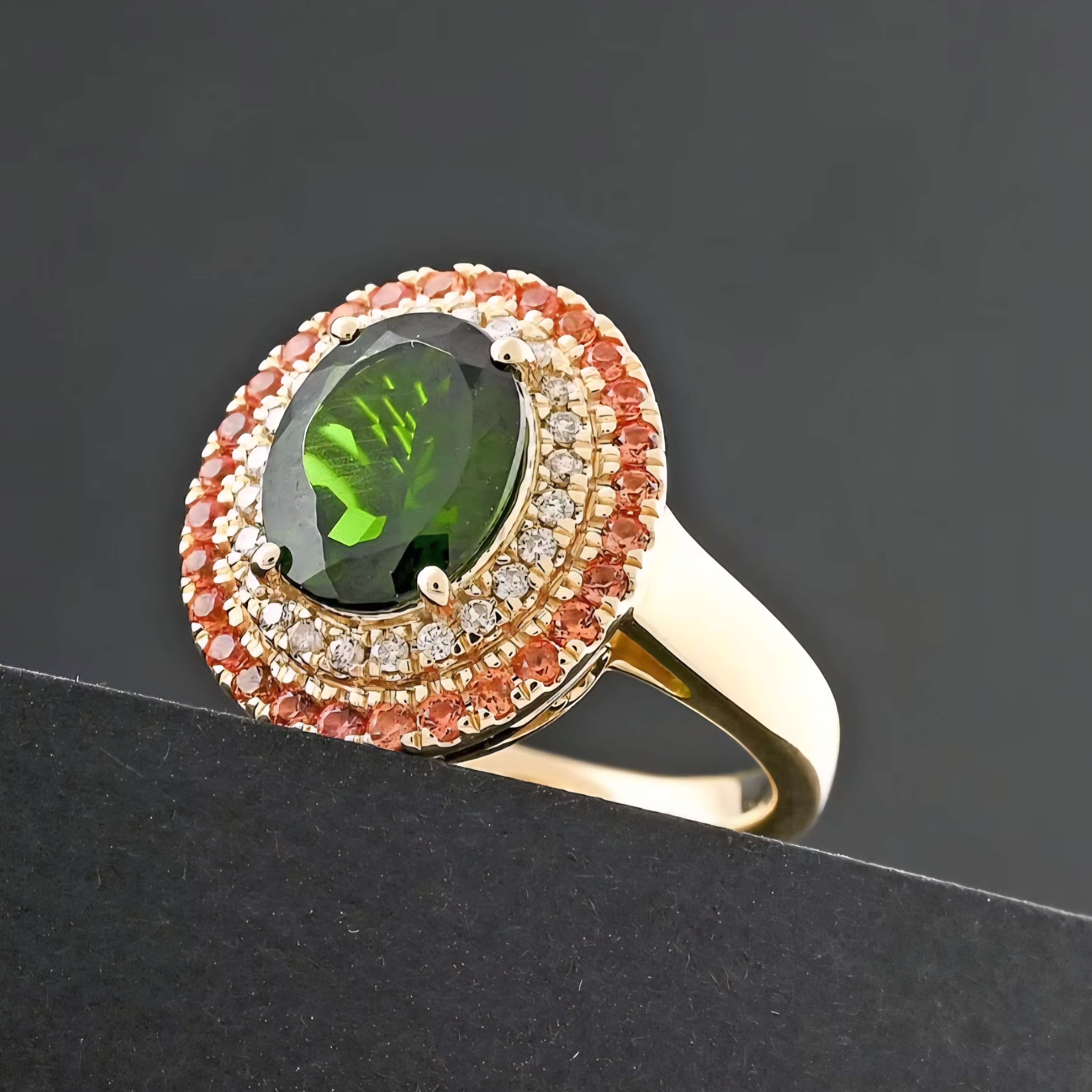 This ring is built around a vivid 2.69ct oval chrome diopside with deep, saturated green color that looks electric in yellow gold. A bright inner halo of natural diamonds adds sharp white sparkle, while the outer halo of padparadscha sapphires brings a rare pink orange glow that makes the entire design hit harder than a standard halo ring. Classic silhouette, genuinely uncommon gemstone combination, and made in solid 10K gold.