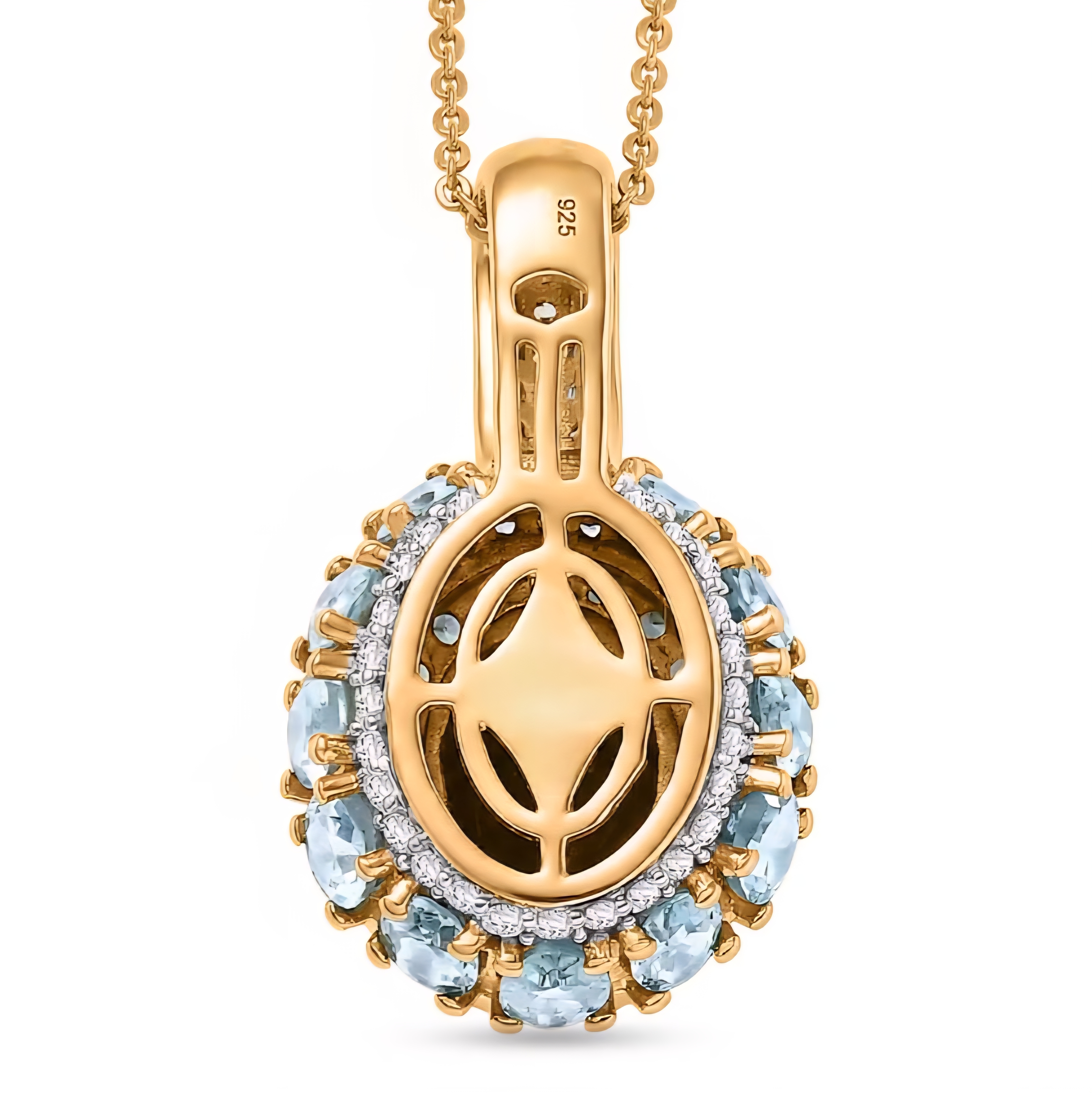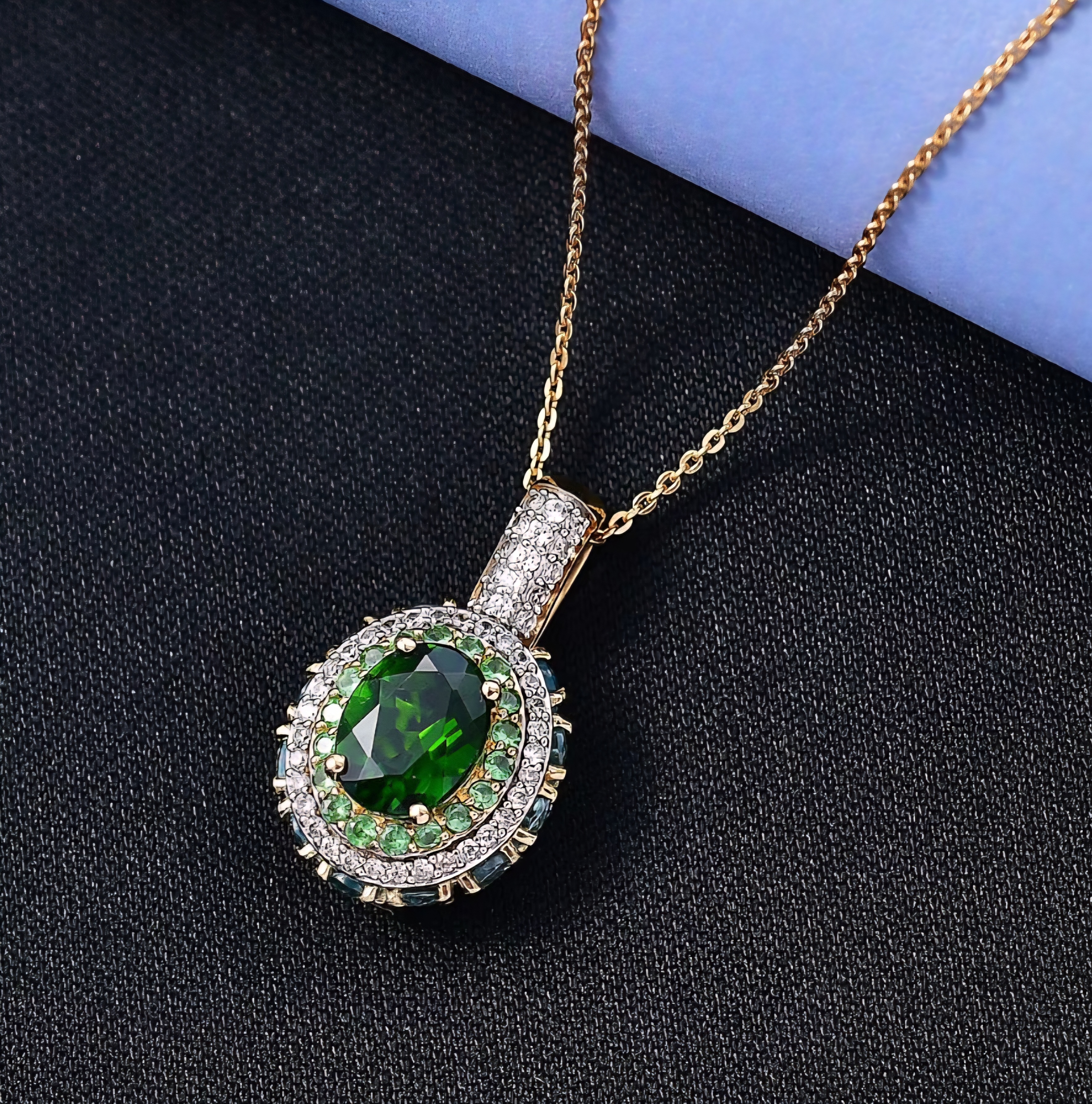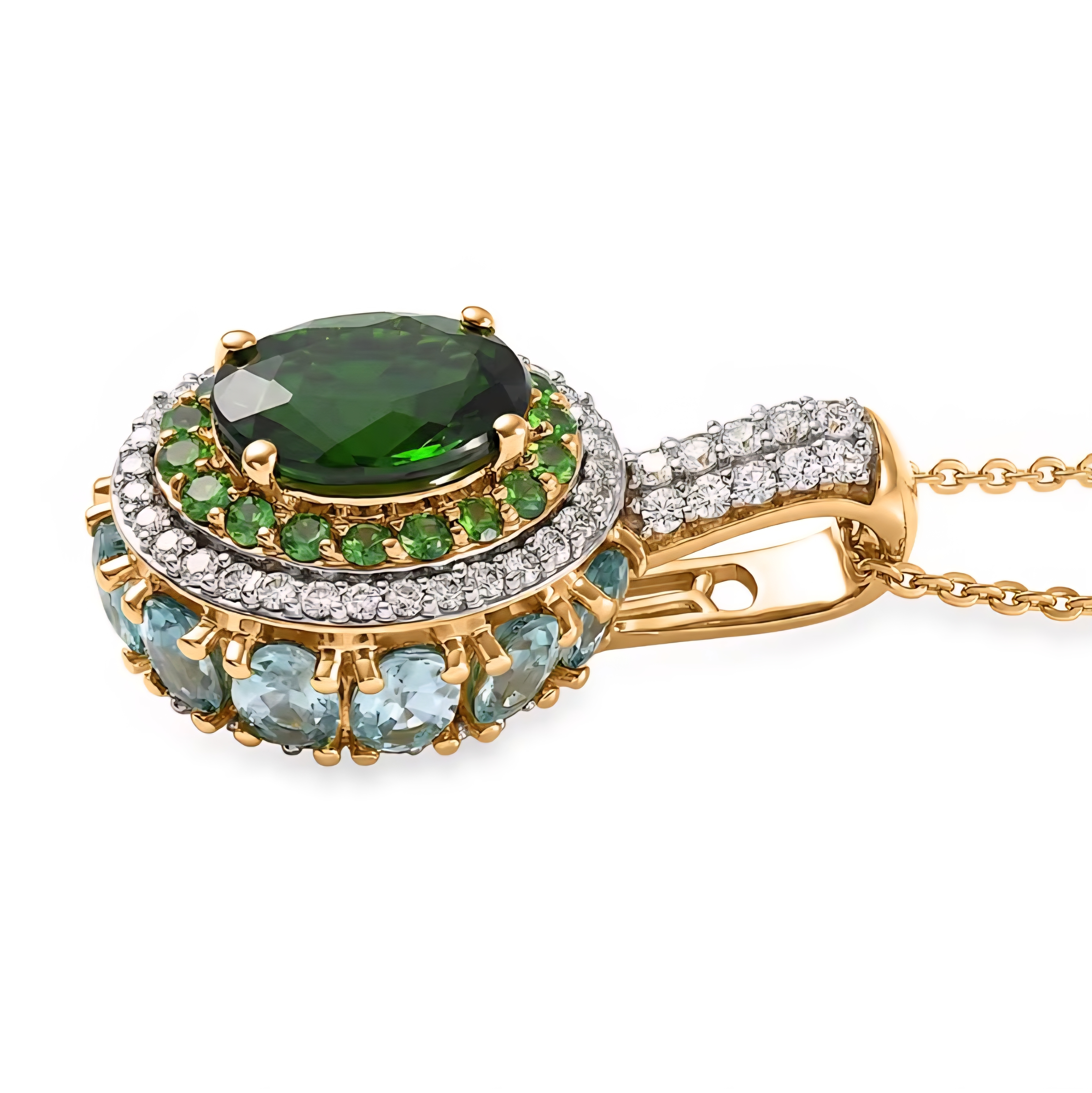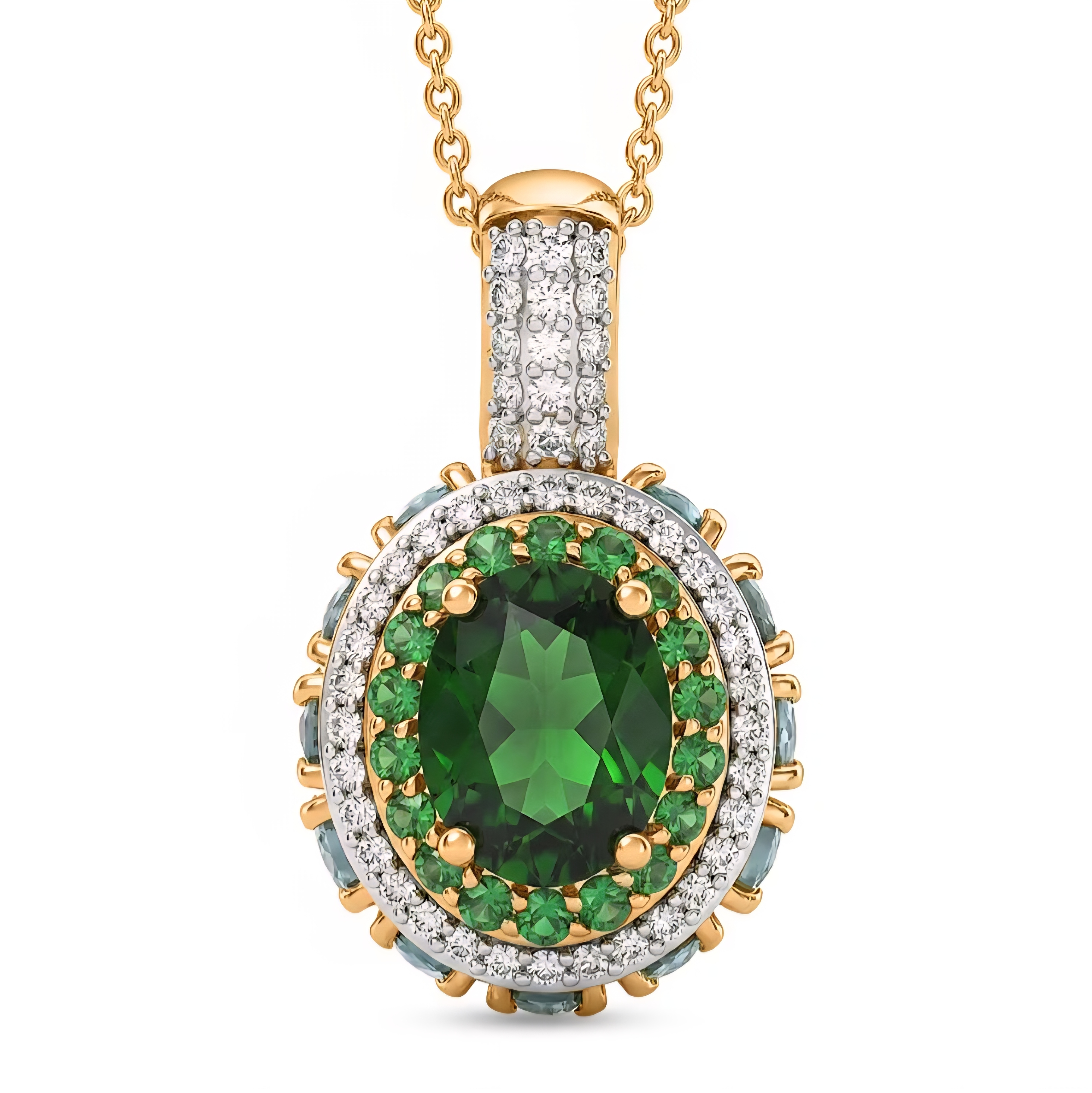 Encircling the center stone is a layered halo of vibrant gemstones. Bright green tsavorite garnets frame the chrome diopside, intensifying the lush green color. A halo of sparkling white zircon enhances the brilliance, while blue zircon gemstones wrap around the outer edge of the pendant, creating a striking contrast of green, blue, and white gemstones that gives the piece depth and color from every angle.