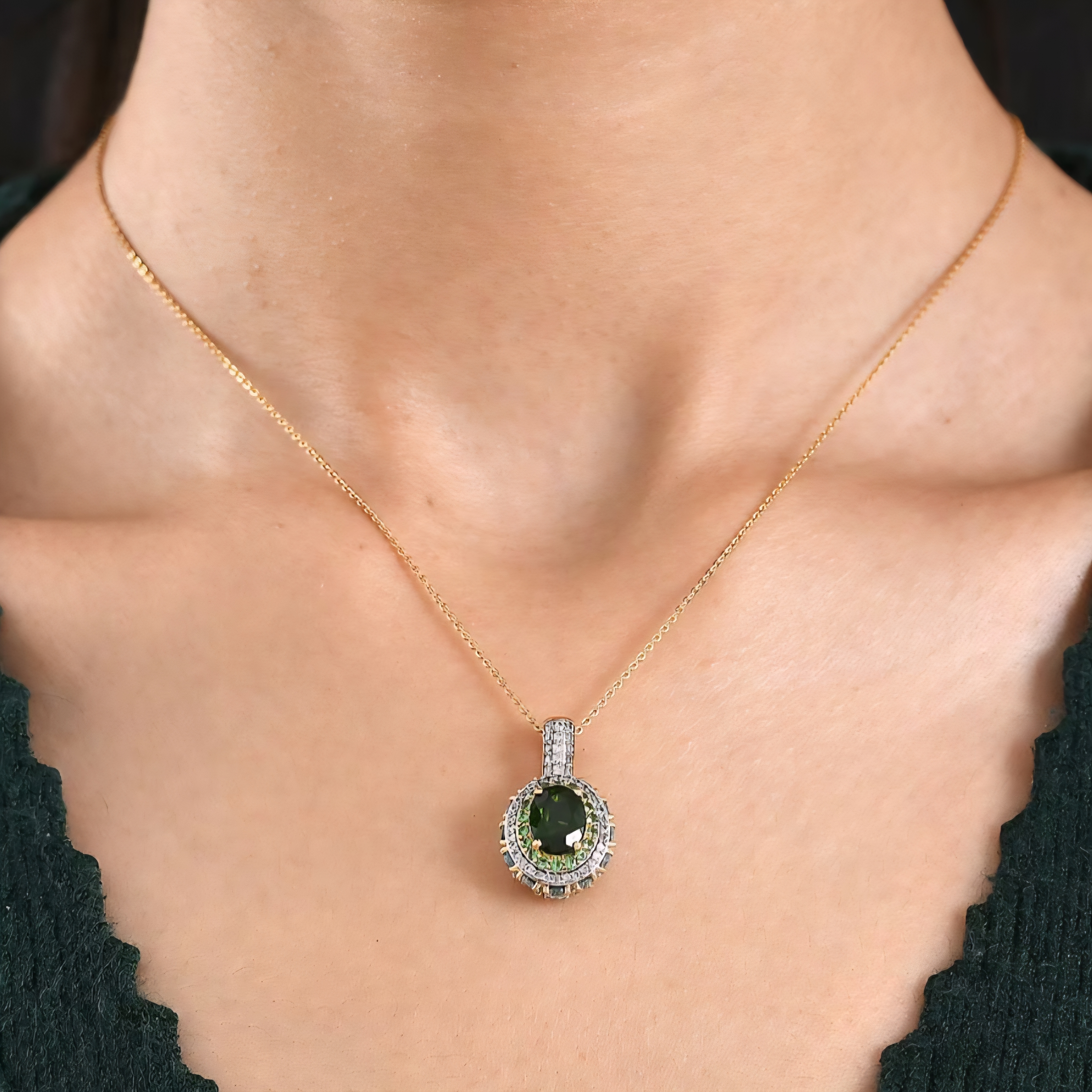 This pendant features a vivid oval chrome diopside measuring 9x7mm and weighing 1.89 carats. Known for its intense forest green color, chrome diopside delivers exceptional saturation and brilliance, creating a rich emerald-like glow at the center of the design.