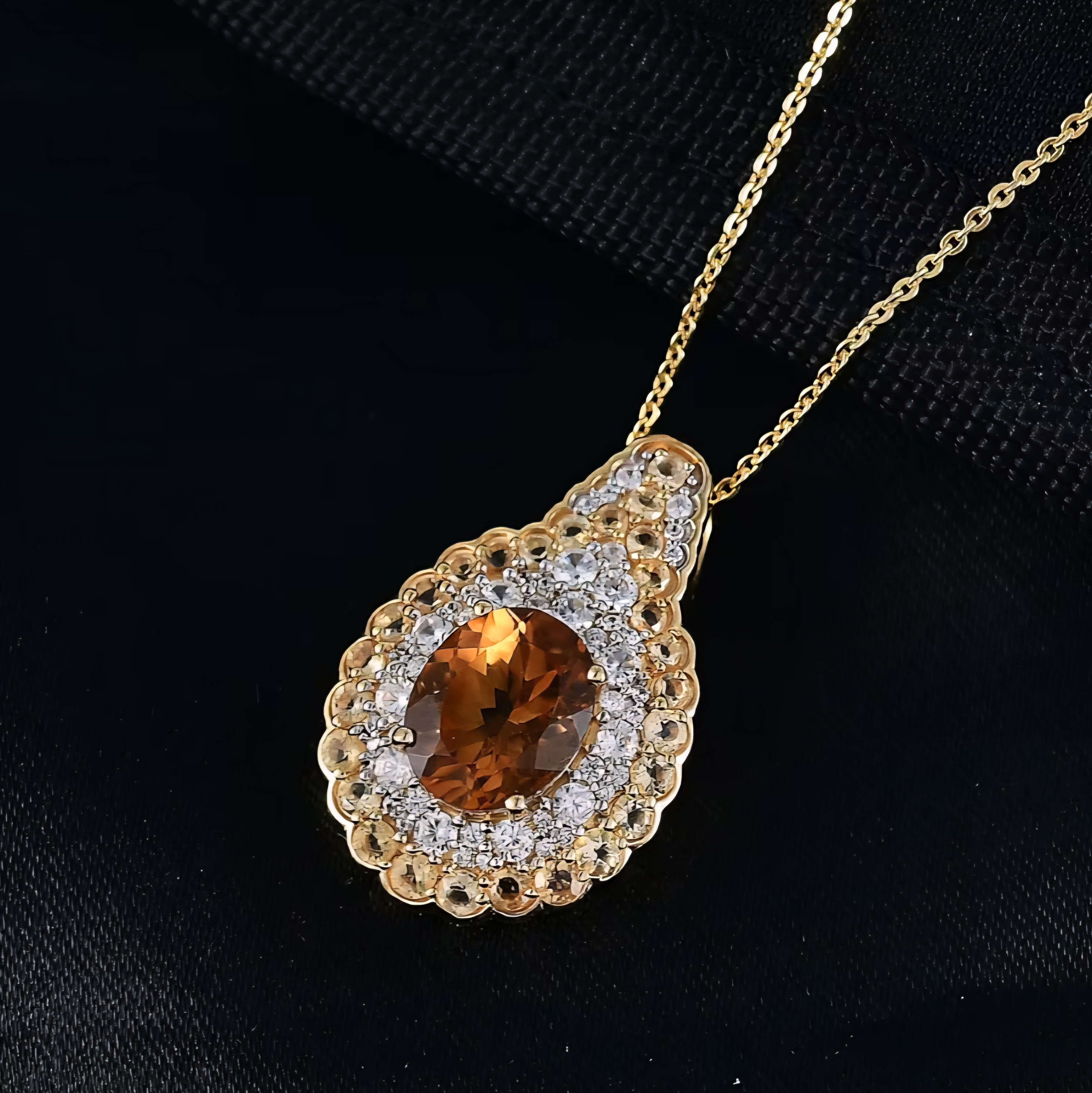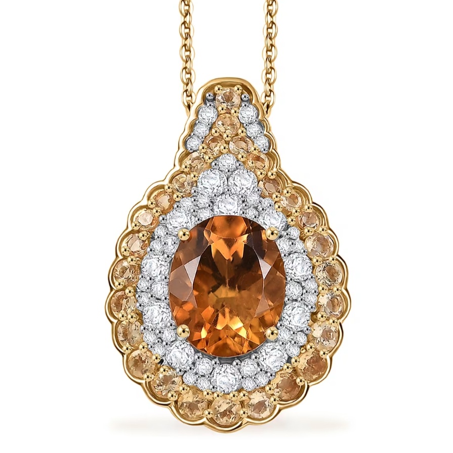 A 10x8mm oval citrine anchors the center with 2.29 carats of rich orange glow. It has that deep honey tone that makes citrine look warm, saturated, and alive under light. Around it, a full halo of white zircon delivers sharp, diamond like sparkle. Then a second outer halo of matching citrine rounds amplifies the warmth and size, creating a layered, high impact design that feels bold and intentional.