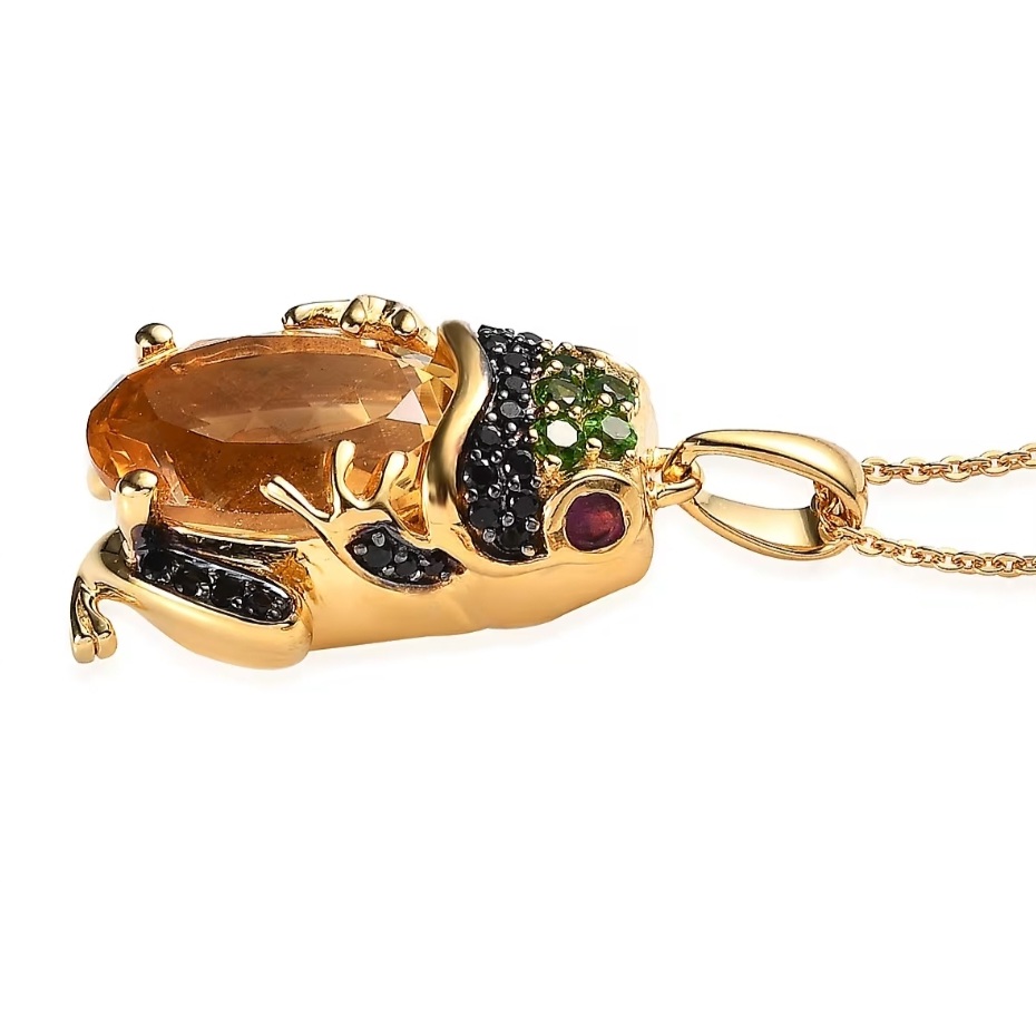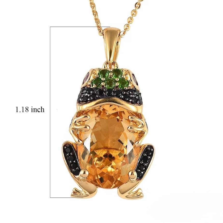 The detailing makes this piece stand out. Chrome Diopside accents add bursts of vivid green along the frog’s forehead, while black Spinel stones highlight the arms and legs with crisp, dark contrast. The frog’s eyes are set with red Garnets, giving the design expressive warmth and a striking pop of color that brings the creature to life.