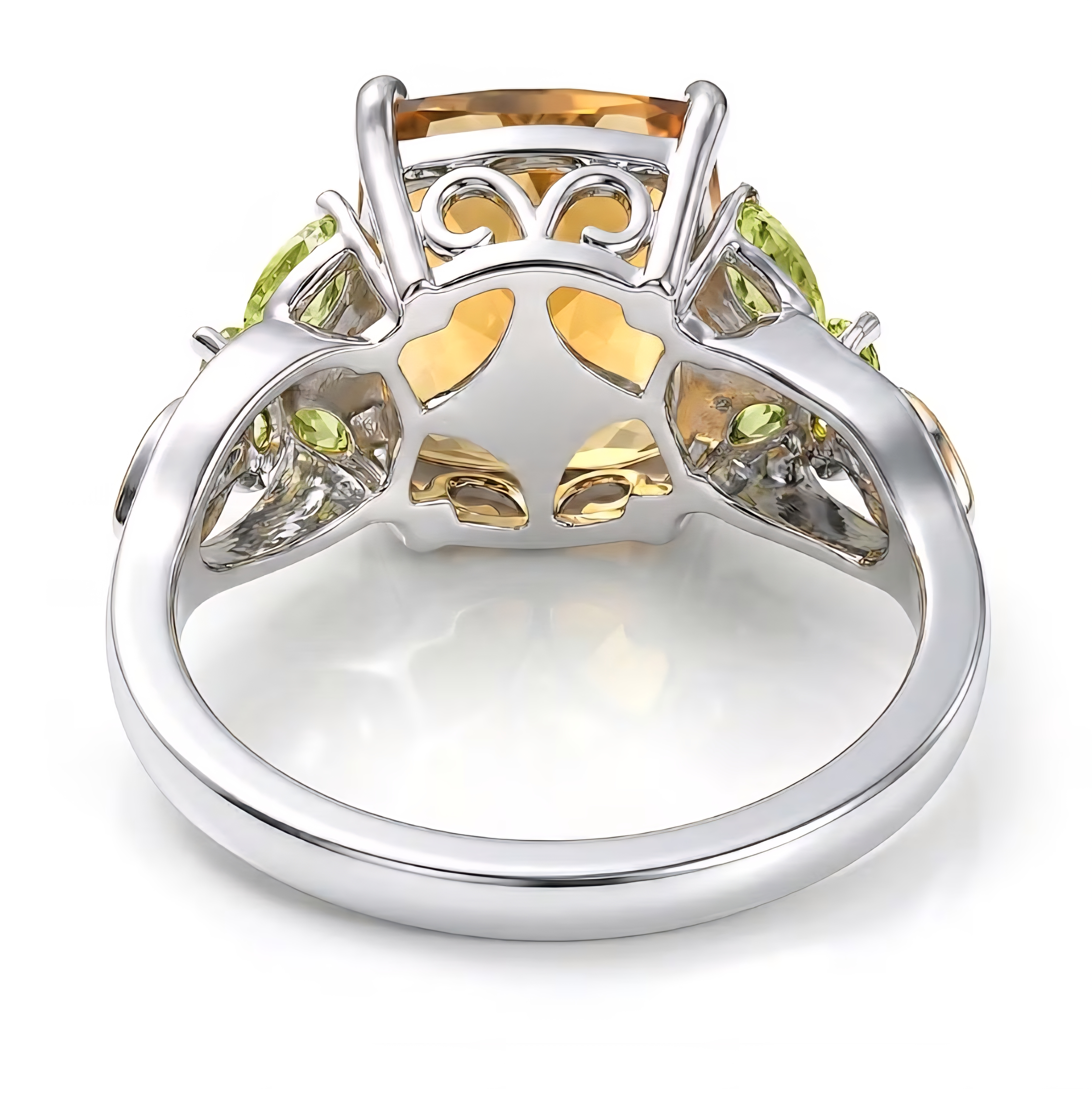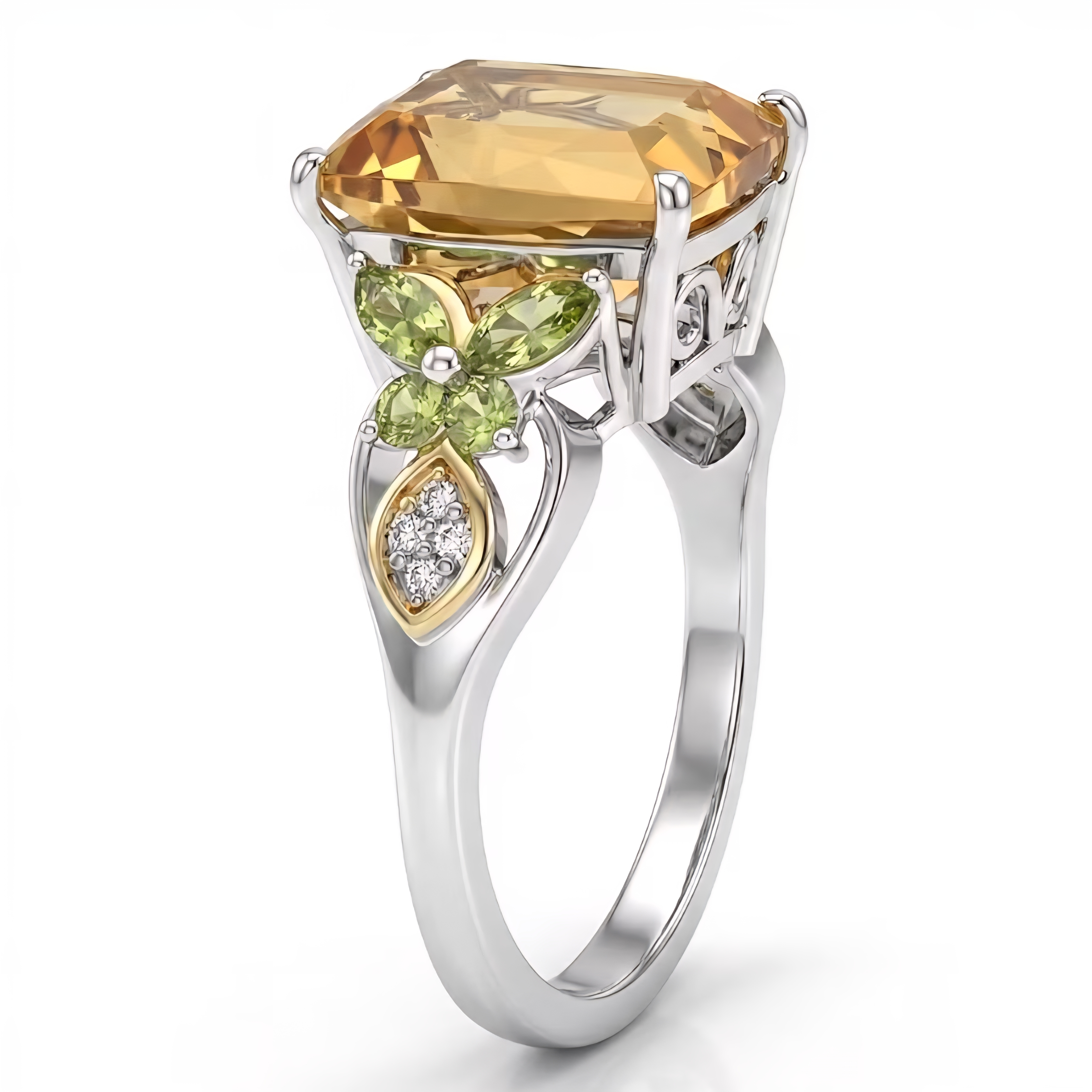 On each side, marquise and round peridot form delicate wings. Small white zircon accents add a crisp flash of brilliance, giving the entire design lift and sparkle without overpowering.