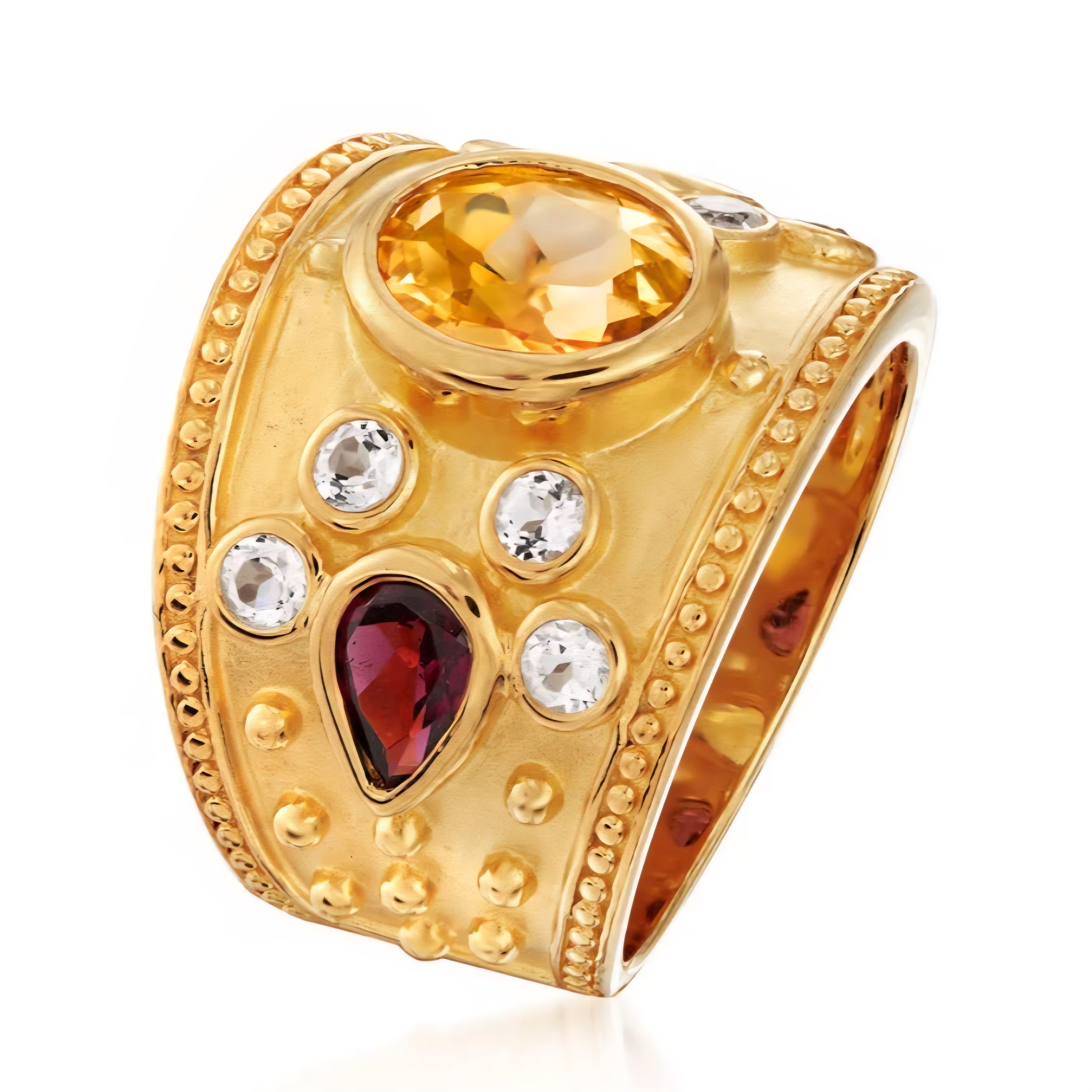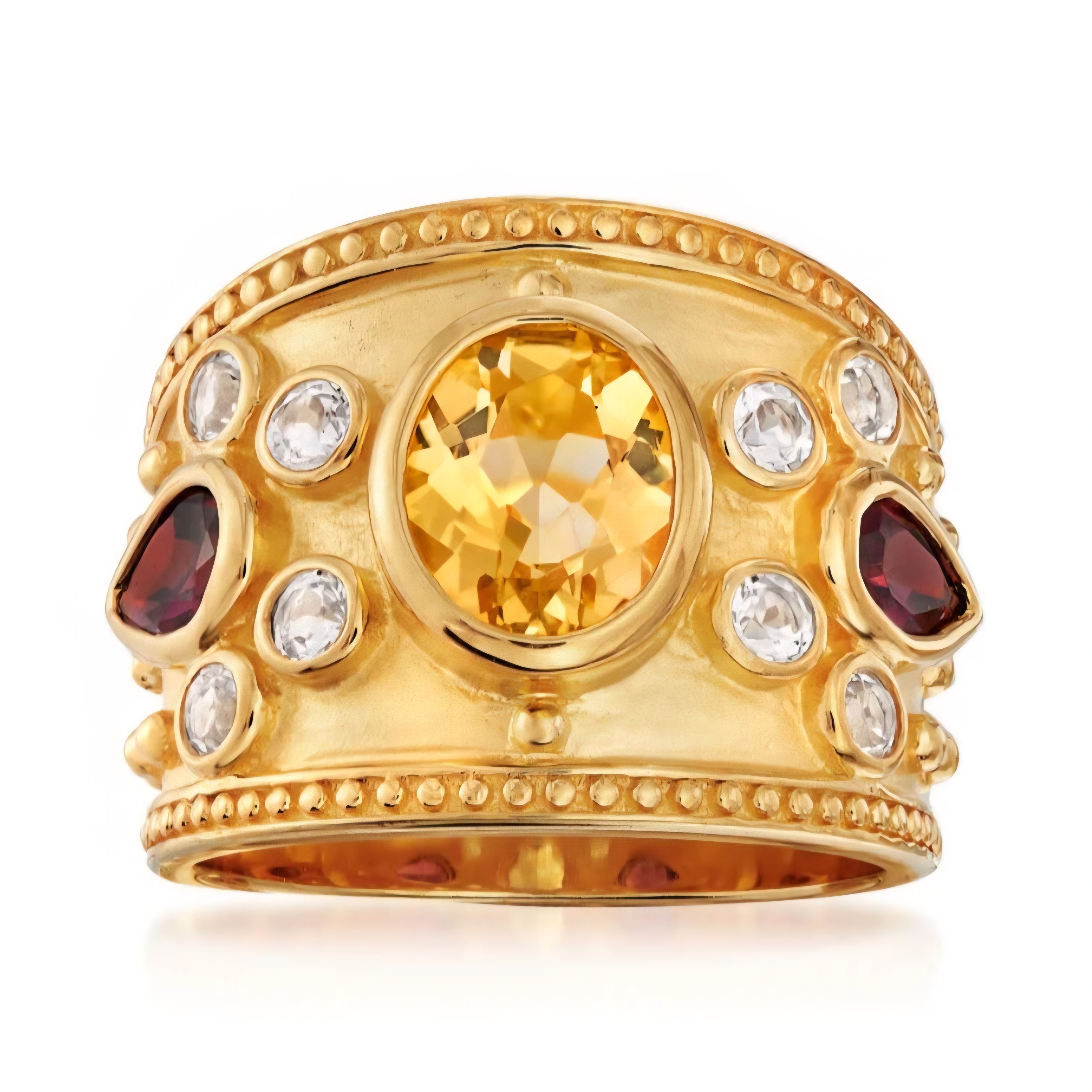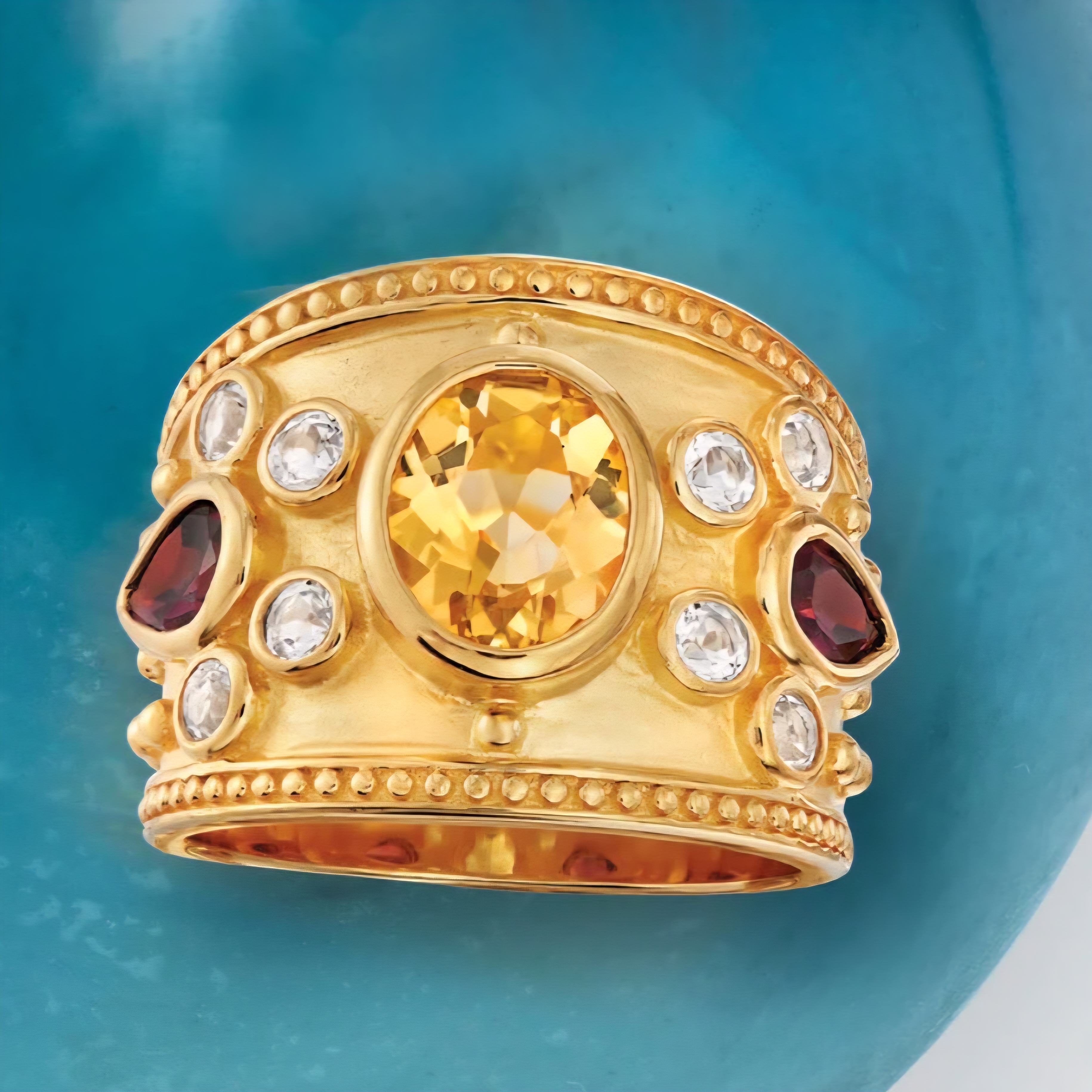 The wide band design, finished in 18K yellow gold plating over solid 925 sterling silver, gives the ring strong presence and a structured silhouette. Beaded detailing along the edges reinforces the bold profile while maintaining refinement. This is a statement ring with confident proportions and vibrant gemstone contrast, designed for someone who appreciates color done with intention.
