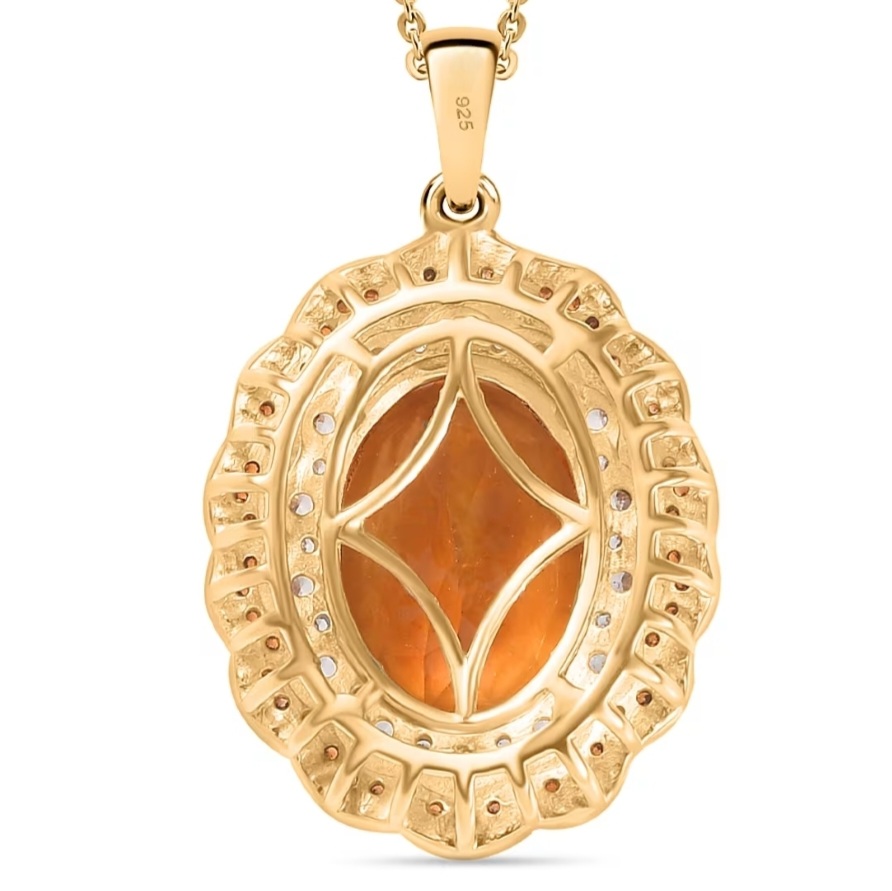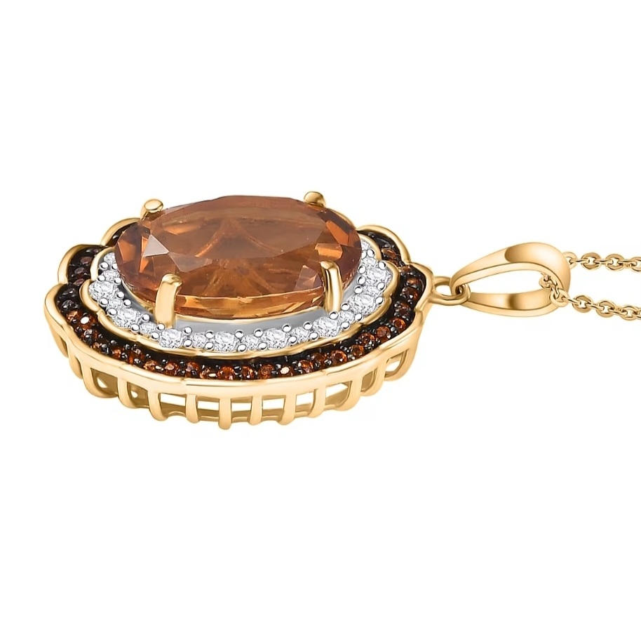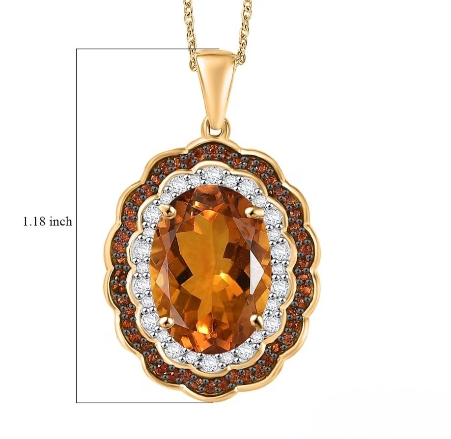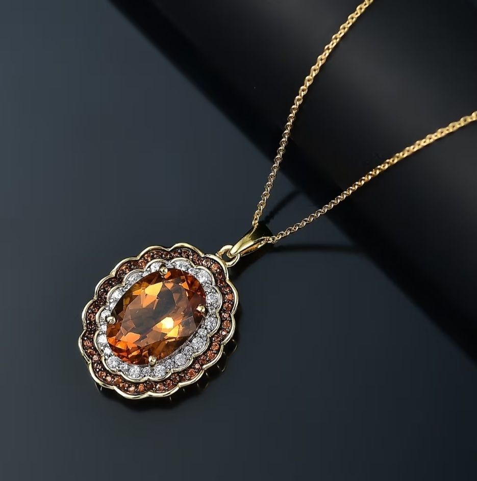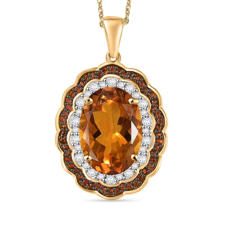 A statement of warmth and fire. This pendant showcases a 5.53 ct Madeira Citrine — an oval-cut gem known for its rich, honeyed orange hue — surrounded by a double halo of brown and white zircon. The scalloped outer frame gives a vintage-inspired silhouette, while the white zircon inner halo adds sparkle and definition.