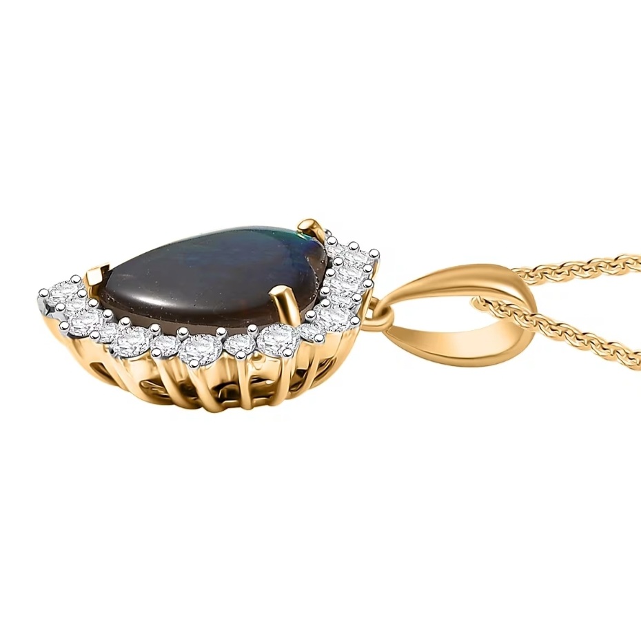 A surrounding halo of Moissanite adds bright, crisp contrast, framing the Ammolite with clean white fire. Rhodium-tipped prongs sharpen the brilliance, while the warm 18k yellow gold finish enriches the gemstone’s natural color play. The balance of vibrant color and refined sparkle gives the pendant a modern, radiant presence.