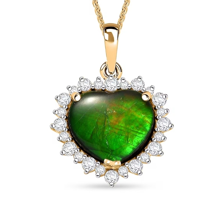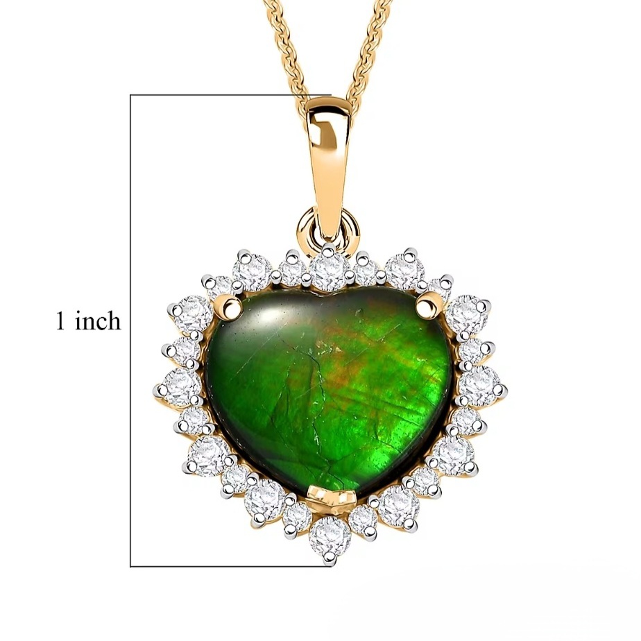 This pendant showcases the rare, shifting color of Canadian Ammolite in a bold 12mm heart cabochon. The gemstone glows with layered flashes of green, red, gold, and blue—those signature organic color waves that make Ammolite unlike anything else in fine jewelry. Its polished surface brings out depth and movement as the pendant shifts in the light.