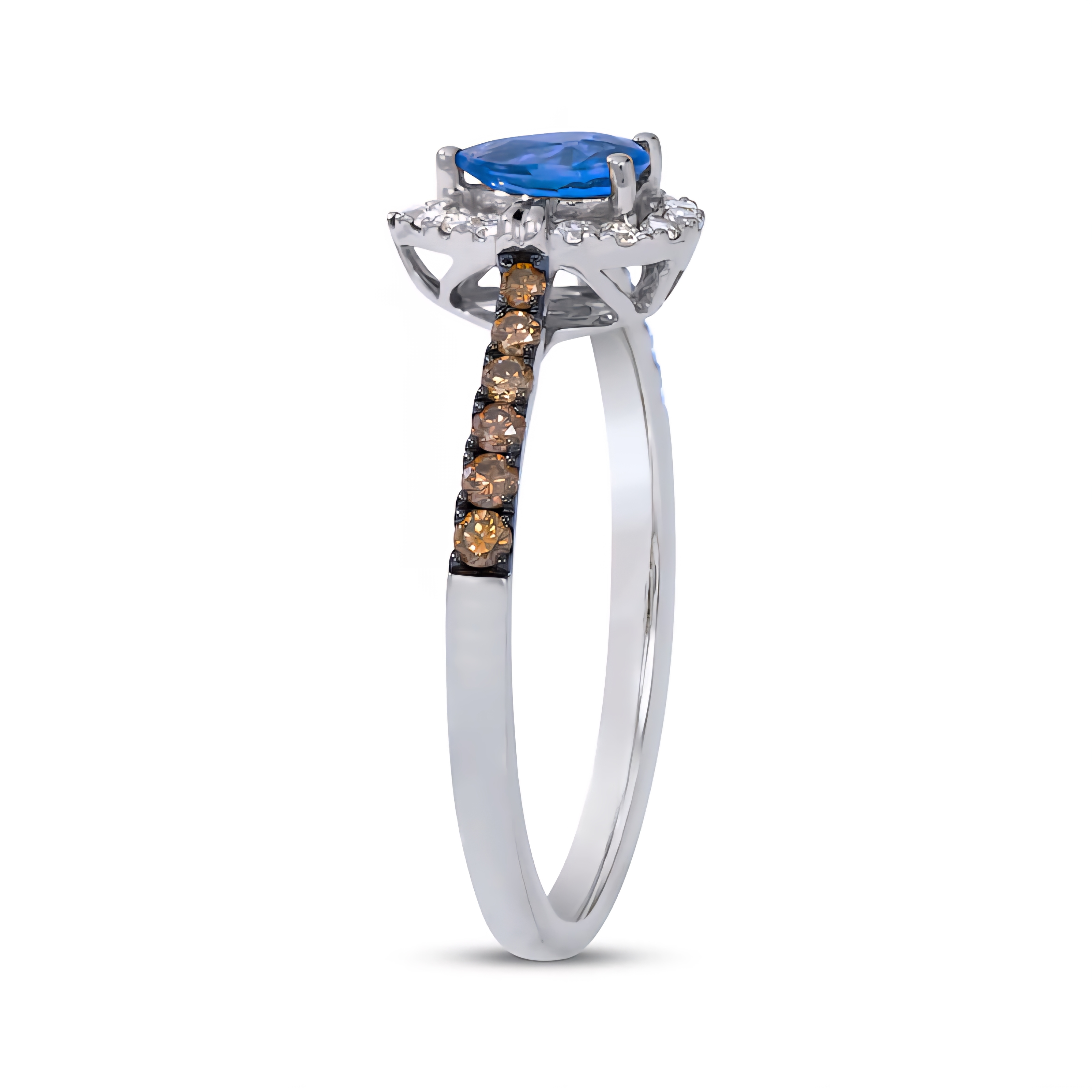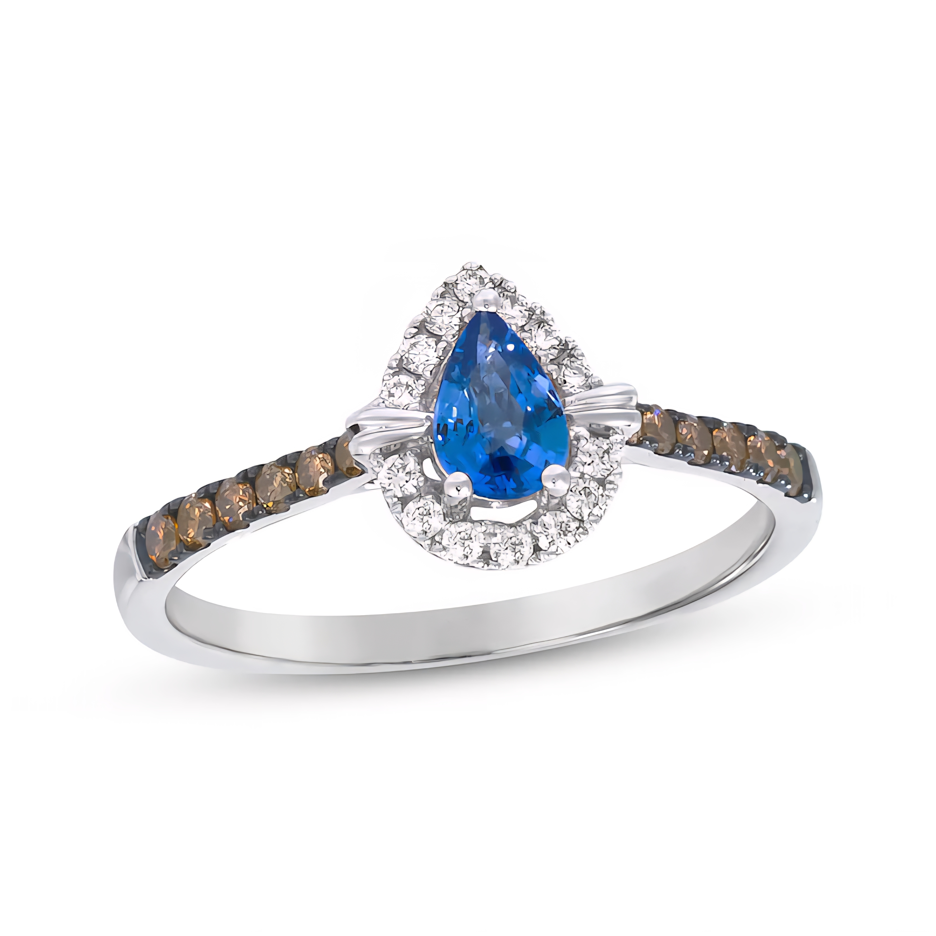 This dainty halo ring features a 0.60ct pear-shaped sapphire in a vivid blue, wrapped in a sparkling halo of white diamonds. Additional white and brown diamond accents add depth and contrast along the shoulders, elevating the design with refined detail. Set in solid 14K white gold with black rhodium finish, the piece balances subtle elegance with radiant color. At 0.85ctw, this petite yet luxurious ring is the perfect blend of charm, craftsmanship, and everyday sophistication.