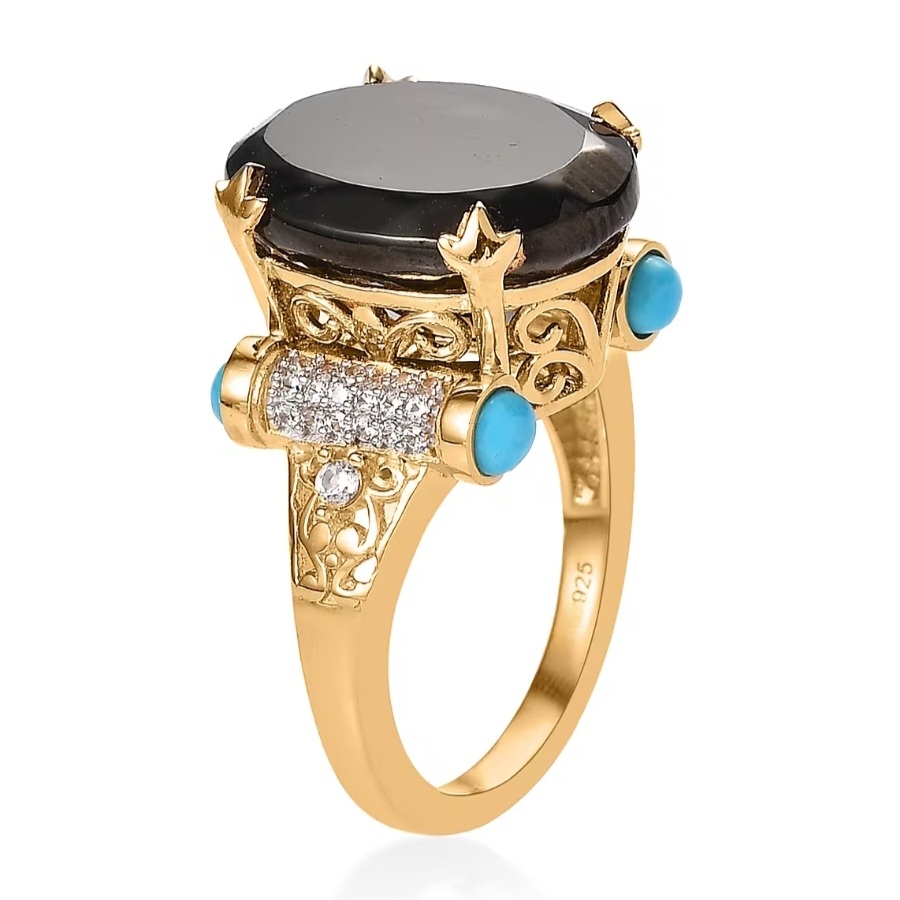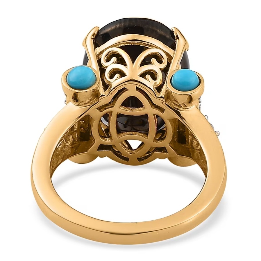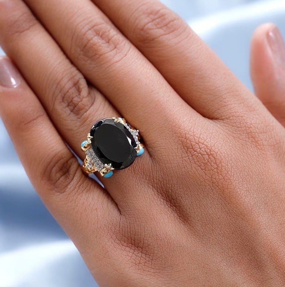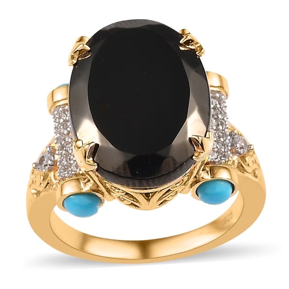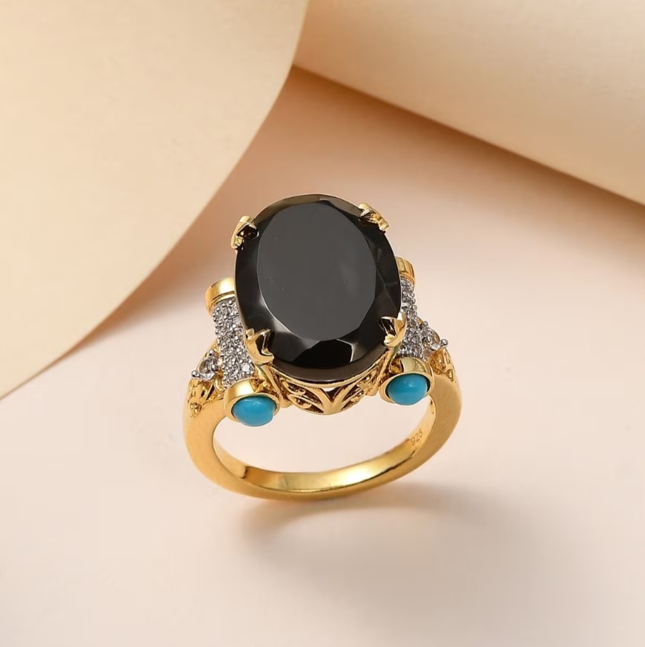 This statement ring centers on a commanding 16x12mm faceted Elite Shungite weighing 4.70 carats. The deep carbon-black oval rises from an ornate crown gallery framed with filigree detailing and sculpted prongs finished in 18k yellow gold vermeil.